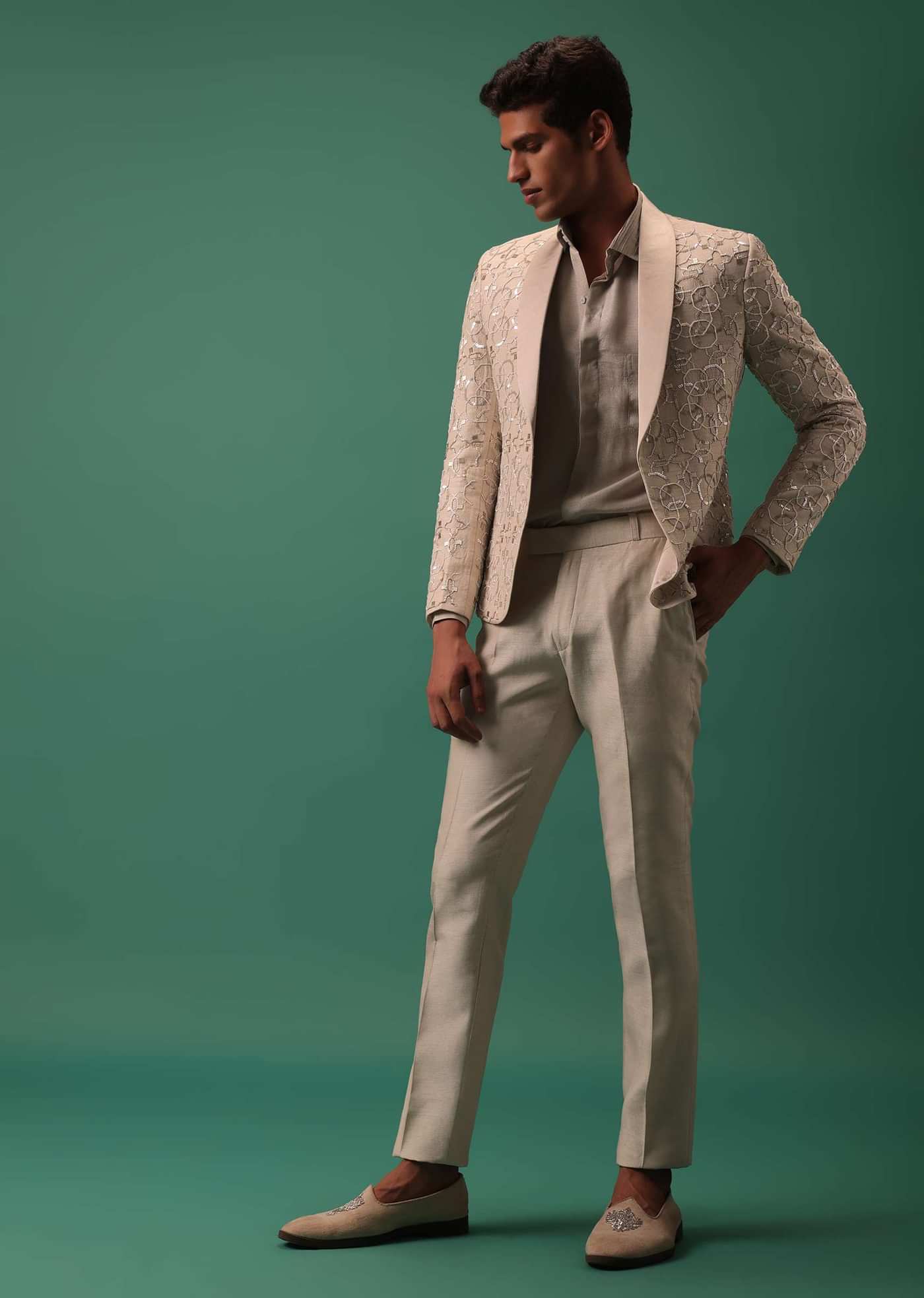 Off White Heavy Hand Embroidered Tuxedo Suit In Dola Silk