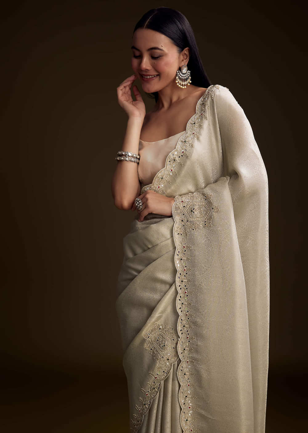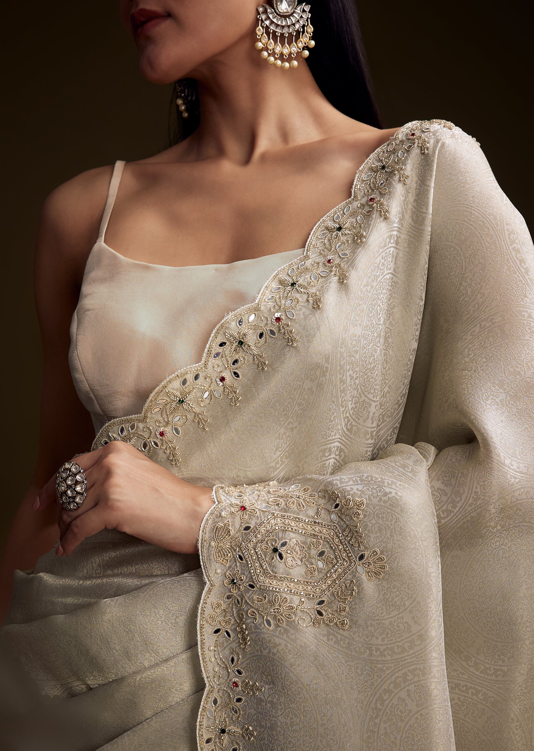 Off White Jacquard Saree With Zardosi And Stone Embroidery