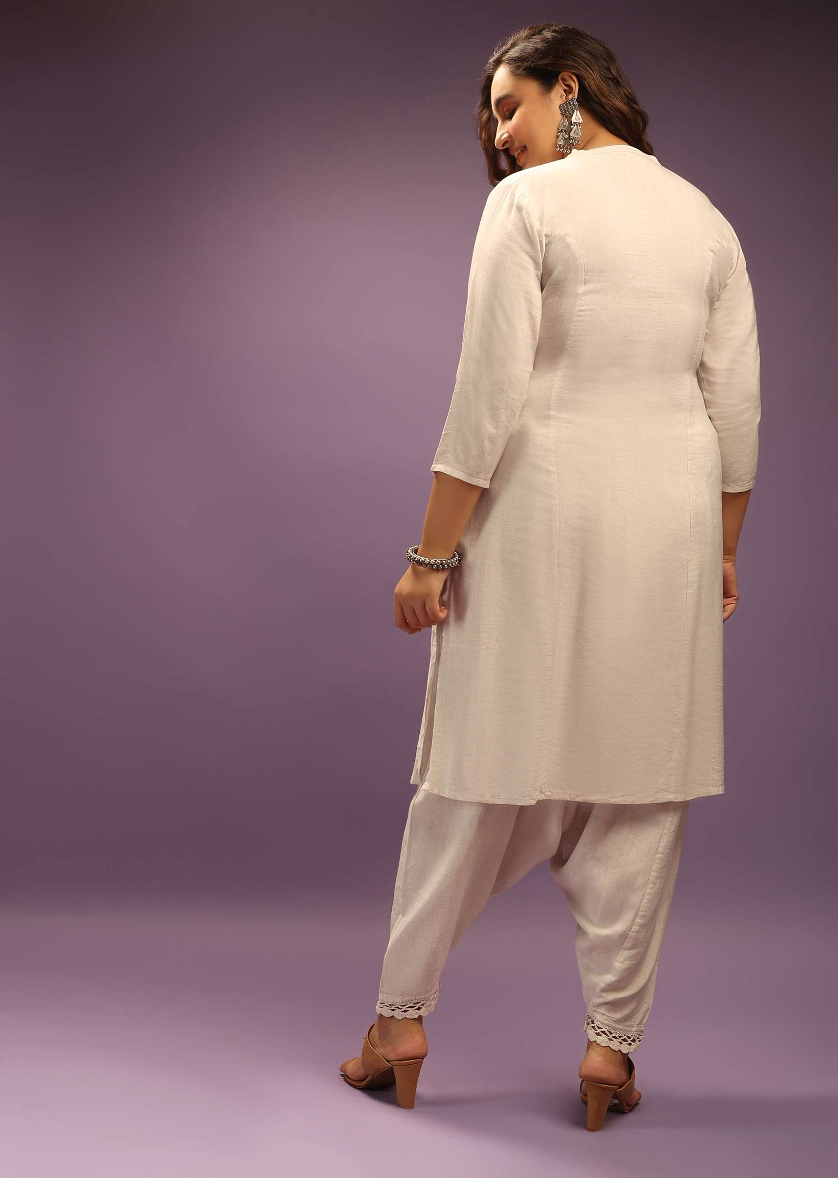 Off white kurta set in linen with matching low crotch cowl pants.The kurta is designed with 3/4 sleeves and mandarin collar neckline with front button closure.The pants are trimmed with... More Product Details