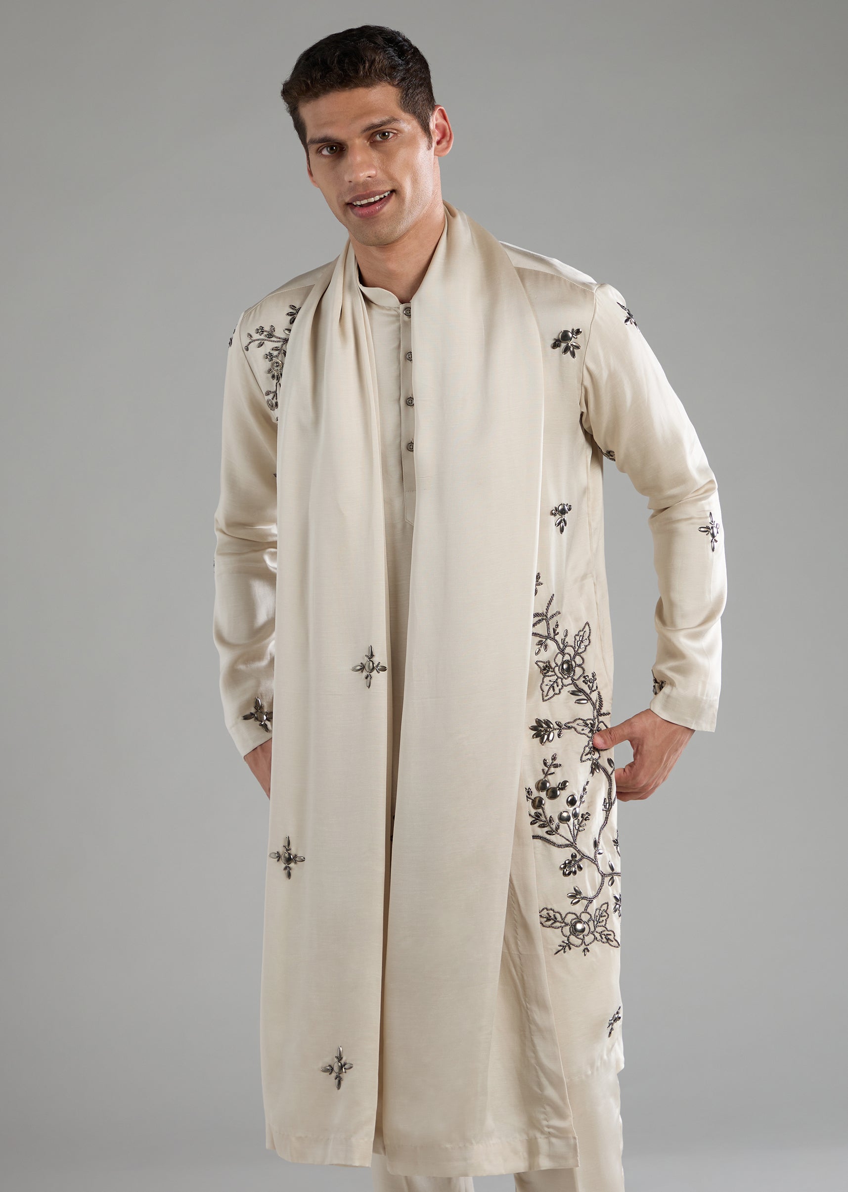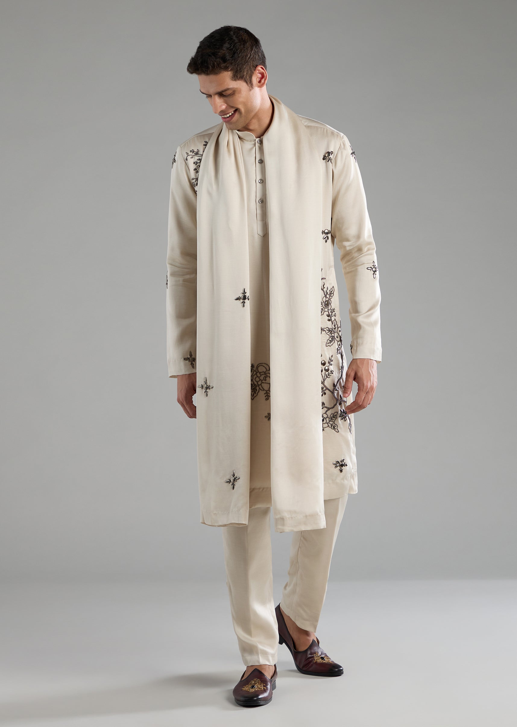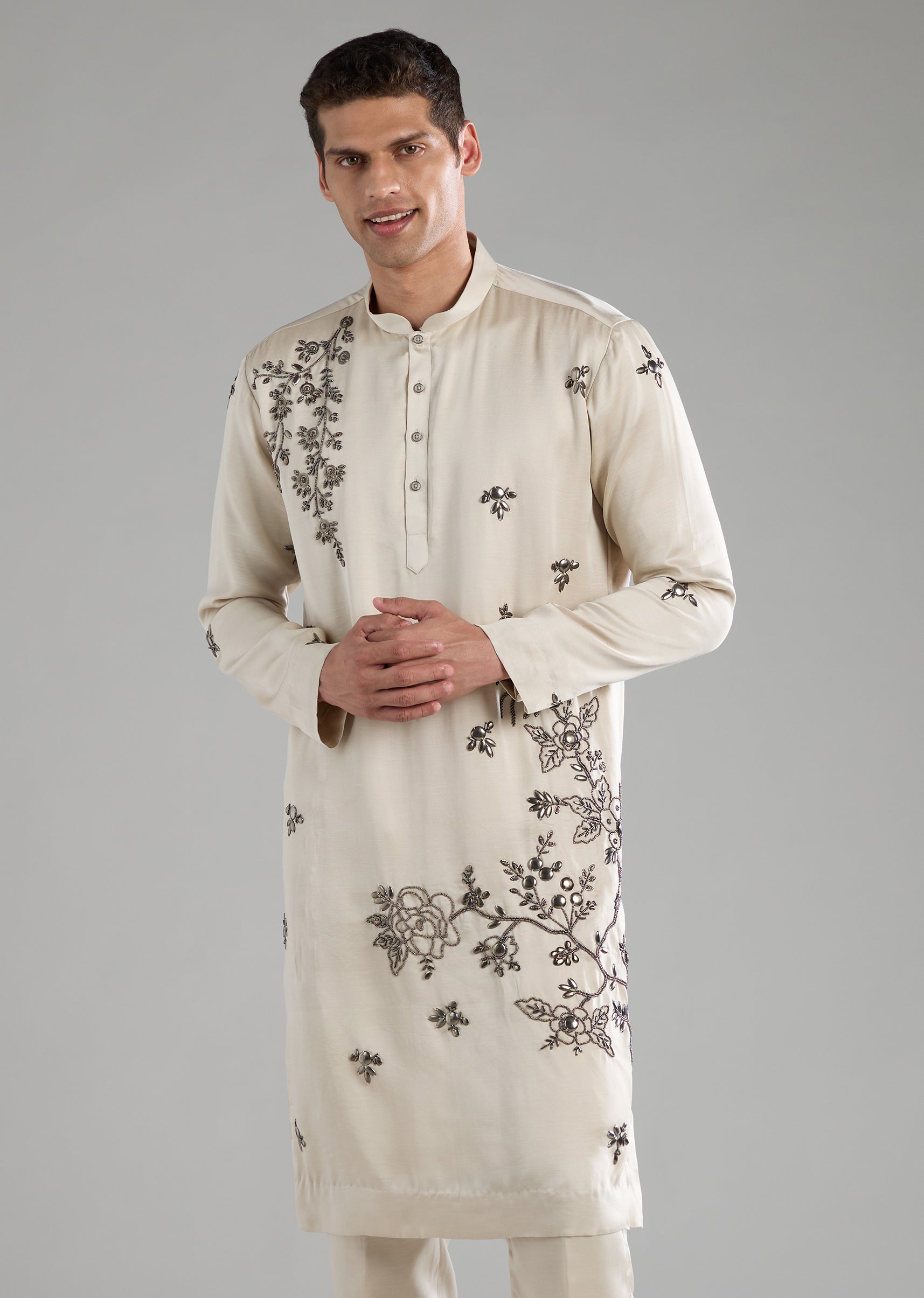 Off White Linen Blend Thread Embroidered Mens Kurta Set