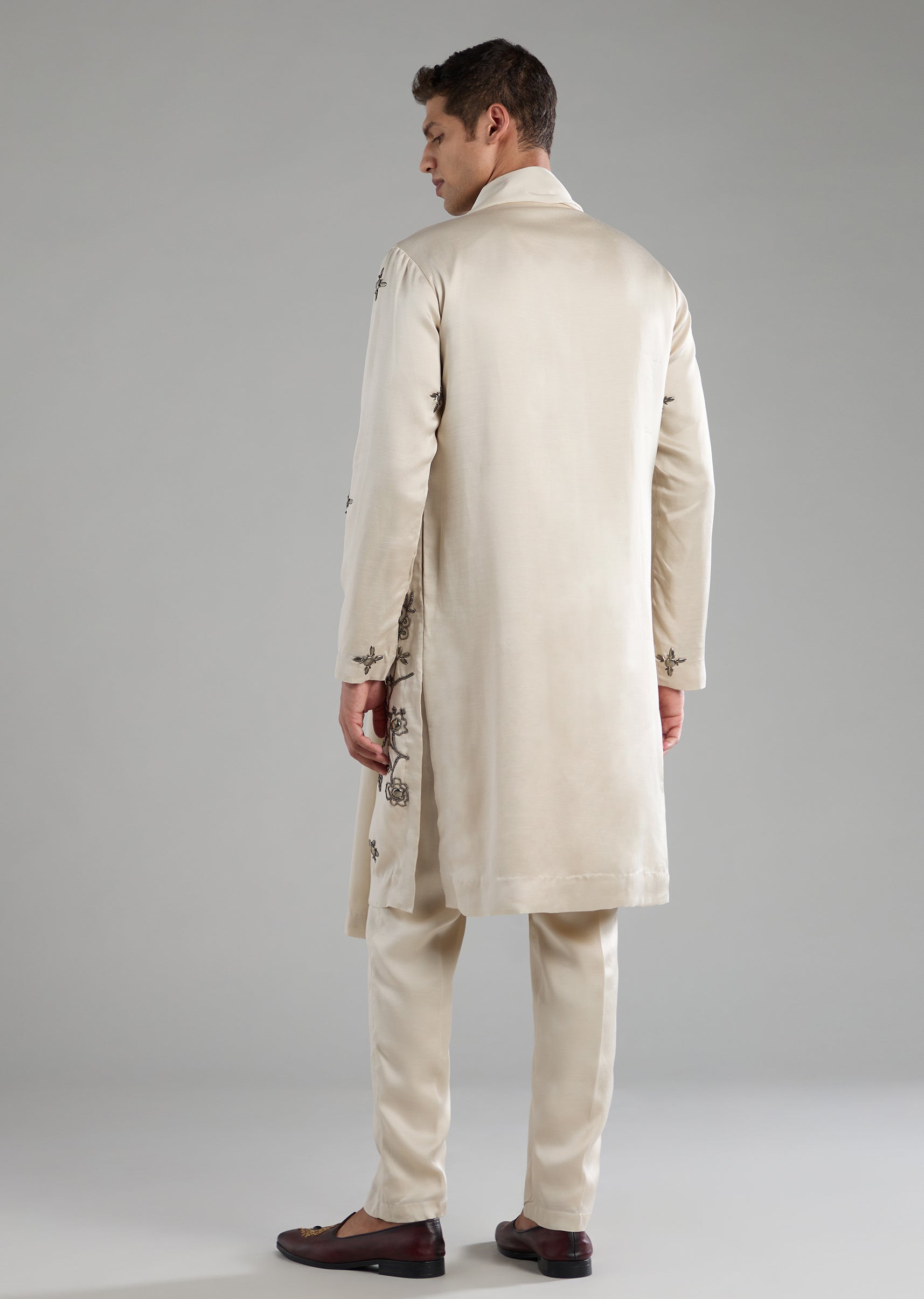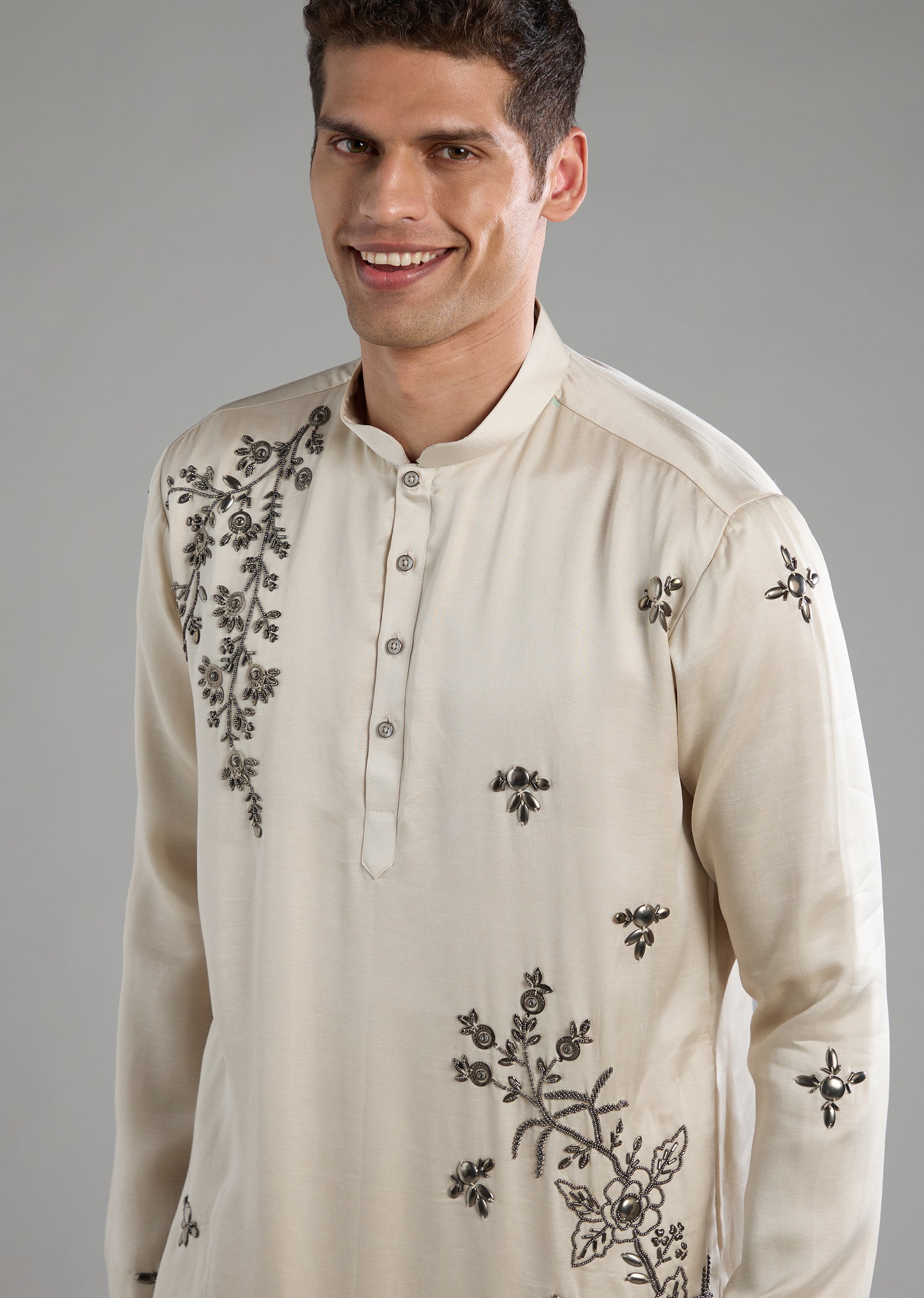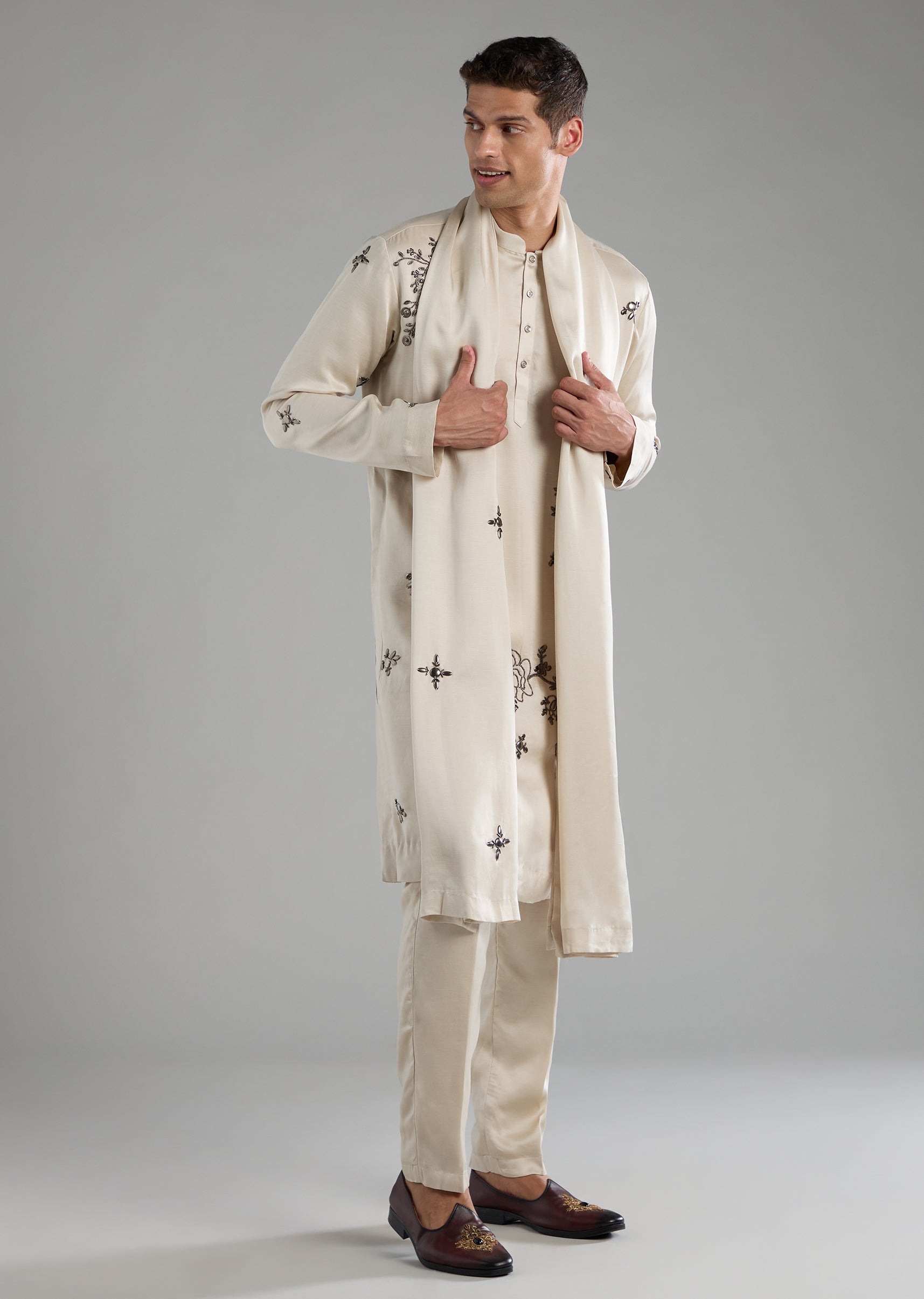 Off White Linen Blend Thread Embroidered Mens Kurta Set