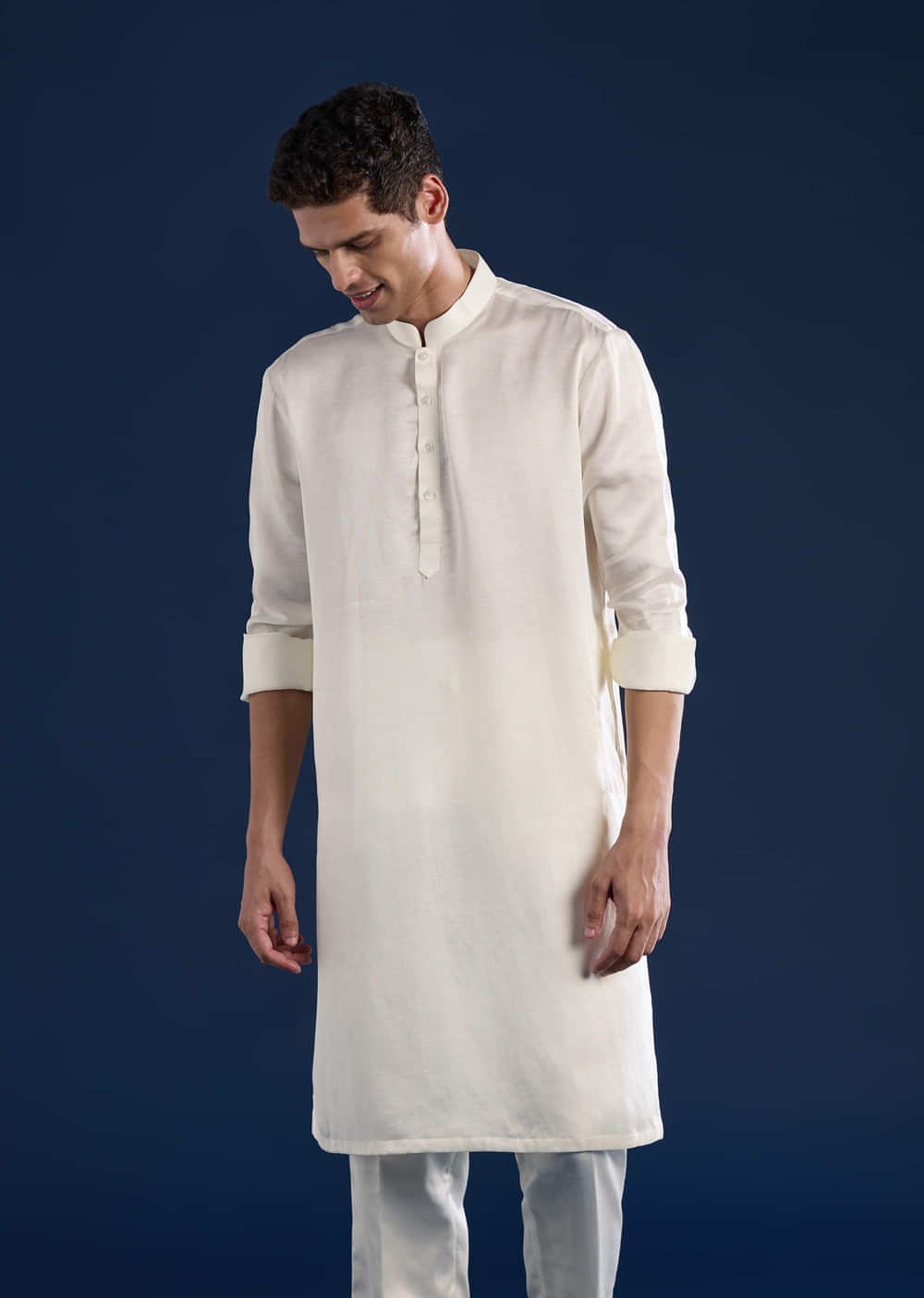 Off White Linen Satin Silk Jacket Kurta Set with Gotta Work