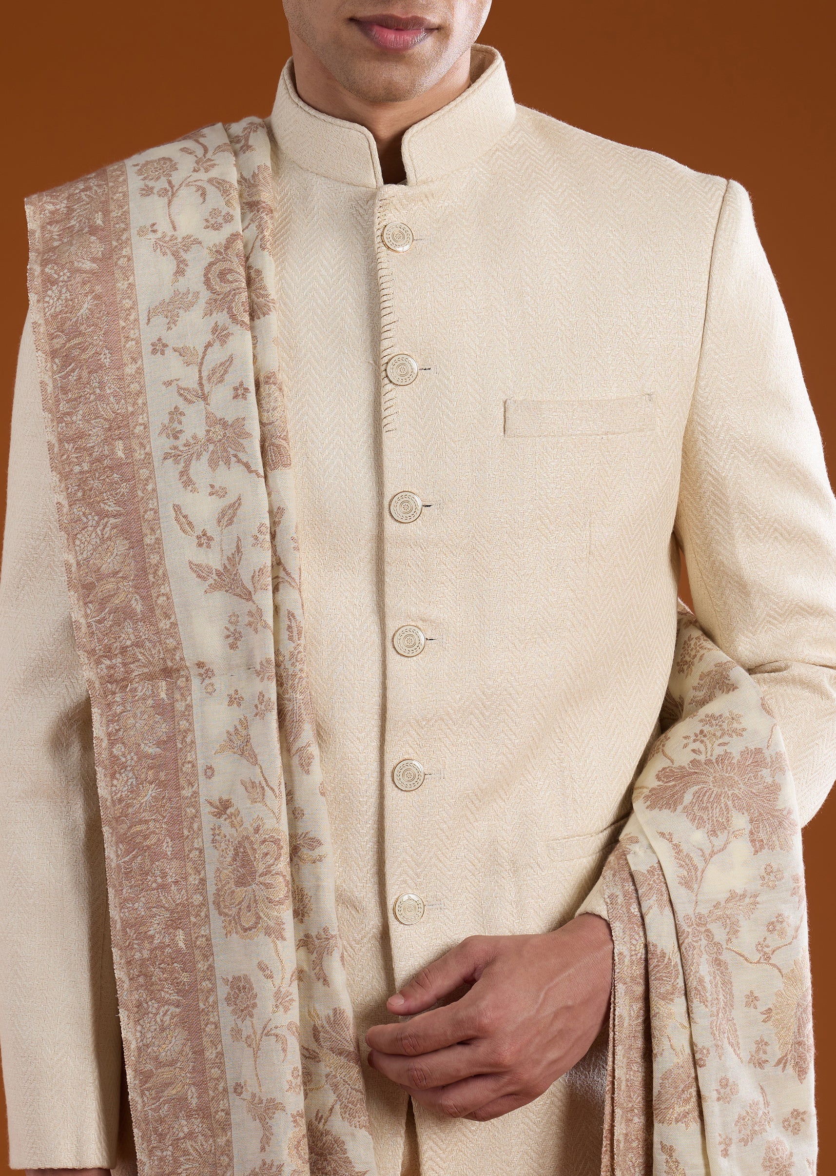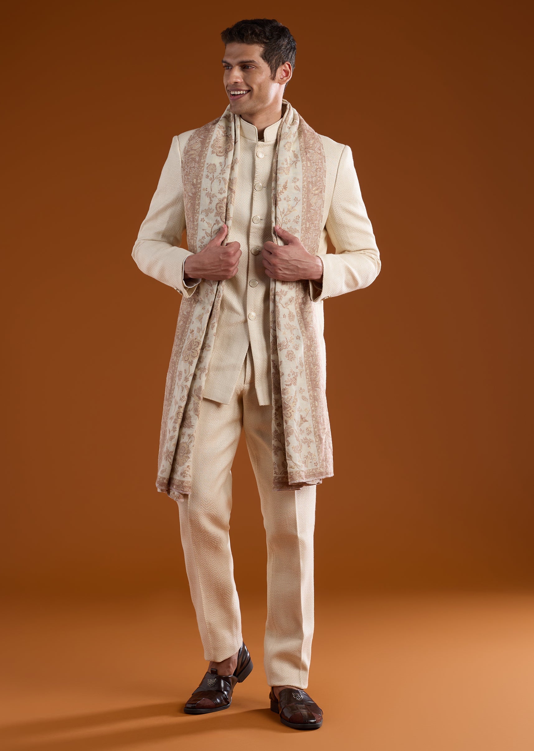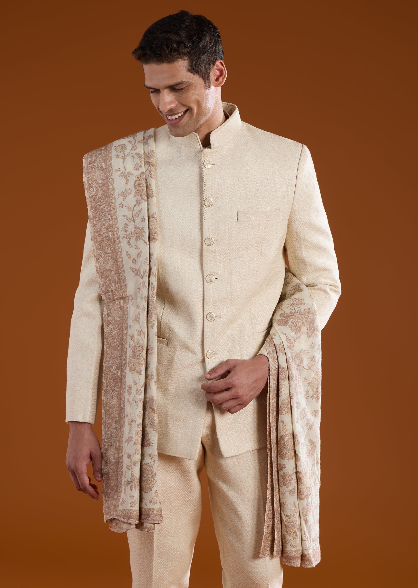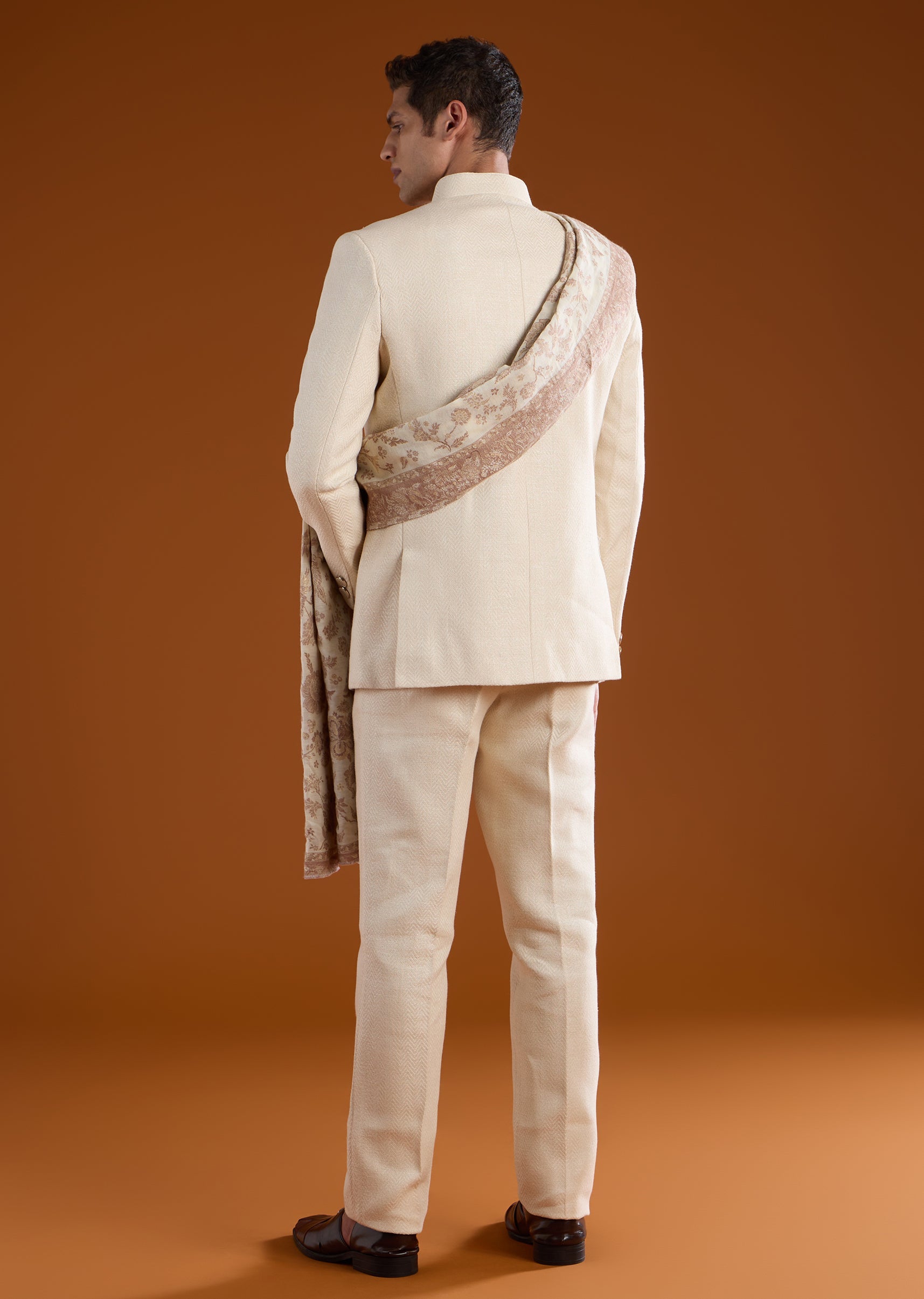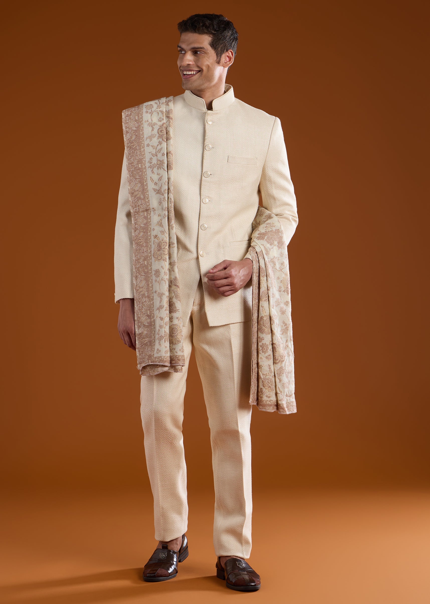 Classic and dignified, this matka silk jodhpuri set reflects timeless traditional elegance. Crafted in textured matka silk, the outfit features full sleeves and a mandarin collar that give it a sharp, regal presence. The addition of a matching dupatta enhances its ceremonial appeal, making the silhouette feel complete and refined. Paired with coordinated pants, this ensemble is ideal for weddings, festive rituals, and formal cultural occasions.Awarded as the Most Trusted Brand, we're delivering styles you love, just as promised.