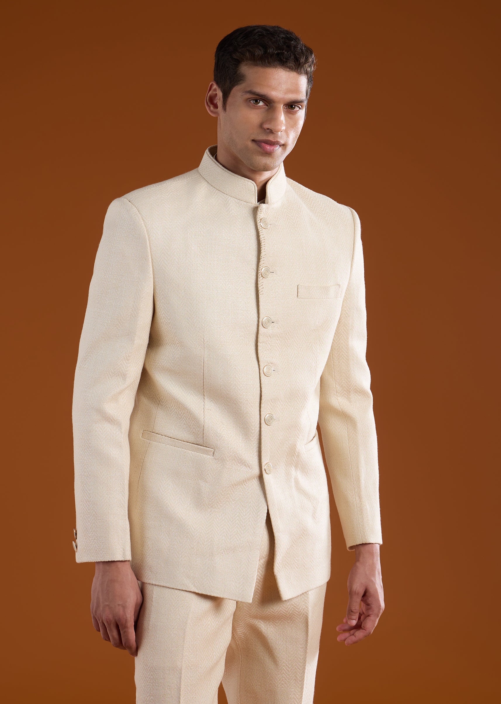 Classic and dignified, this matka silk jodhpuri set reflects timeless traditional elegance. Crafted in textured matka silk, the outfit features full sleeves and a mandarin collar that give it a... More Product Details