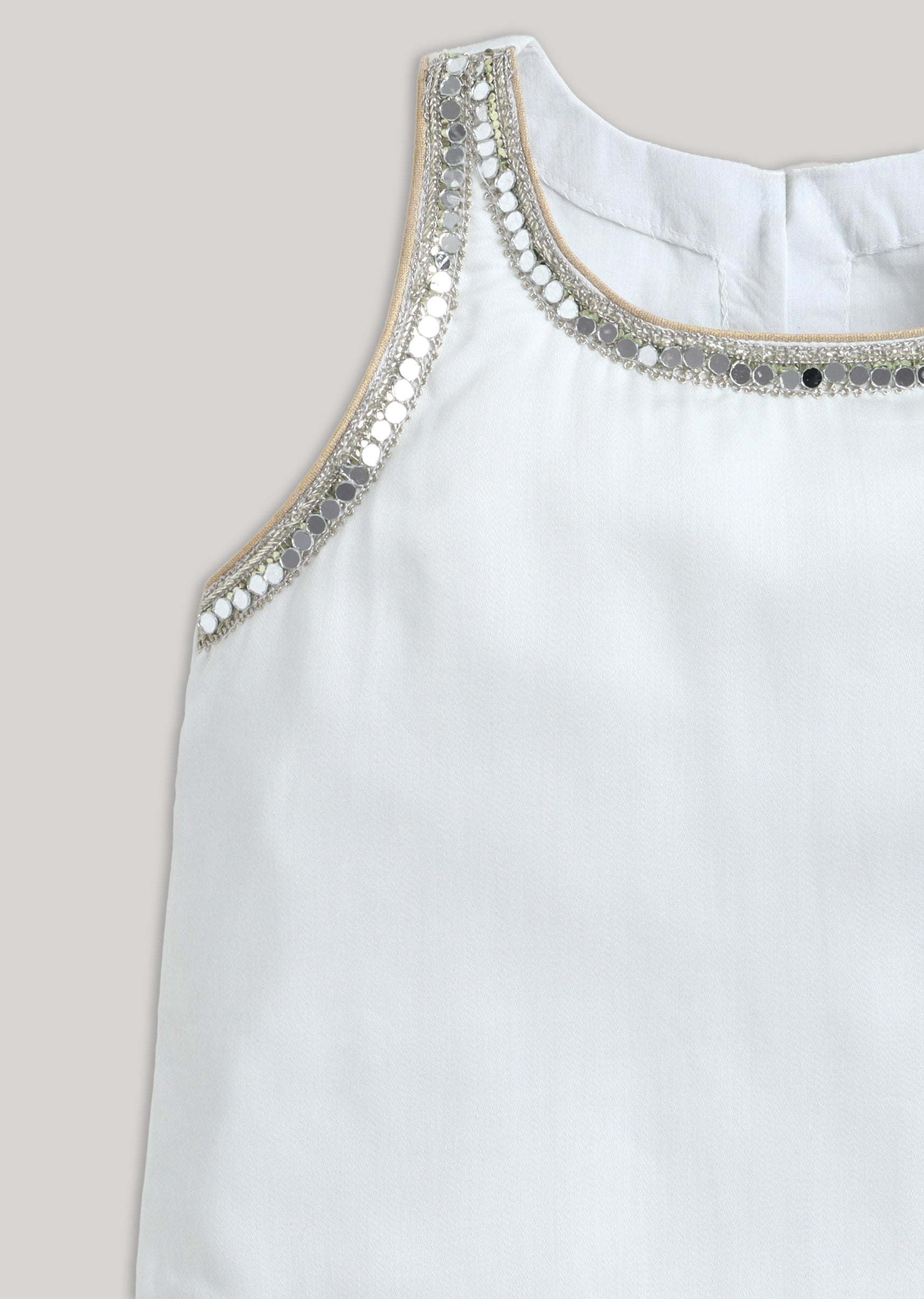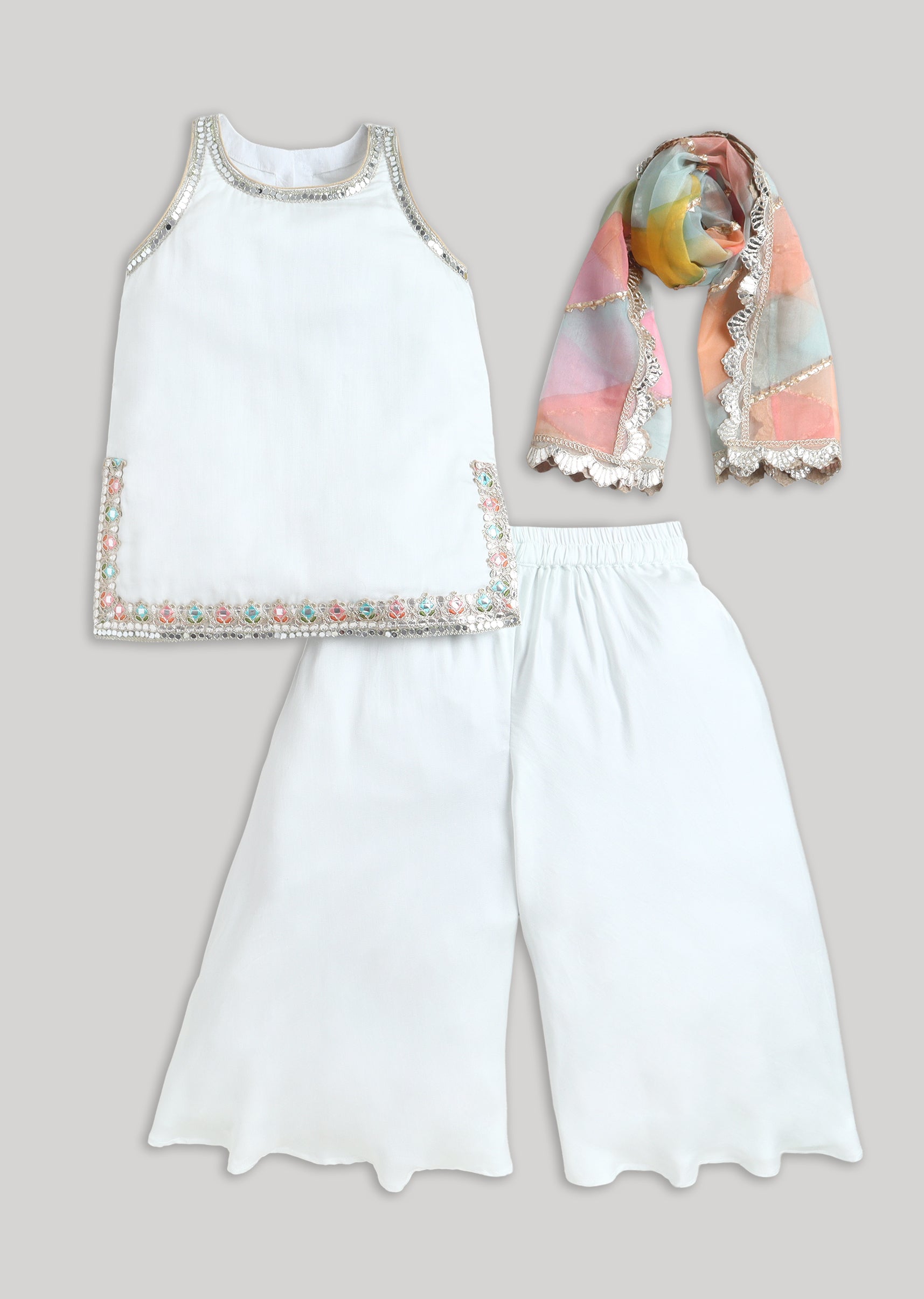 This girl’s salwar kameez set comes in a soft off-white base with multicolour accents that feel fresh and celebration-ready. Crafted in breathable muslin, it’s light on the skin and easy for kids to move around in through long functions. Mirror detailing adds just the right festive sparkle without looking heavy. Comes with a matching dupatta, making it a complete traditional outfit for weddings, family gatherings, and festivals. Awarded as the Most Trusted Brand, we're delivering styles you love, just as promised.