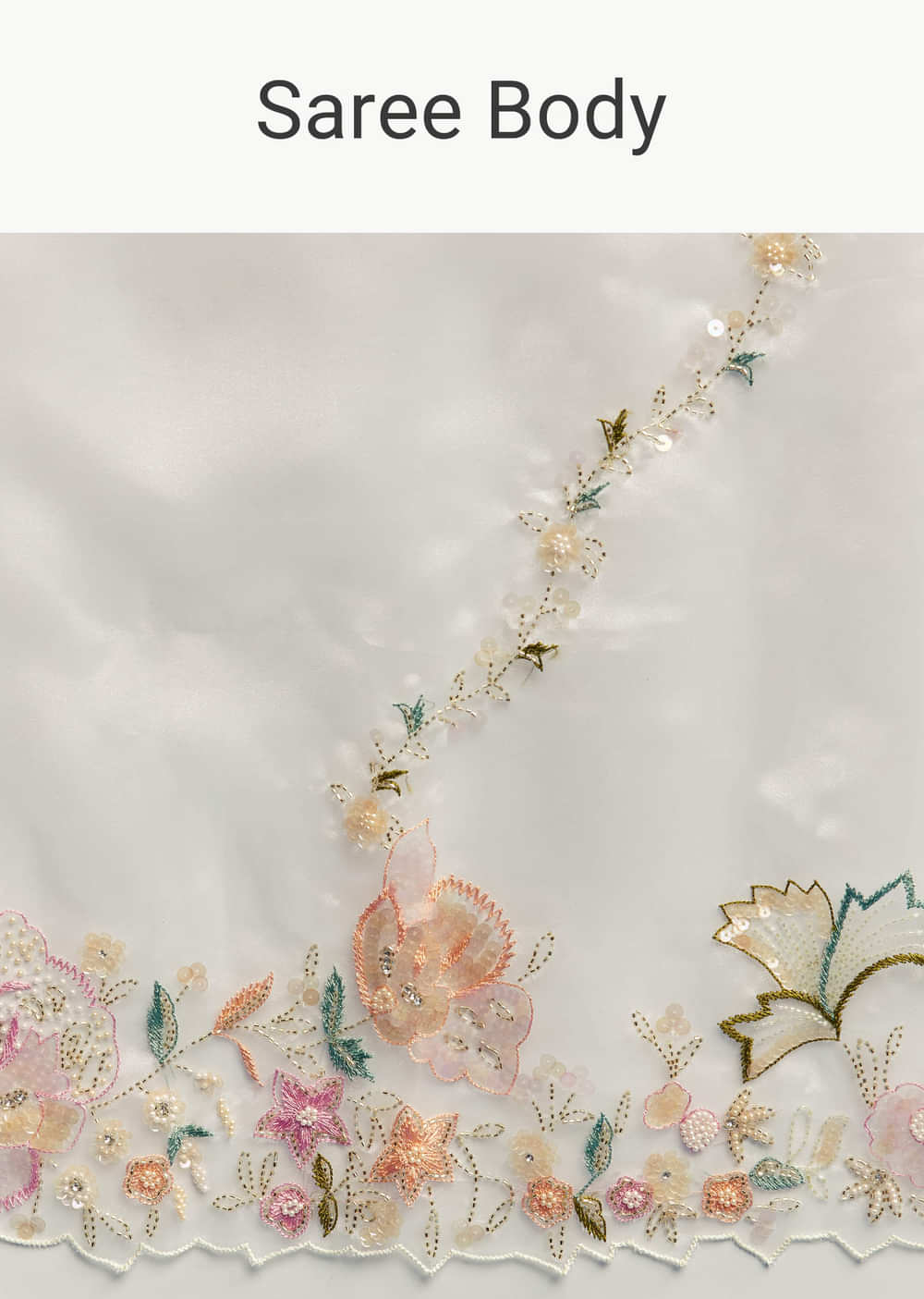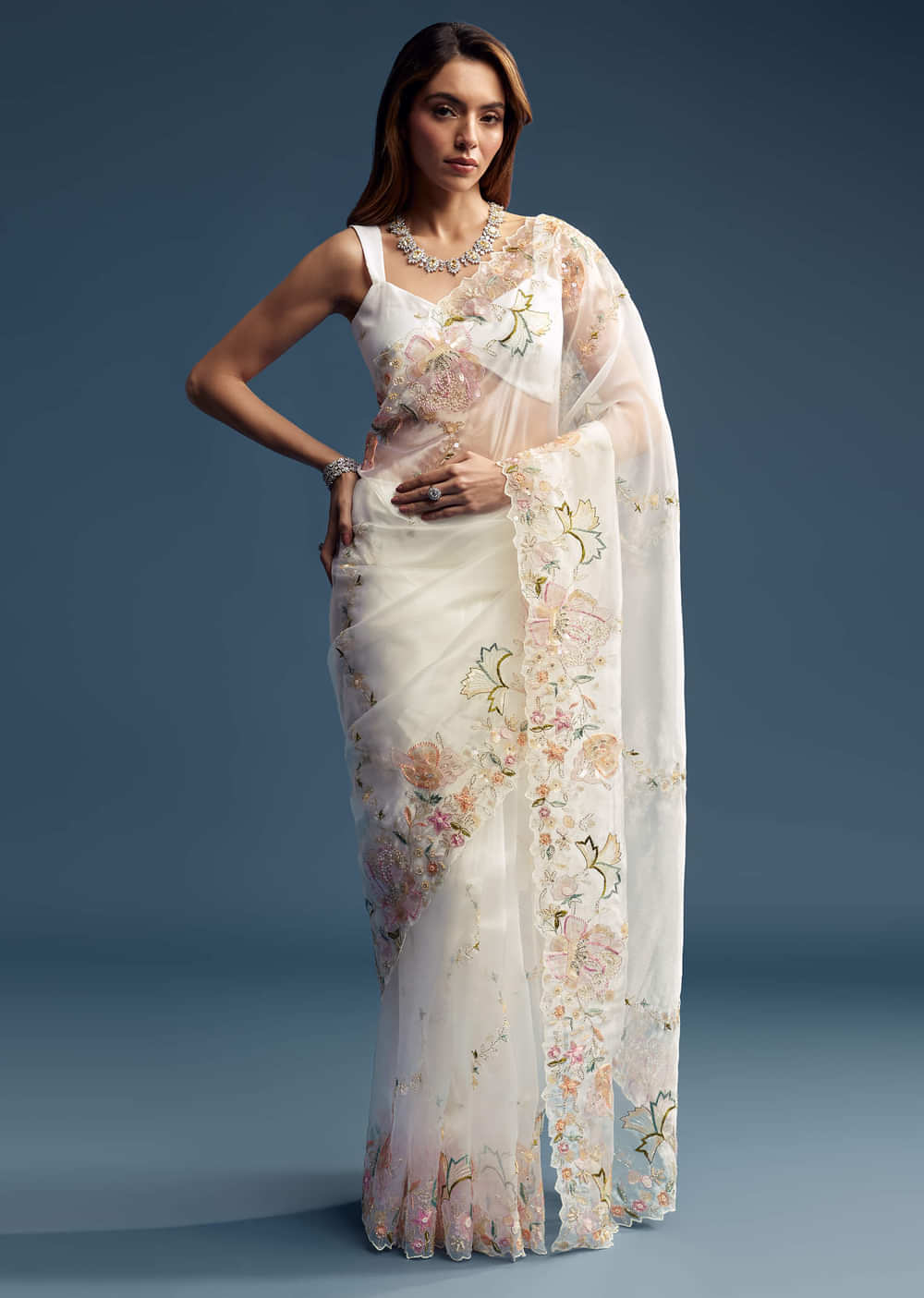 The off white paper tissue saree brings a breezy charm to festive dressing with its multicolored resham floral embroidery, accented by sequins, moti, and cutdana. The cutwork border adds textural contrast and gives every pleat a soft definition. It's light in hand but rich in detail, perfect for occasions that call for subtle glamour. Designed to glow gently under lights without stealing all the attention. Awarded as the Most Trusted Brand, we're delivering styles you love, just as promised.