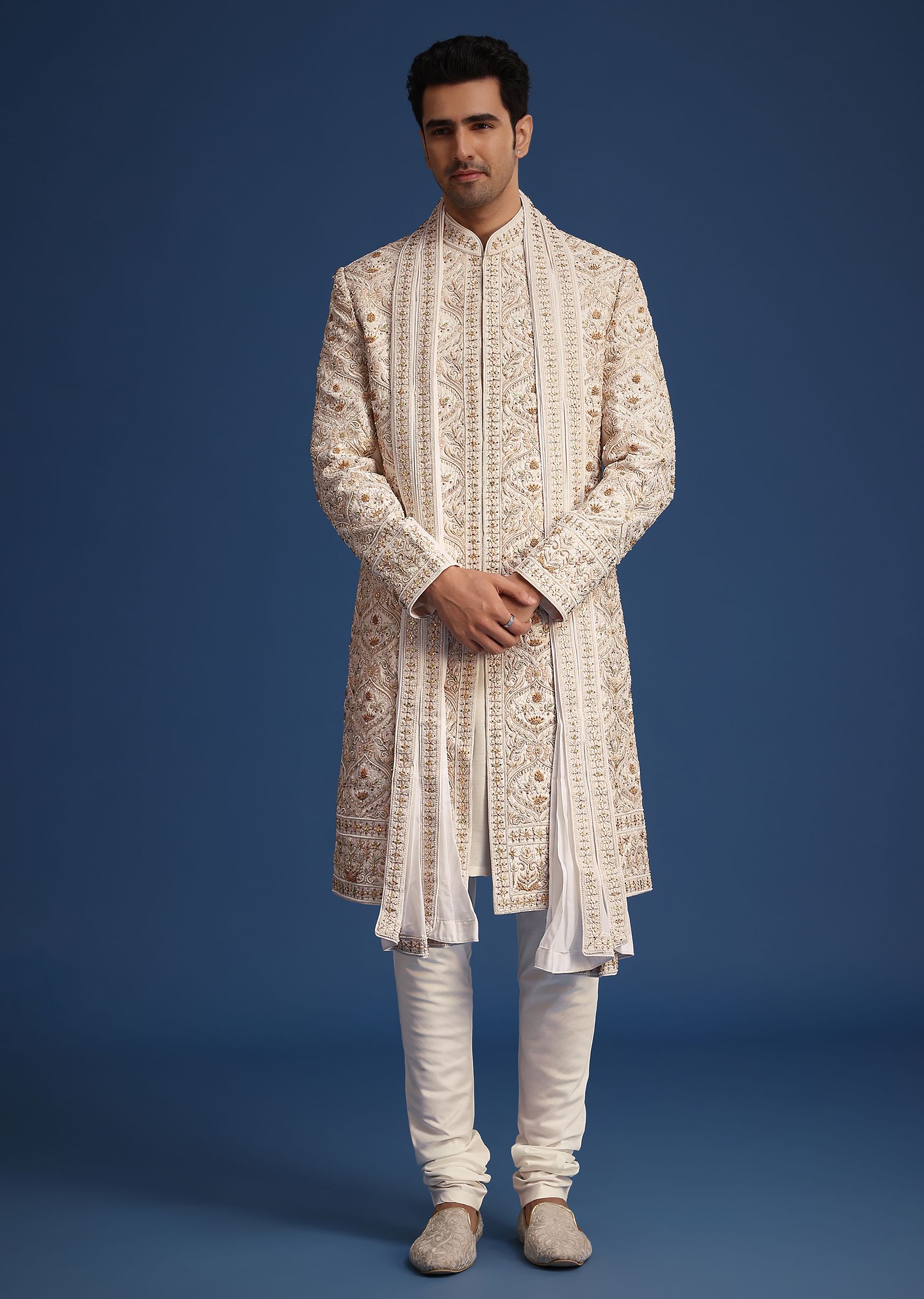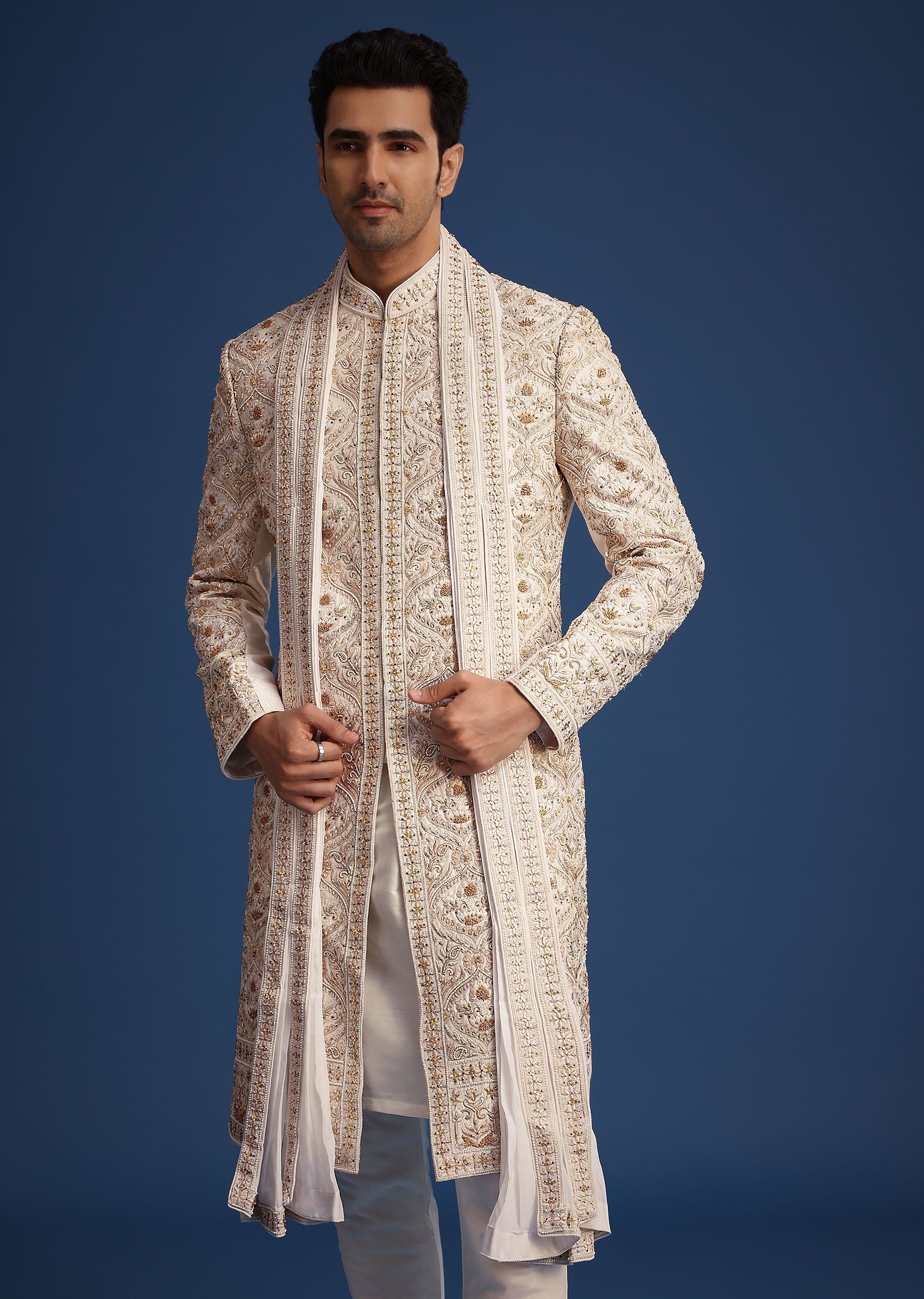 A beautiful testament to masterful craftsmanship, this royal off-white sherwani set is ideal for grand weddings and celebrations. Tailored from premium raw silk fabric, the exquiste hand embroidery tells a... More Product Details