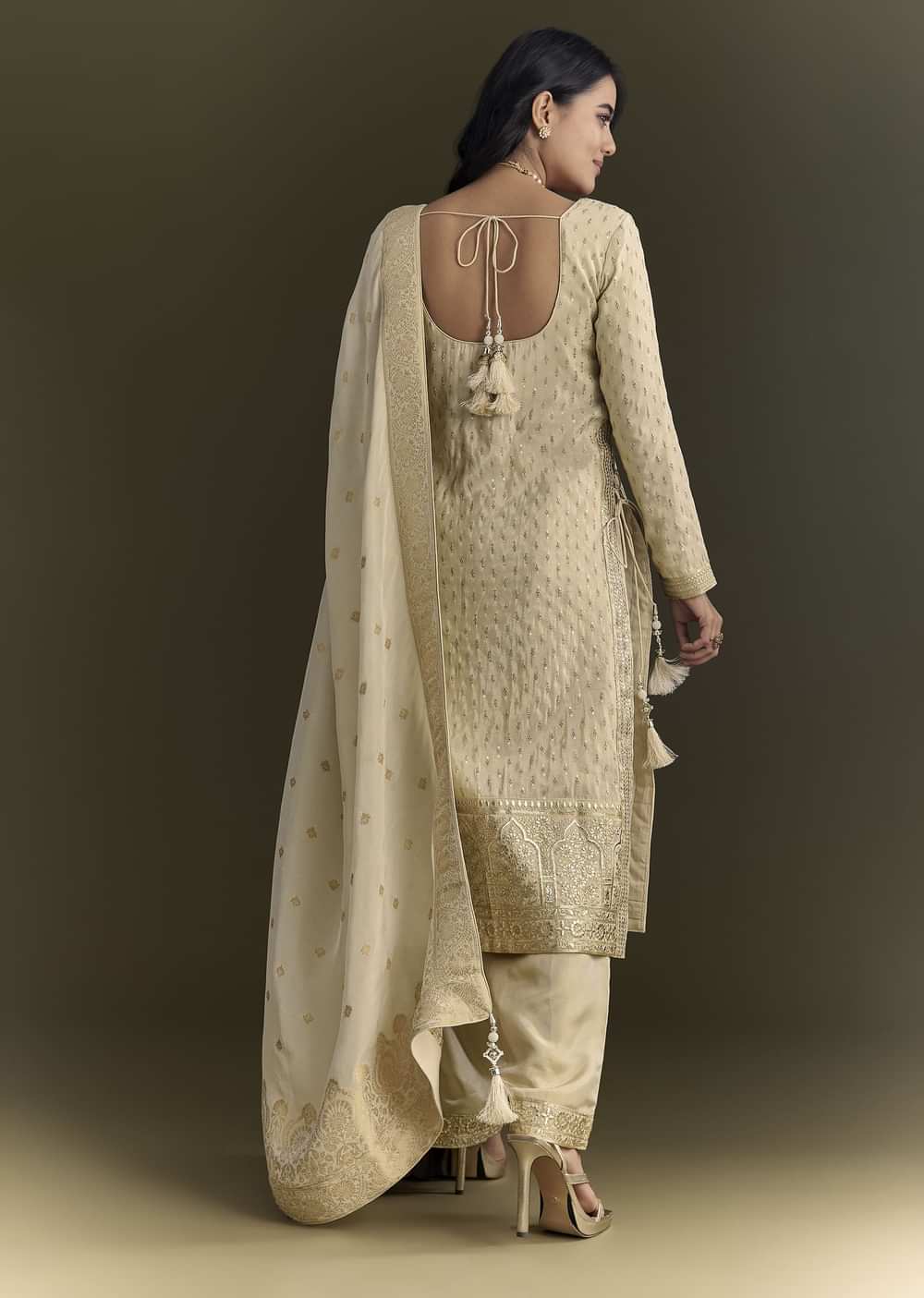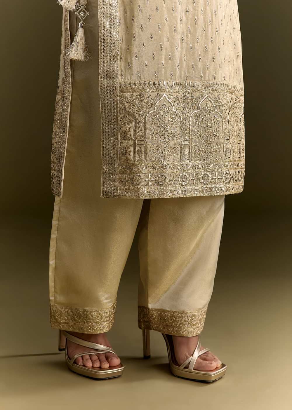 A kurta kissed by zari and sequins, with zardosi at the neckline and a badla work border, this cream tissue set is a vision for festive radiance.Tassels may vary.... More Product Details