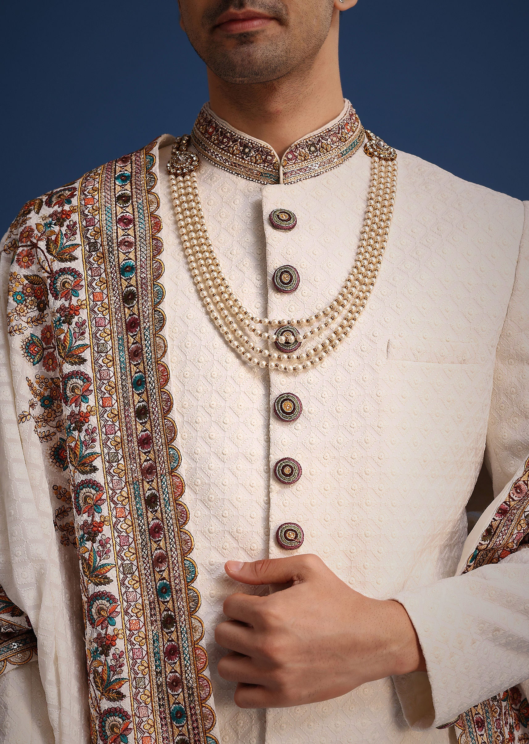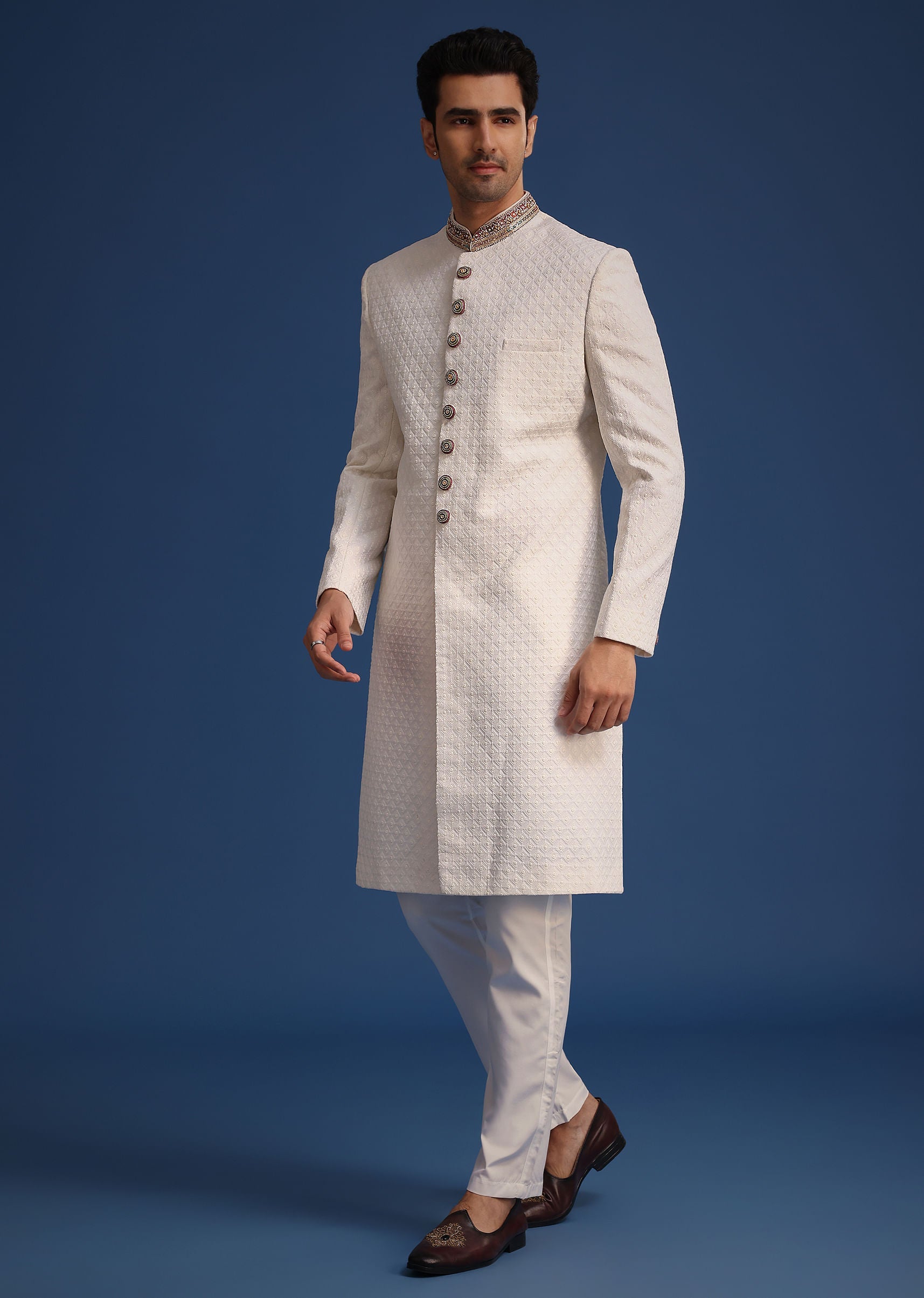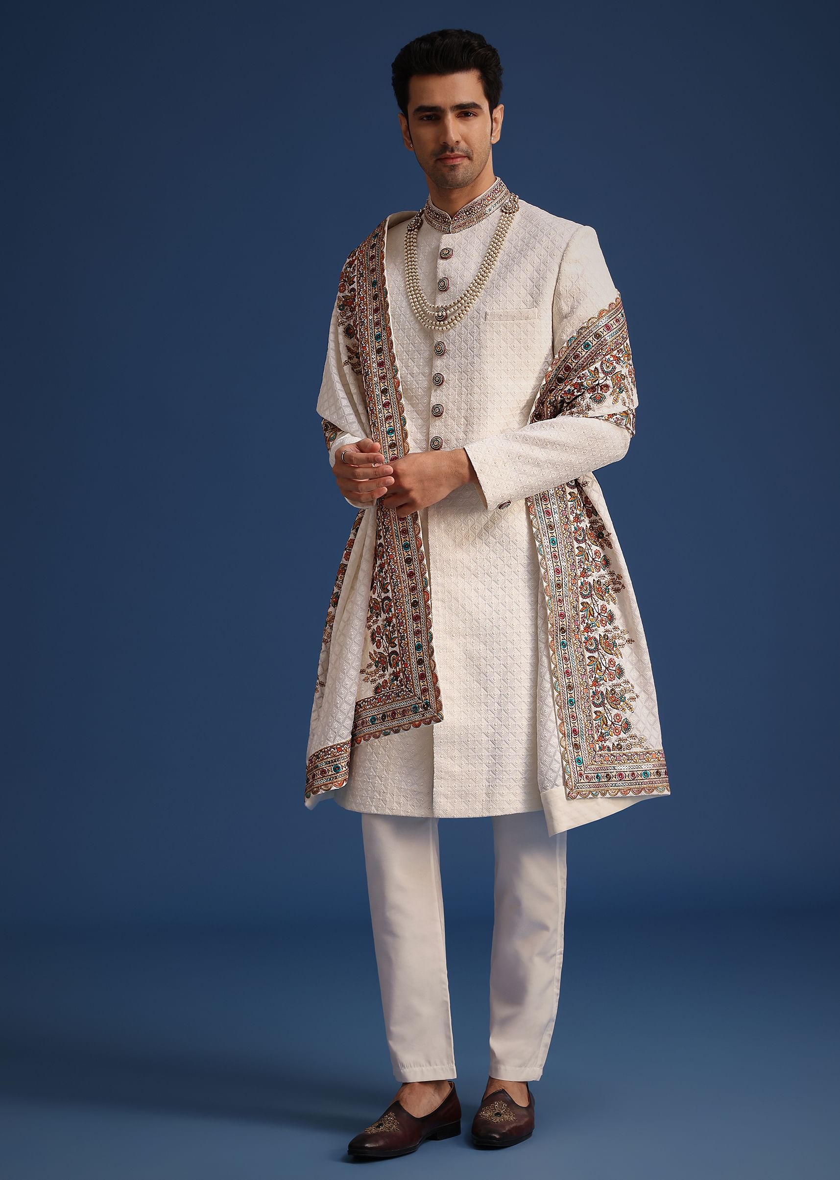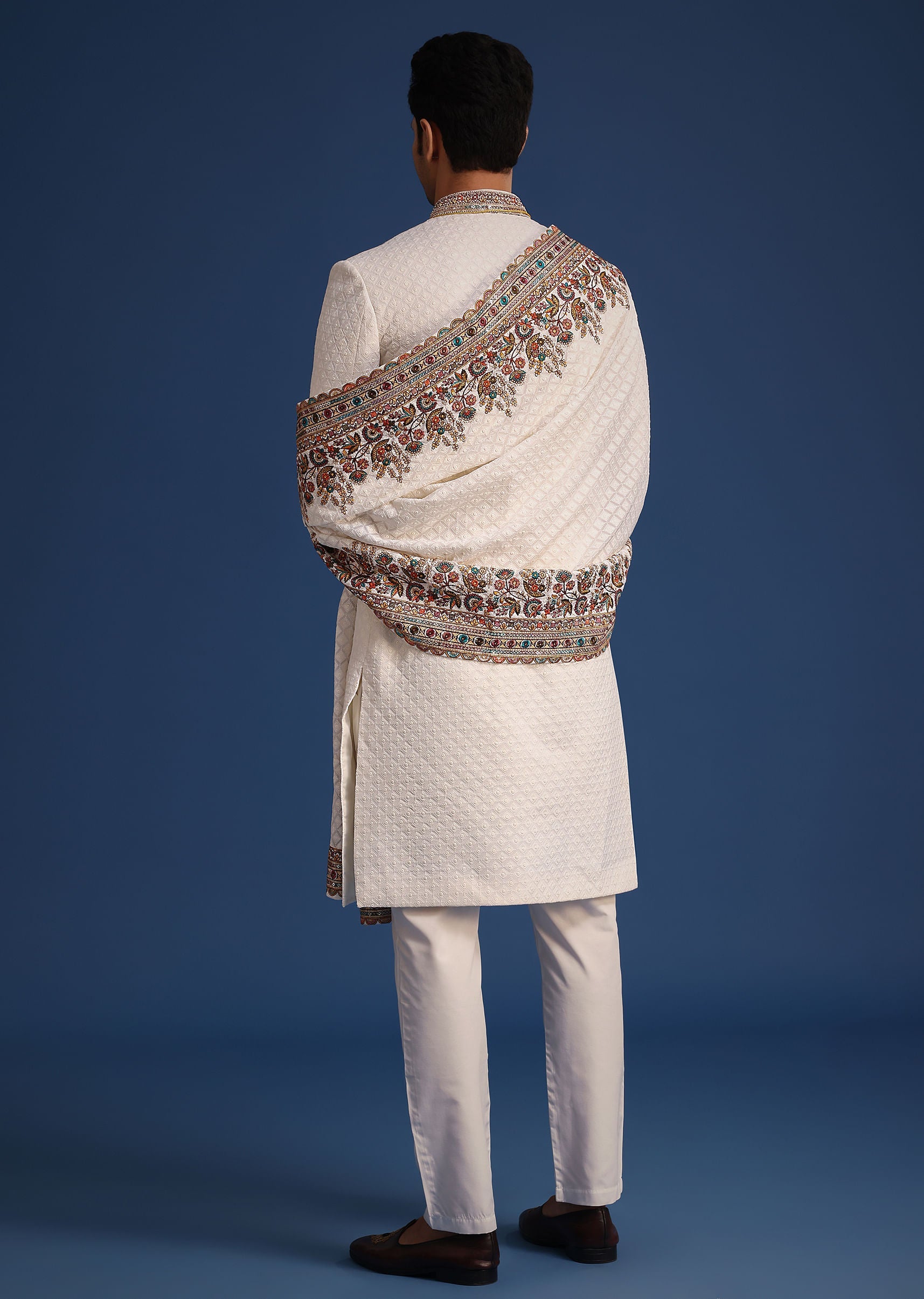 Off White Silk Embroidered Sherwani Set With Dupatta