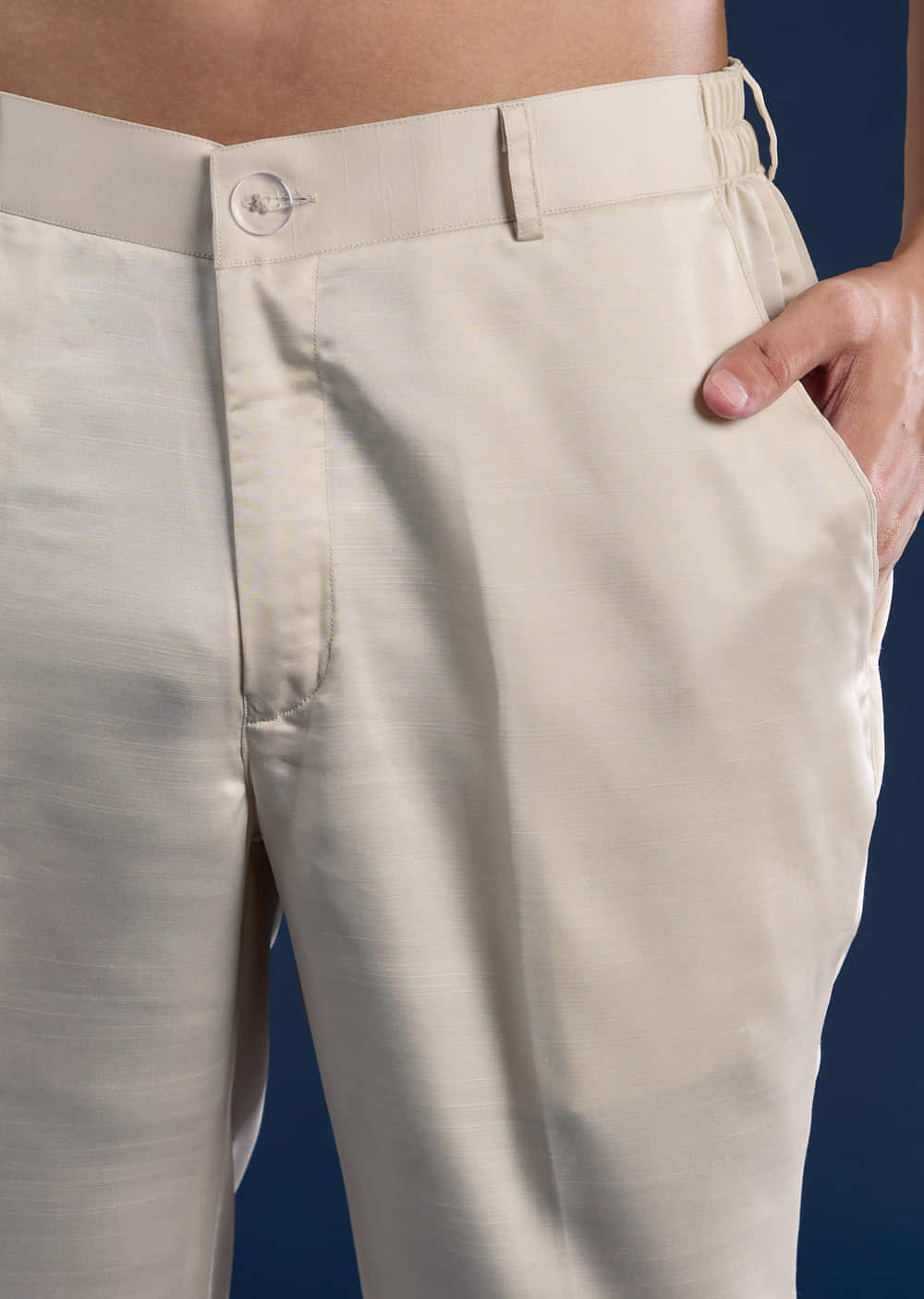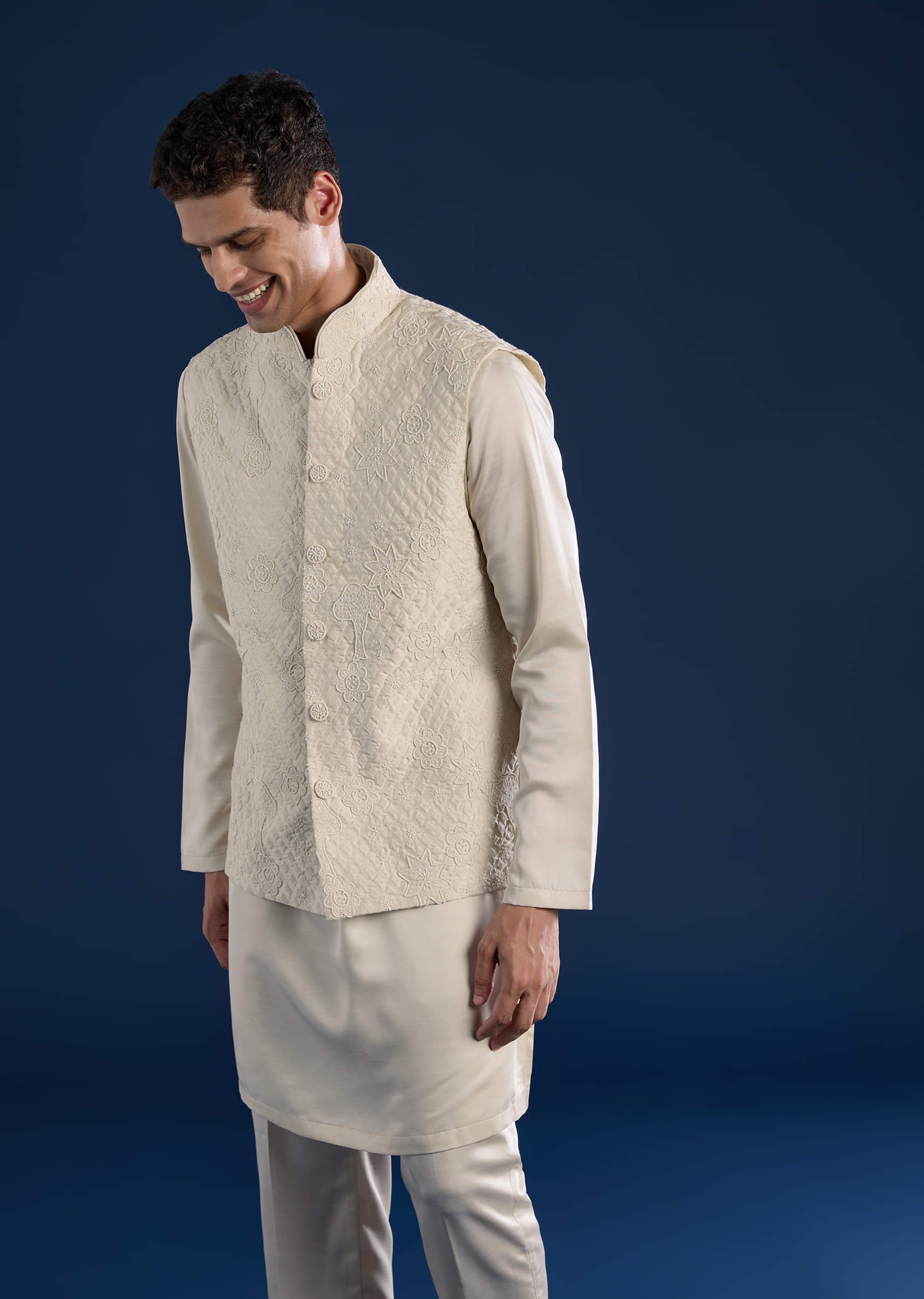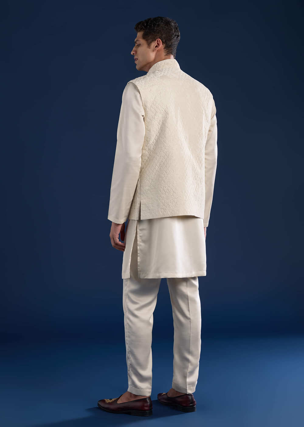 Embodying timeless elegance, this off-white silk jacket and kurta set with matching pants reflects refined craftsmanship and subtle luxury. The delicate moti work adds a soft shimmer, enhancing the natural sheen of the silk fabric. Perfect for weddings, festive occasions, or evening functions, this ensemble beautifully combines traditional artistry with a polished modern aesthetic. Awarded as the Most Trusted Brand, we're delivering styles you love, just as promised.
