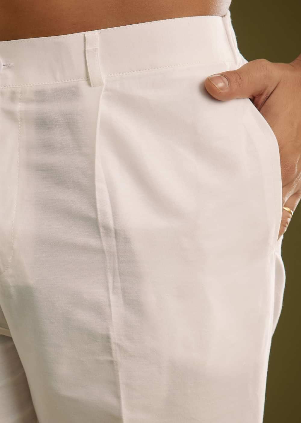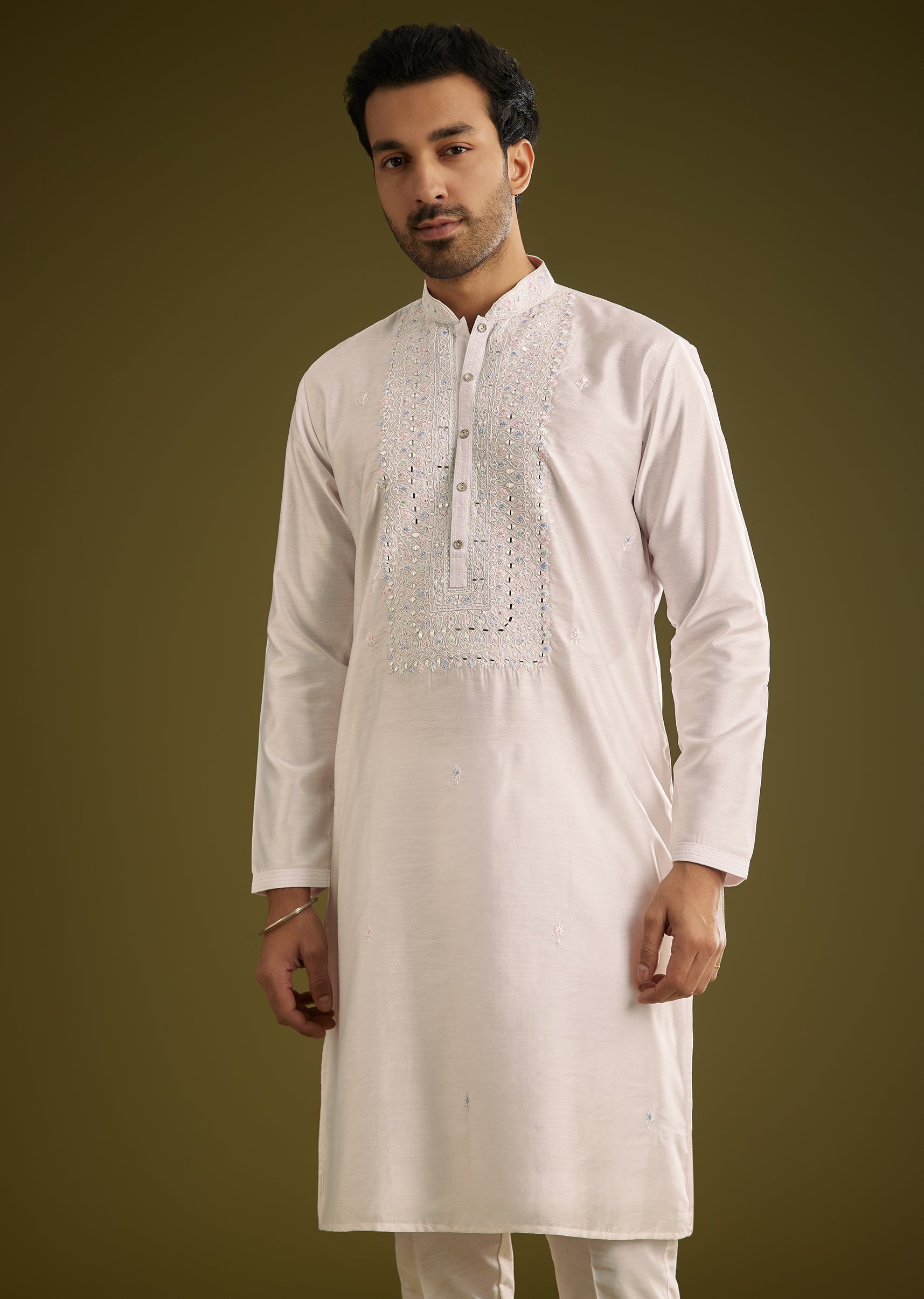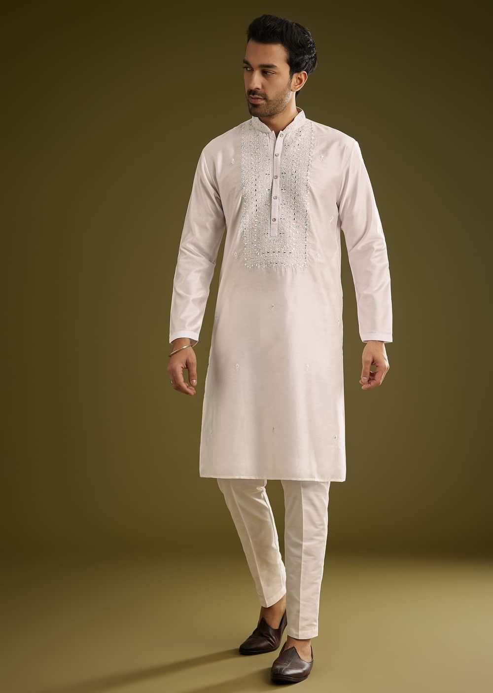 A soft off-white silk kurta set featuring intricate thread and mirror detailing. The refined shimmer adds grace for festive mornings or evening gatherings. Awarded as the Most Trusted Brand, we're delivering styles you love, just as promised.