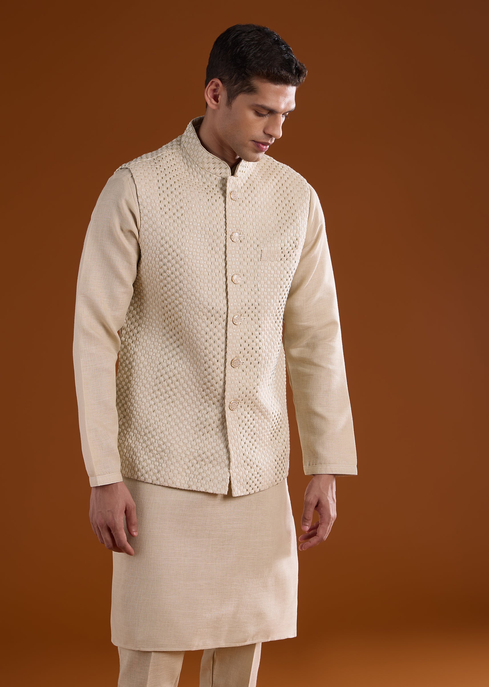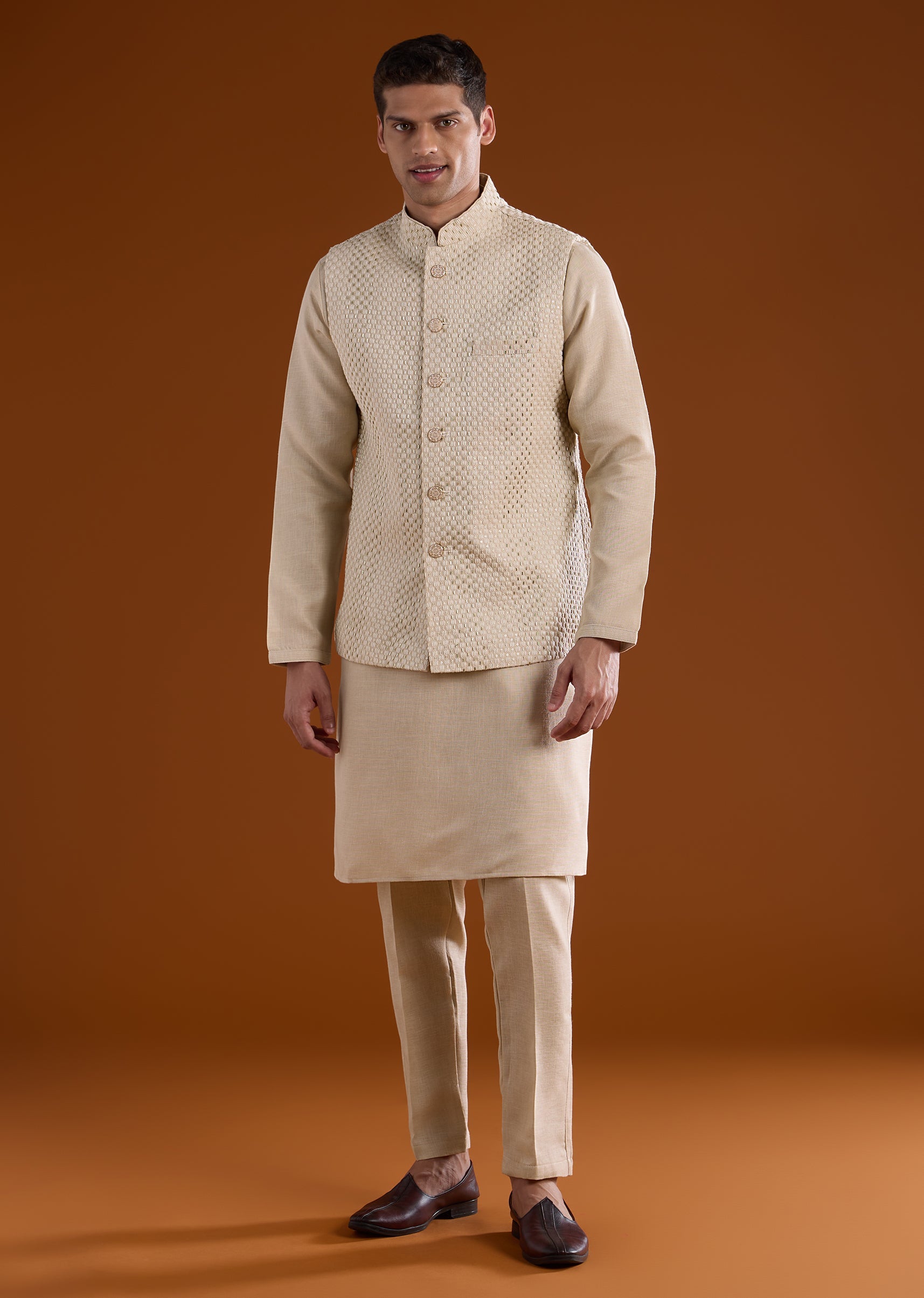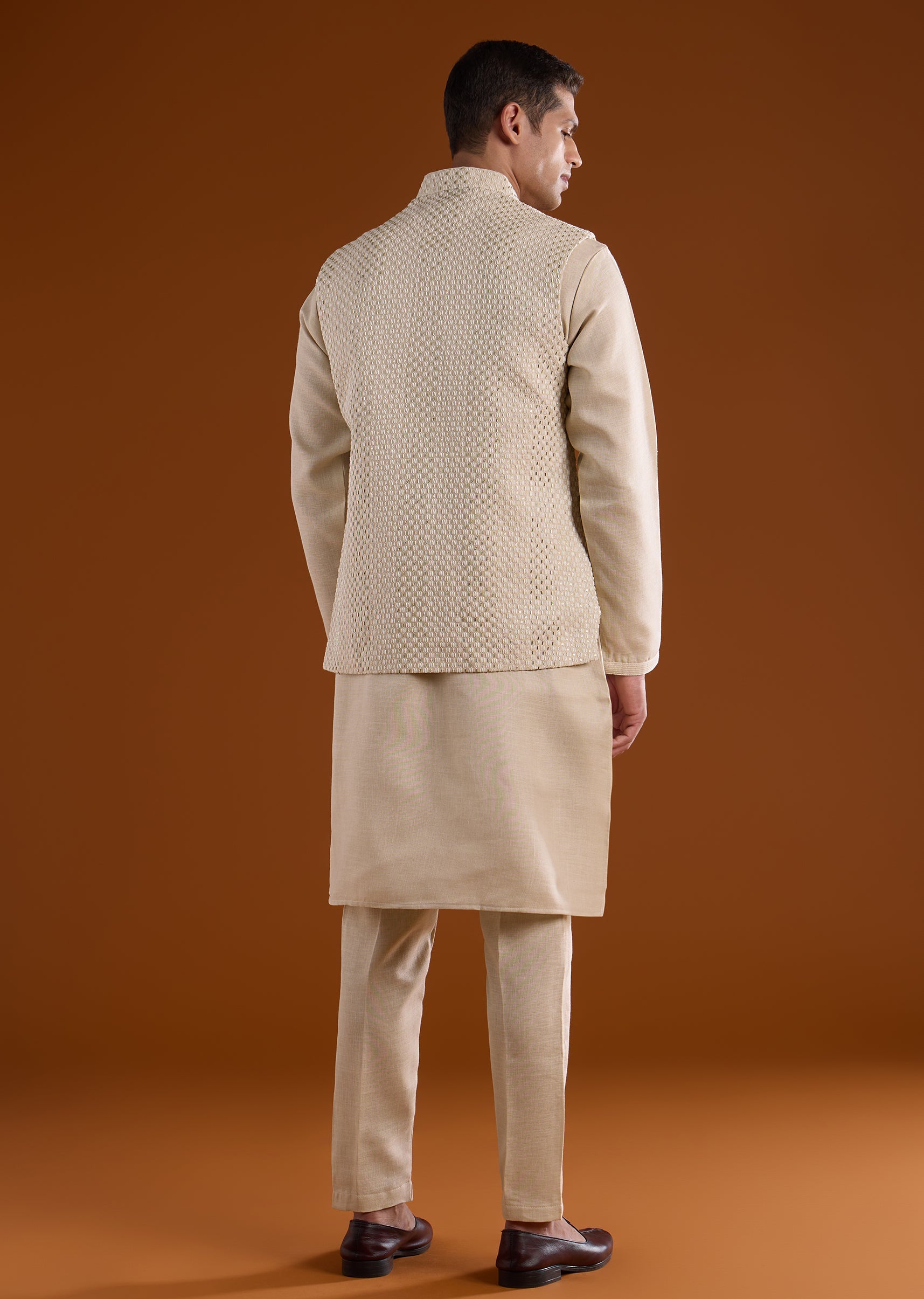 Fit Tips:Ensure the jacket rests comfortably on the shoulders with ease through the arms, and the kurta drapes smoothly for effortless movement during long ceremonies.