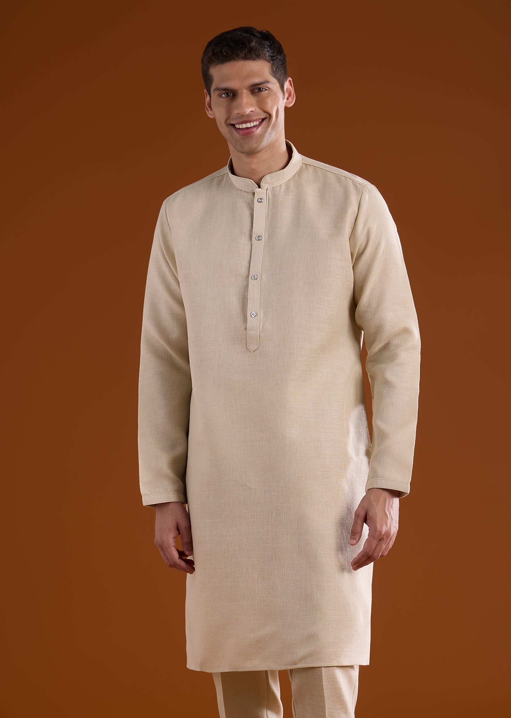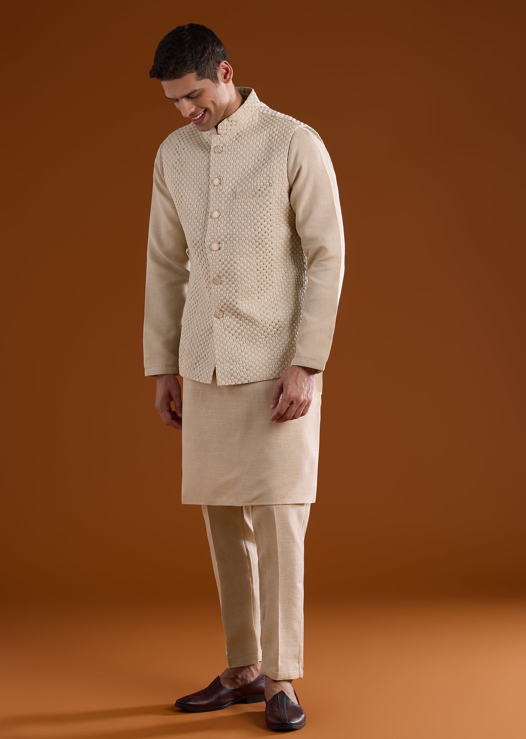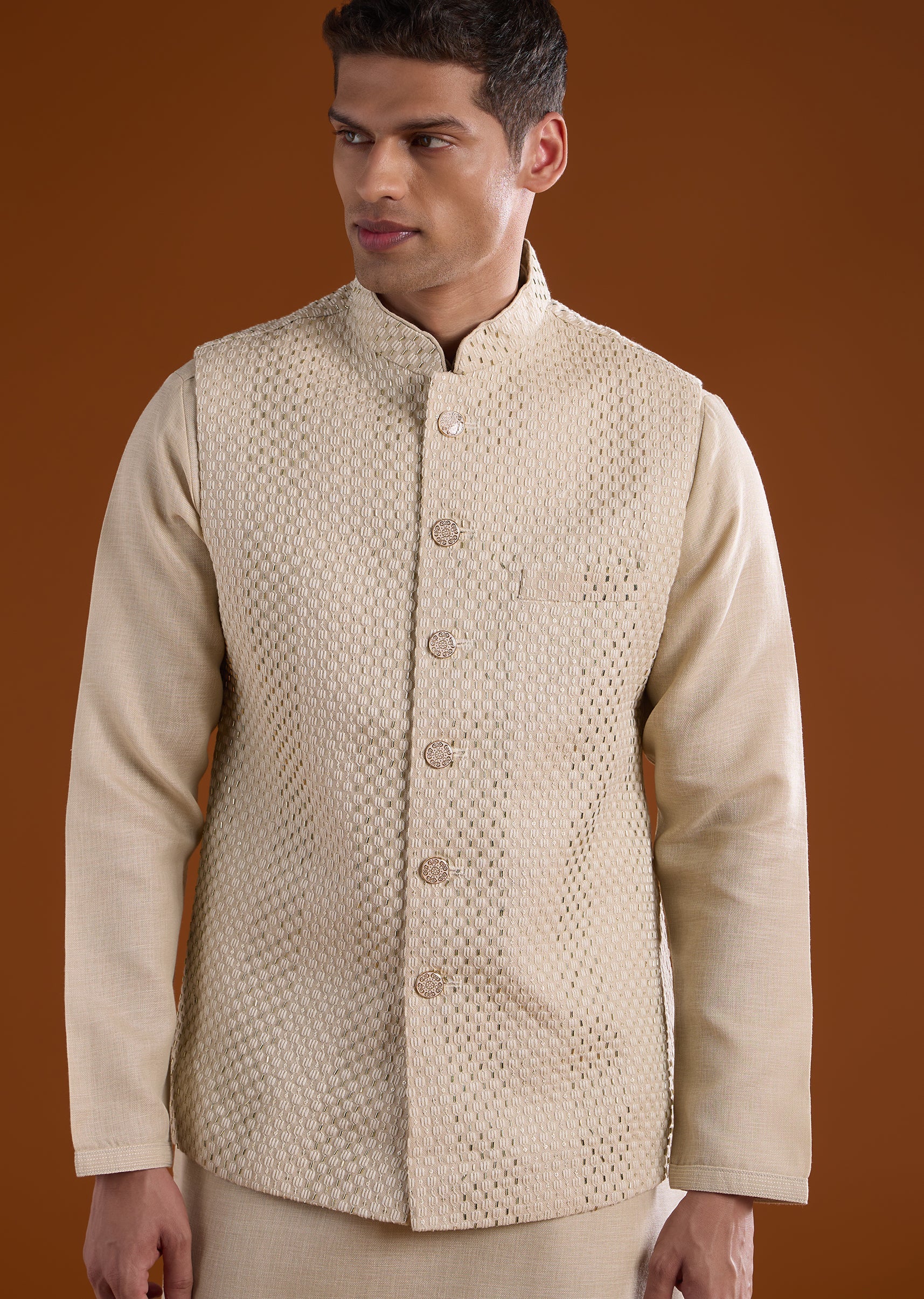 Fit Tips:Ensure the jacket rests comfortably on the shoulders with ease through the arms, and the kurta drapes smoothly for effortless movement during long ceremonies.