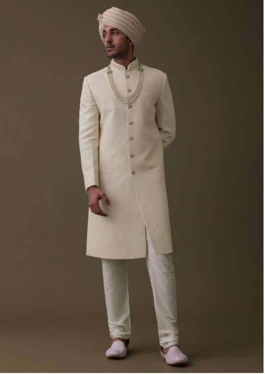 Introducing our luxurious sherwani set, crafted with premium silk fabric. The exquisite Lucknowi embroidery adds a touch of grandeur and luxury to the overall design. The sherwani comes in a mandarin collar neckline with full sleeves. The set includes a matching mala and a comfortable churidar, ensuring a coordinated and complete look. EVENT - Perfect for weddings and receptions. NOTE - Buttons and accessories may vary in color, shape, and size.Change folds regularly. Awarded as the Most Trusted Brand, we're delivering styles you love, just as promised.