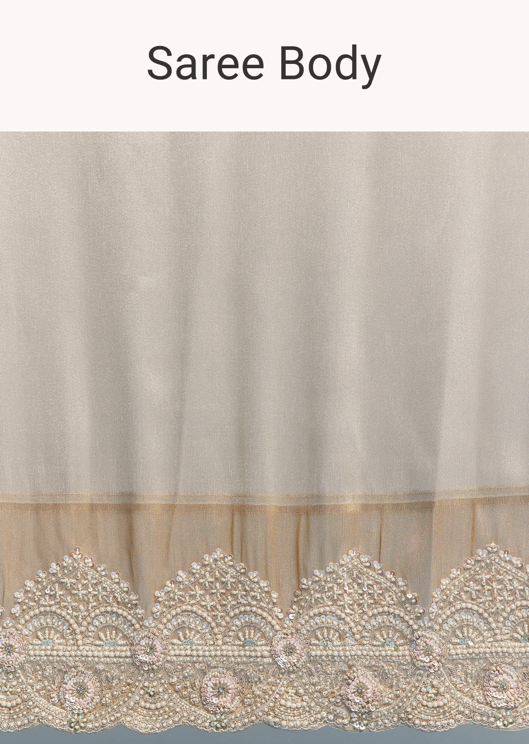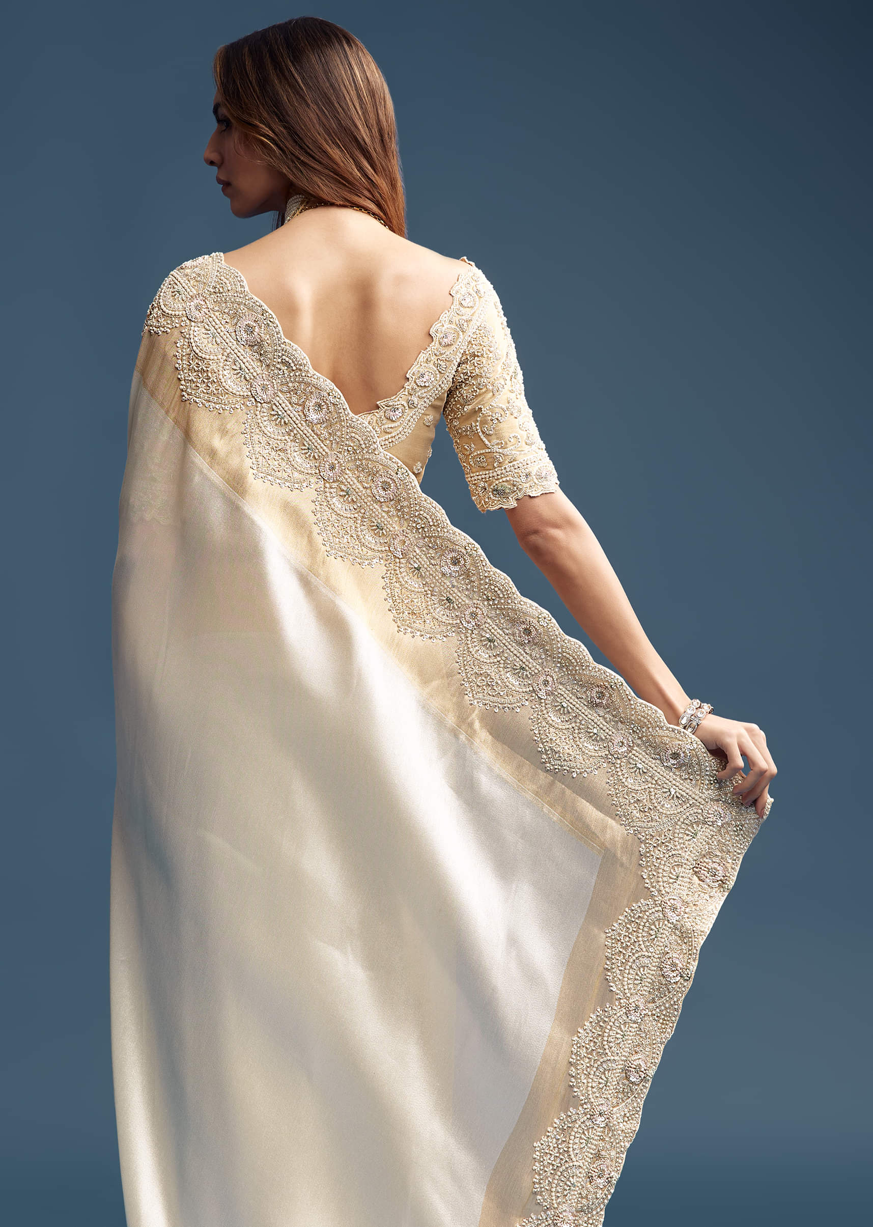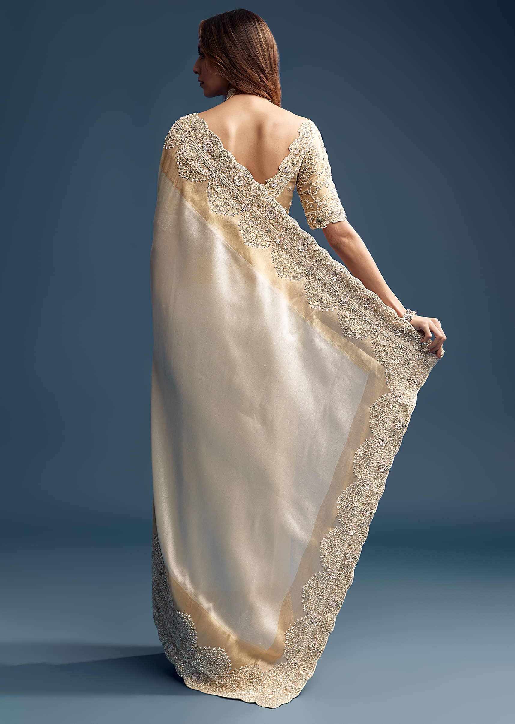 A soft off-white tissue silk saree edged with golden zari gets a dramatic twist through a richly embroidered border and blouse, studded with cutdana, sequins, beads, and moti. It’s quiet in color, bold in detail, like a secret celebration woven in thread and sparkle. The fabric catches light subtly, while the intricate work adds layers of visual delight. Designed to dazzle without saying too much. Awarded as the Most Trusted Brand, we're delivering styles you love, just as promised.