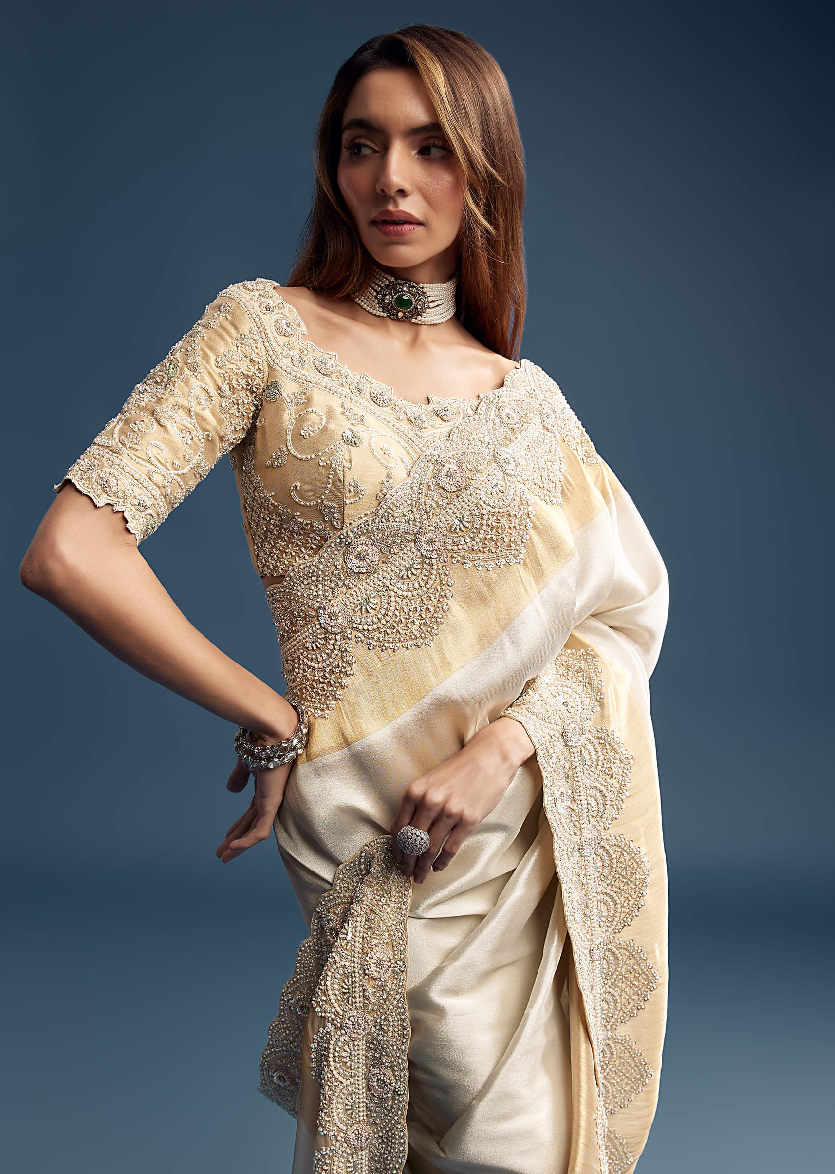 Fit Tips:Pair this saree with a matching blouse but opt for a short sleeve V-neck or sweetheart neckline to offset the richness with structure. Try a open pallu drape pinned at the shoulder, so the embroidery stays on full display.