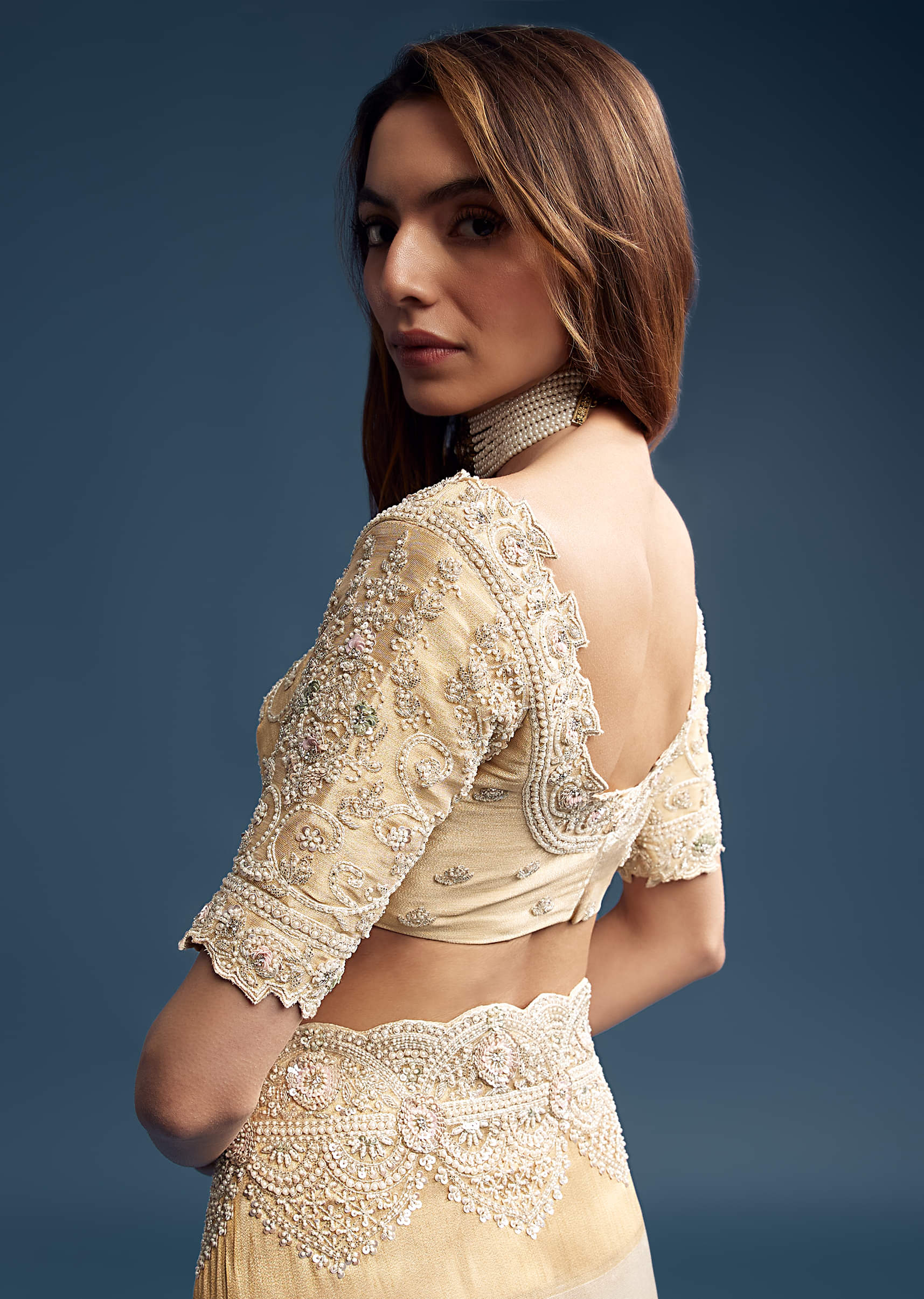 Go for natural makeup with a hint of gold on the lids and a deep nude lip. Throw in a polki choker and let it do all the heavy lifting in the drama department.