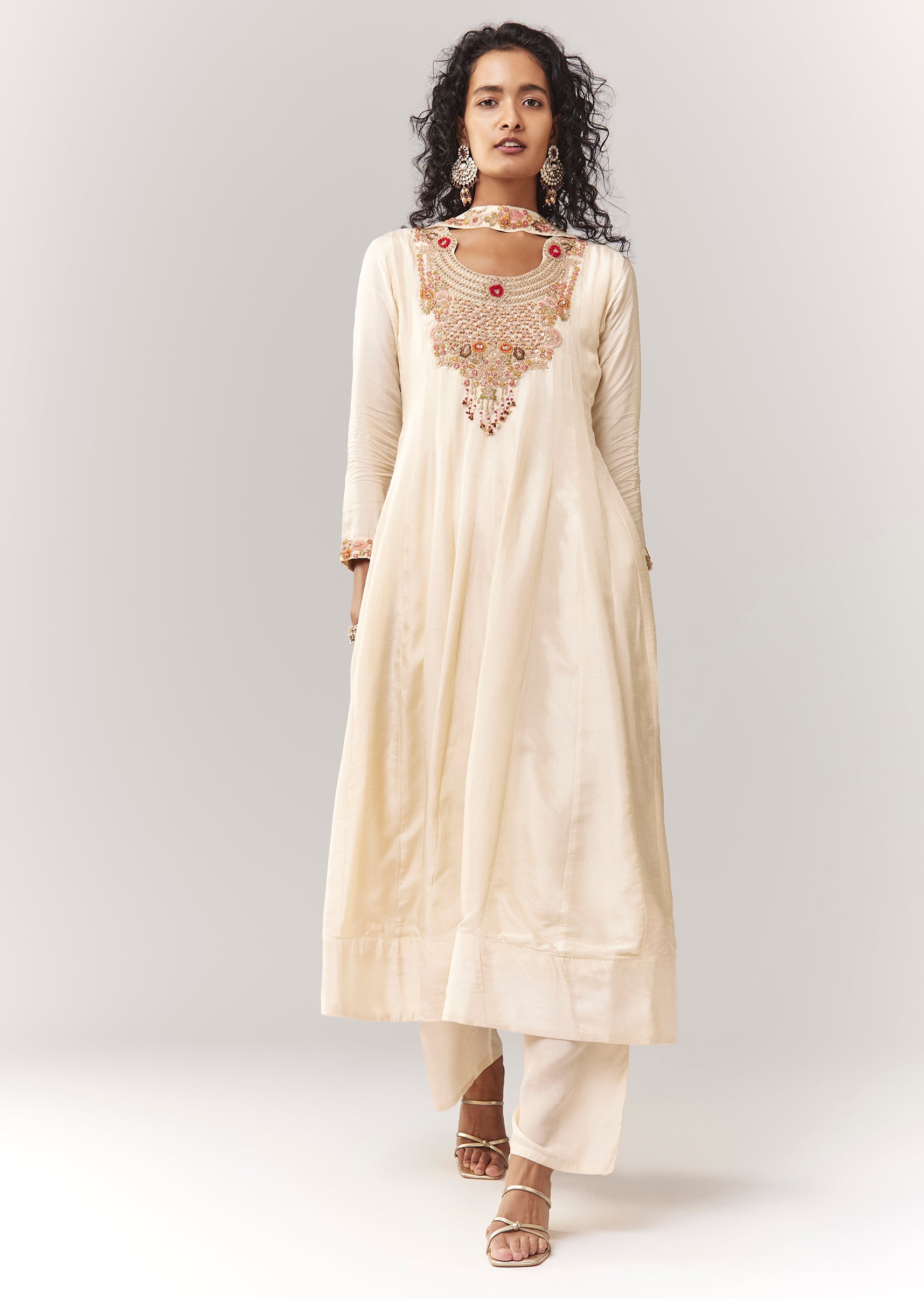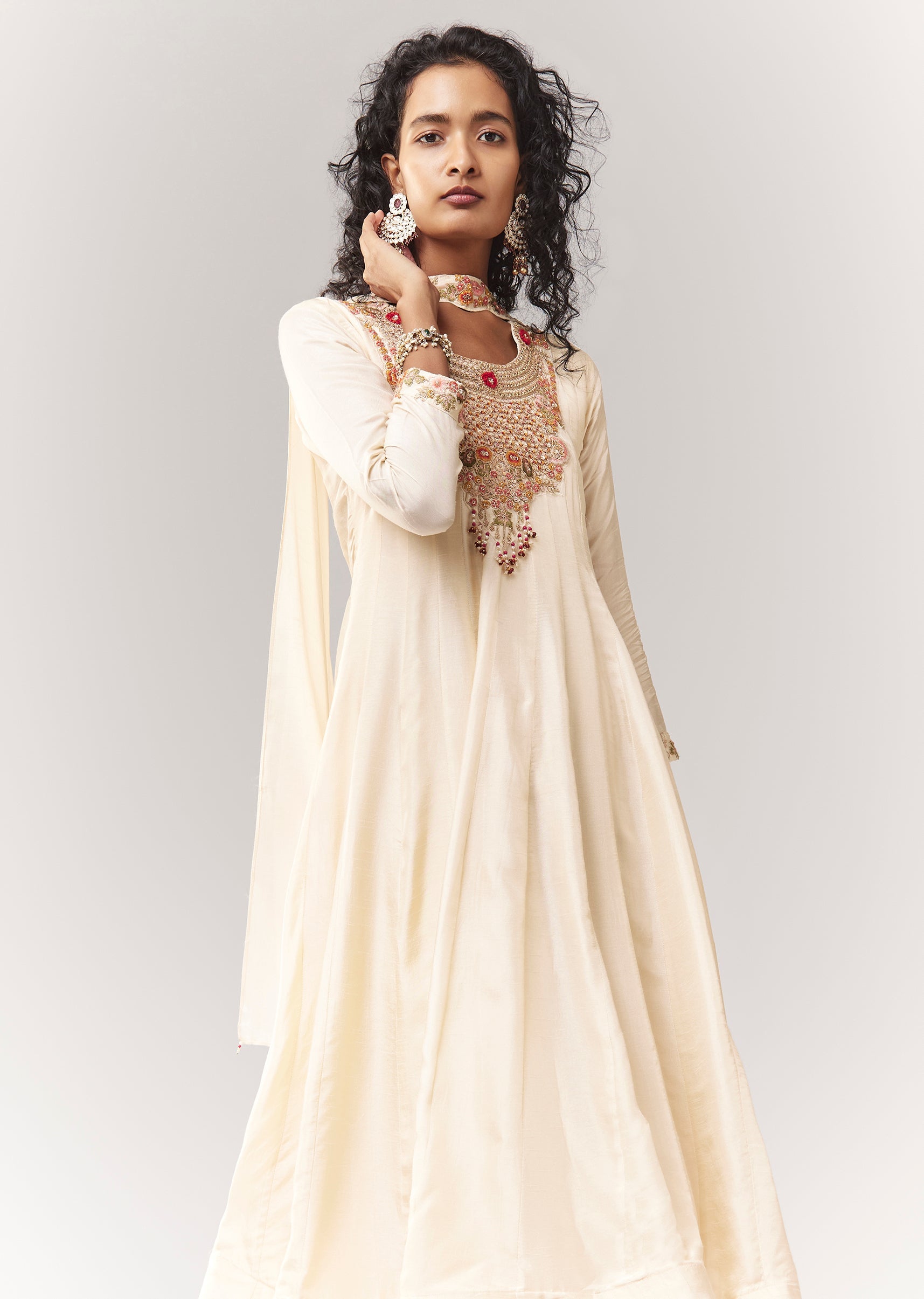 Off White Zardosi And Thread Work Anarkali With Choker Style Dupatta