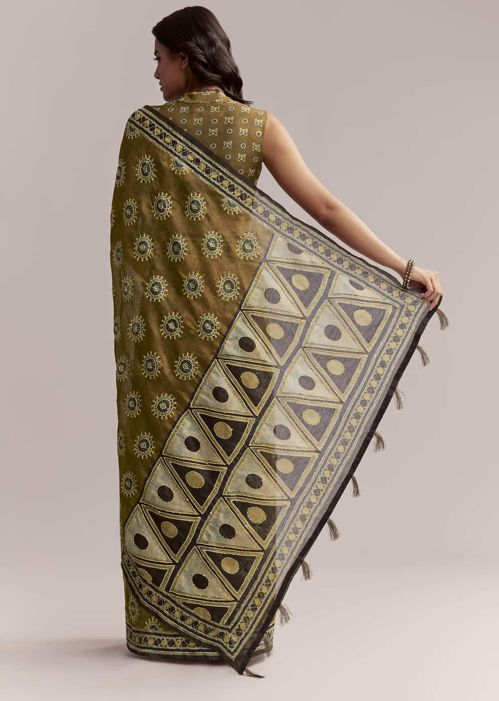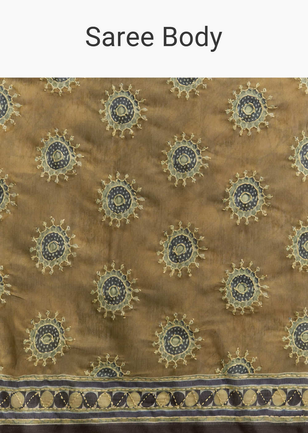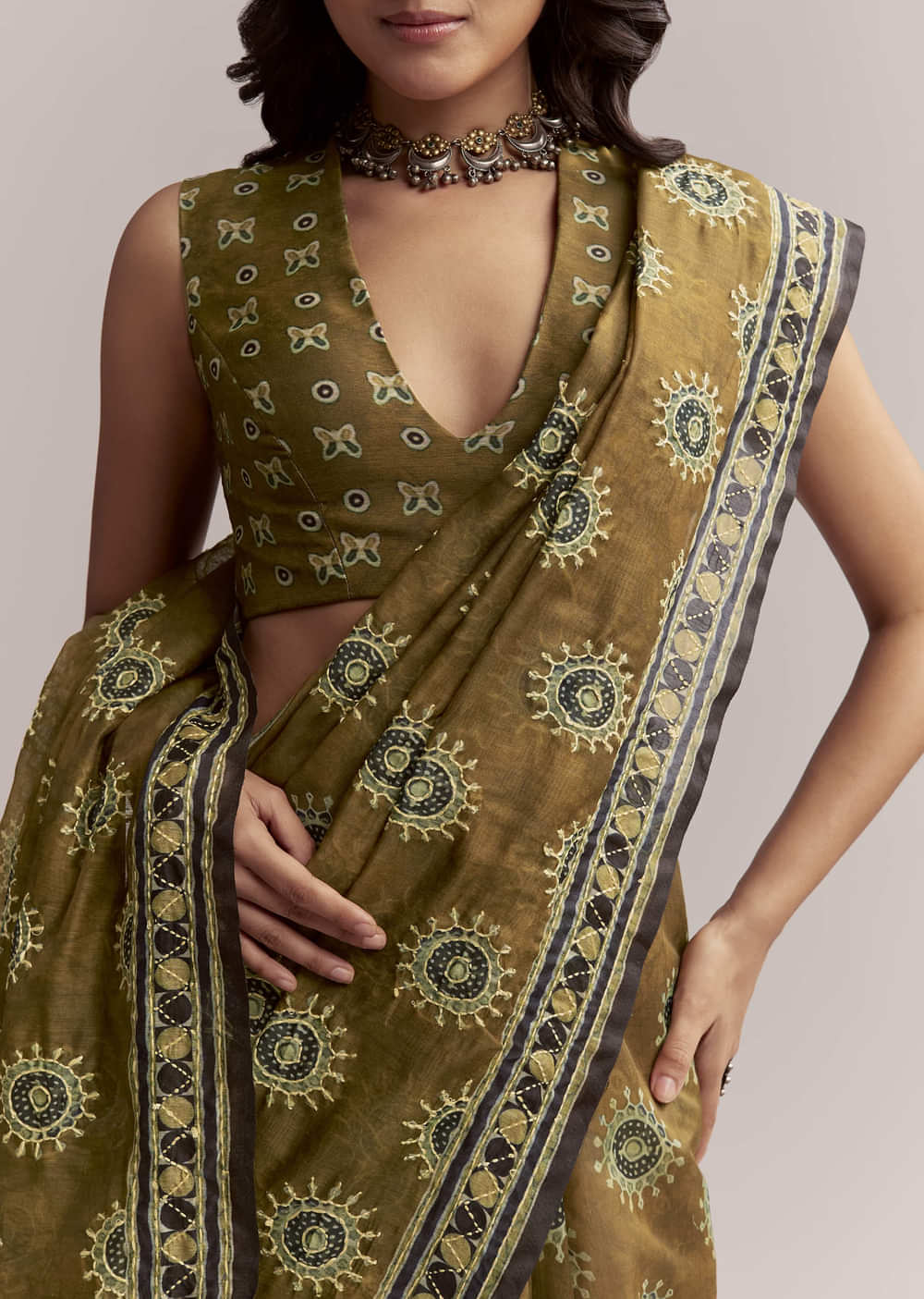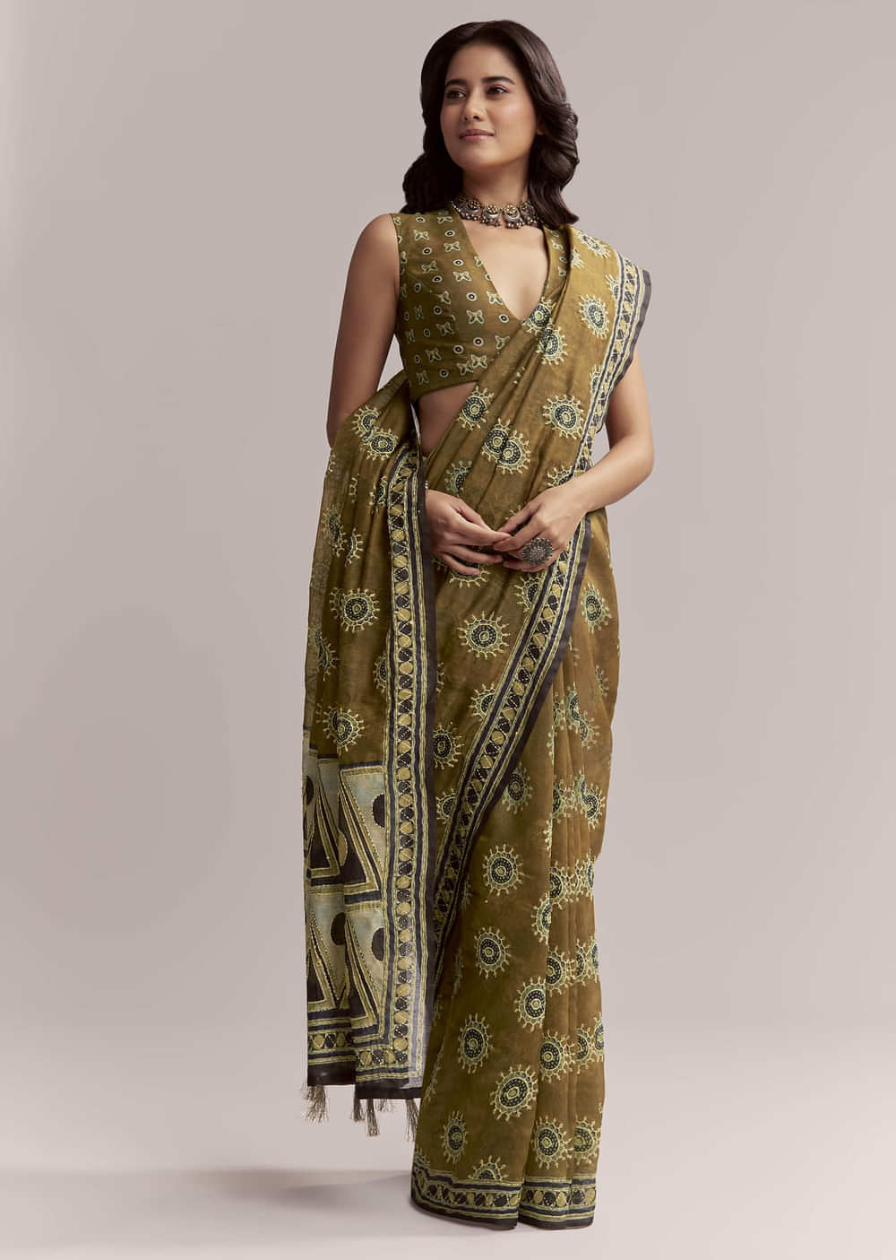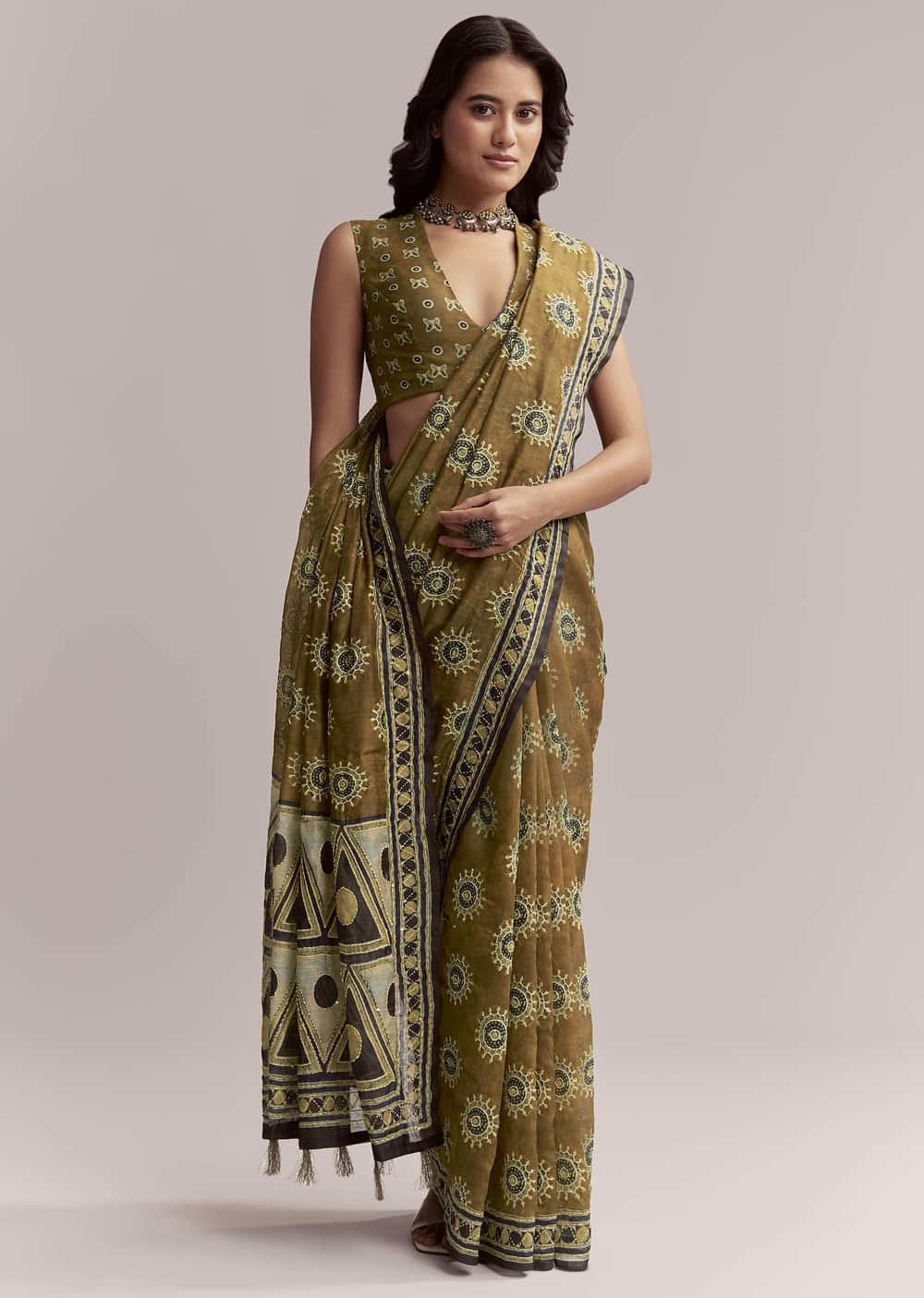 Olive Brown Linen Printed Saree With Handcrafted Ajrakh Print