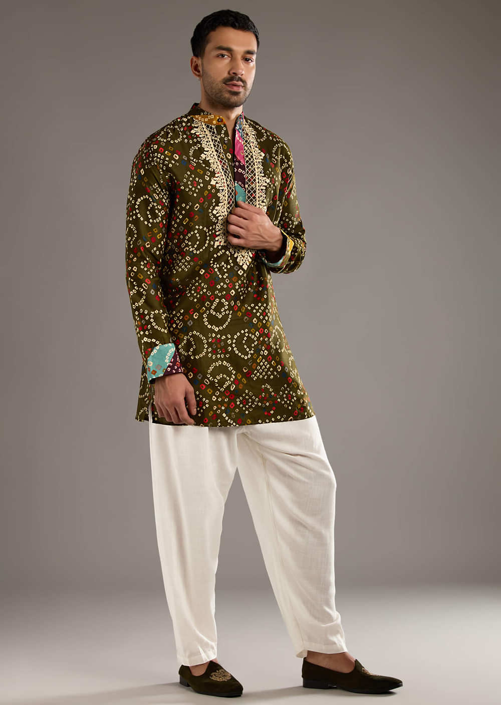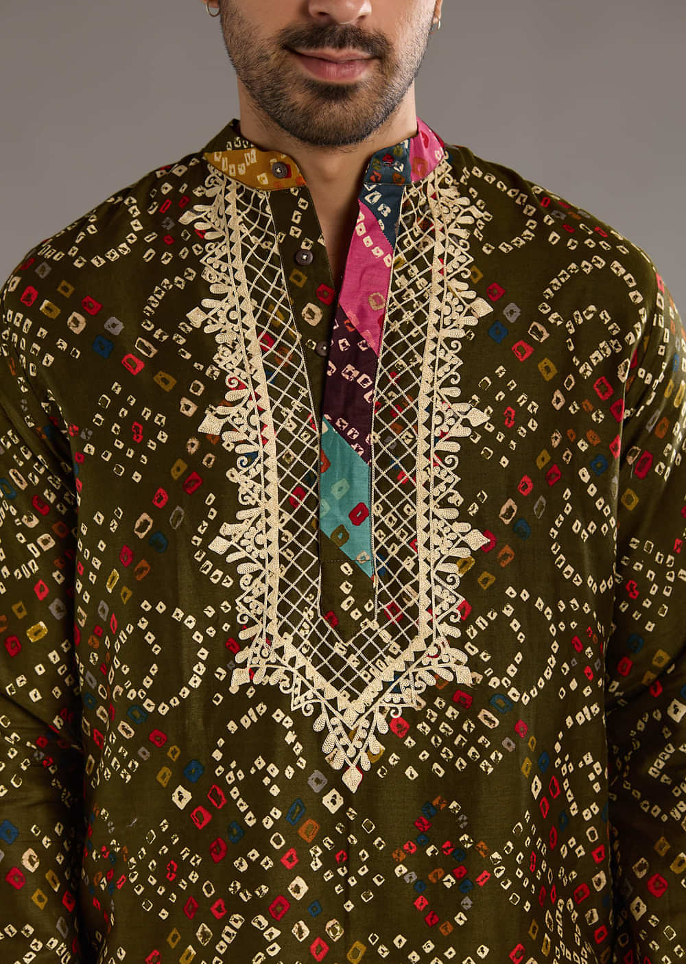 Olive Cotton Silk Kurta Set For Men With Hand Dyed Bandhani Print