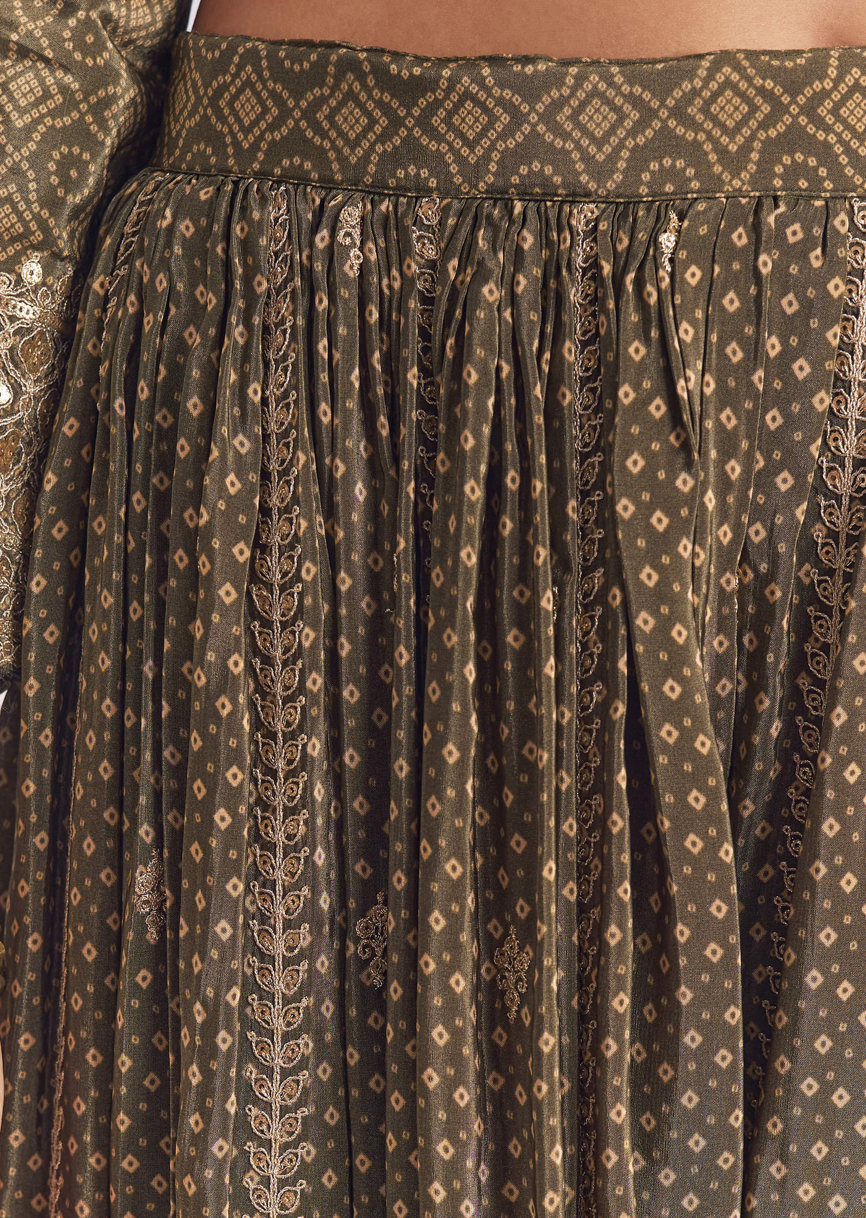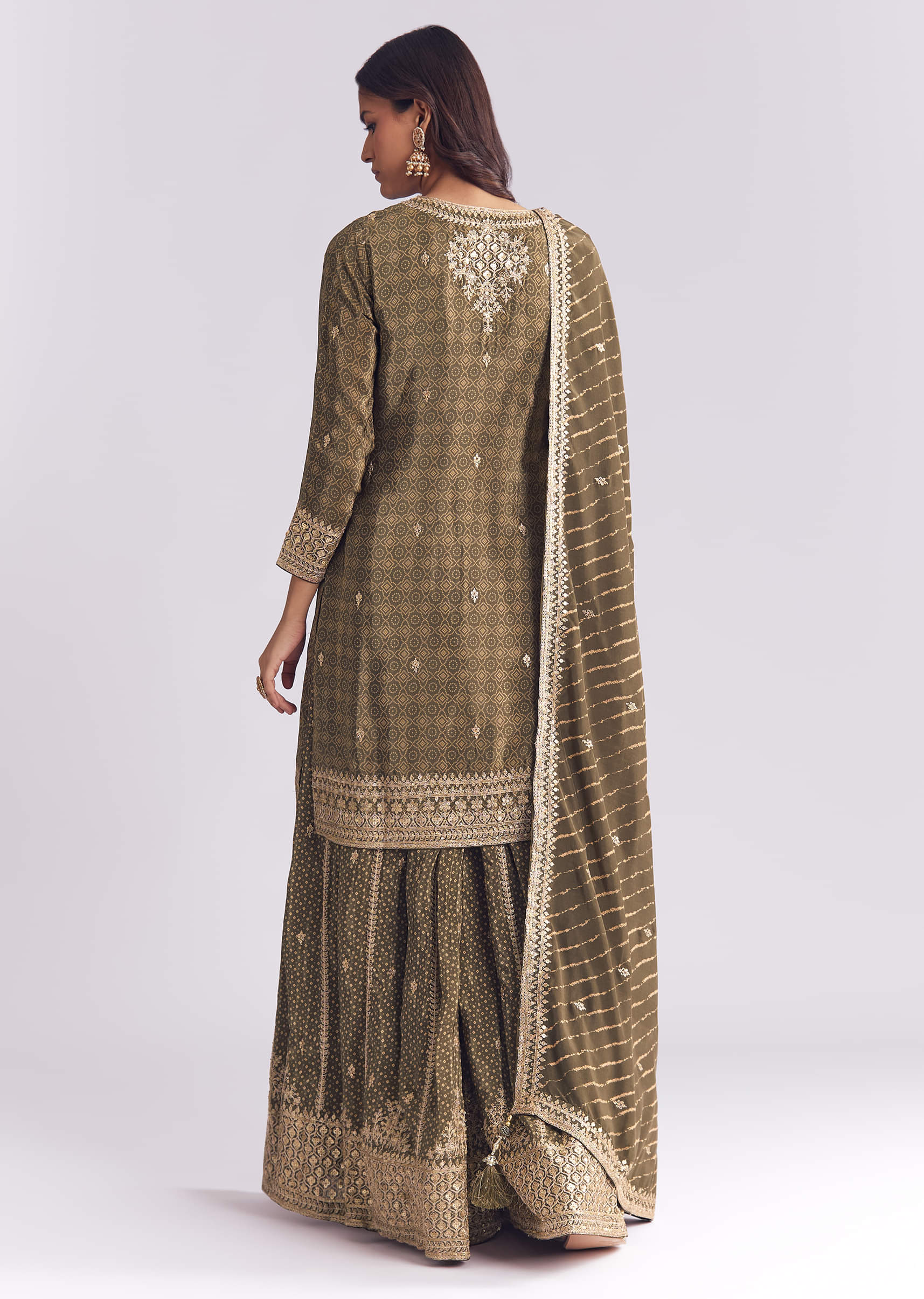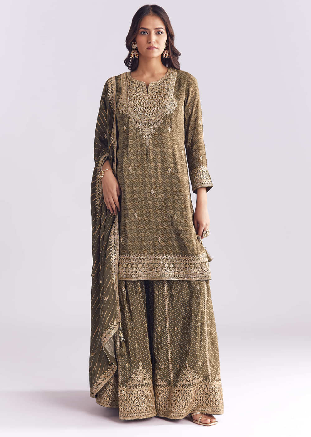 Olive Crepe Bandhani Palazzo Suit With Zari And Sequins Work