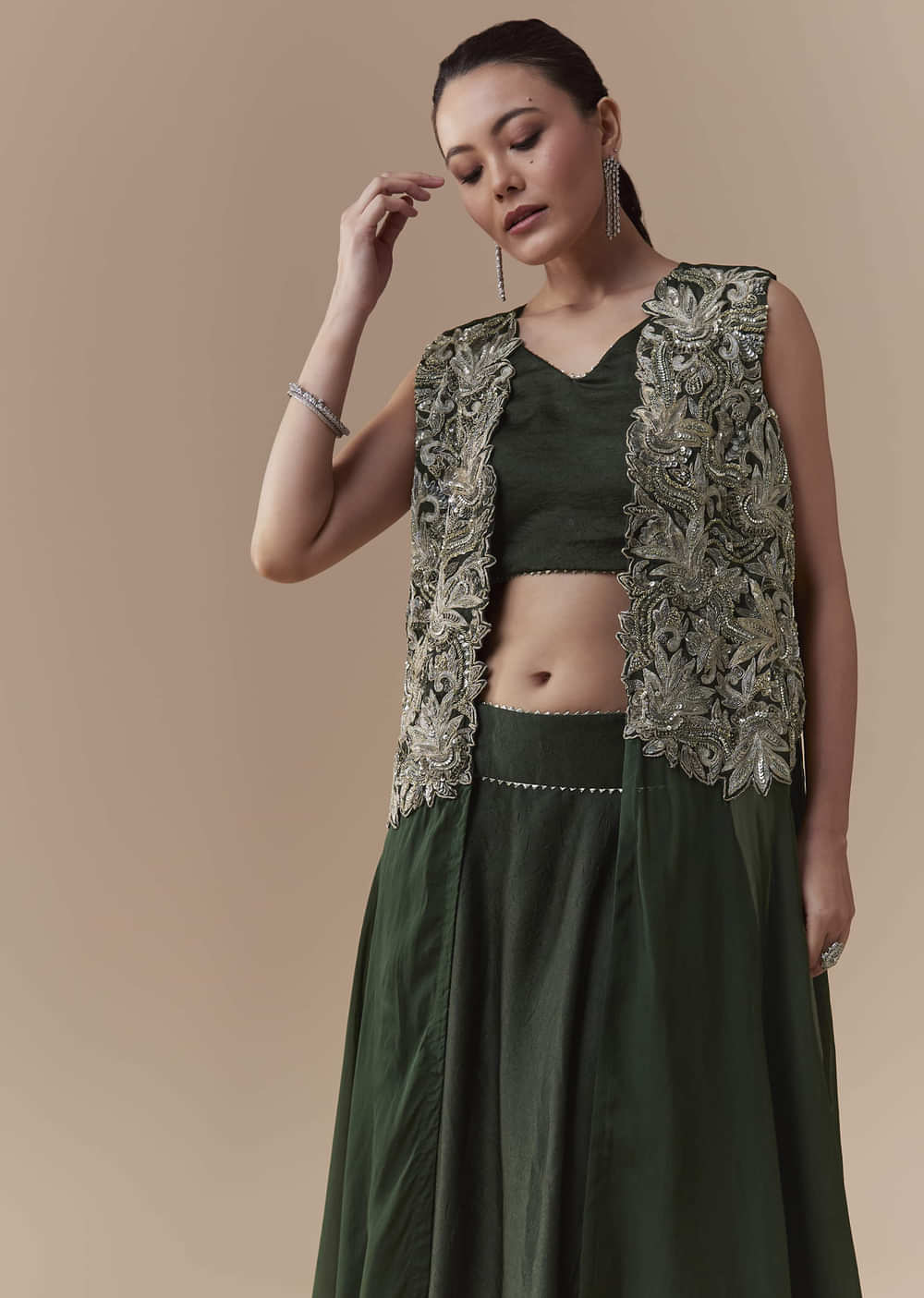 Olive Crop Top Silk Skirt Set with Sequin Jacket