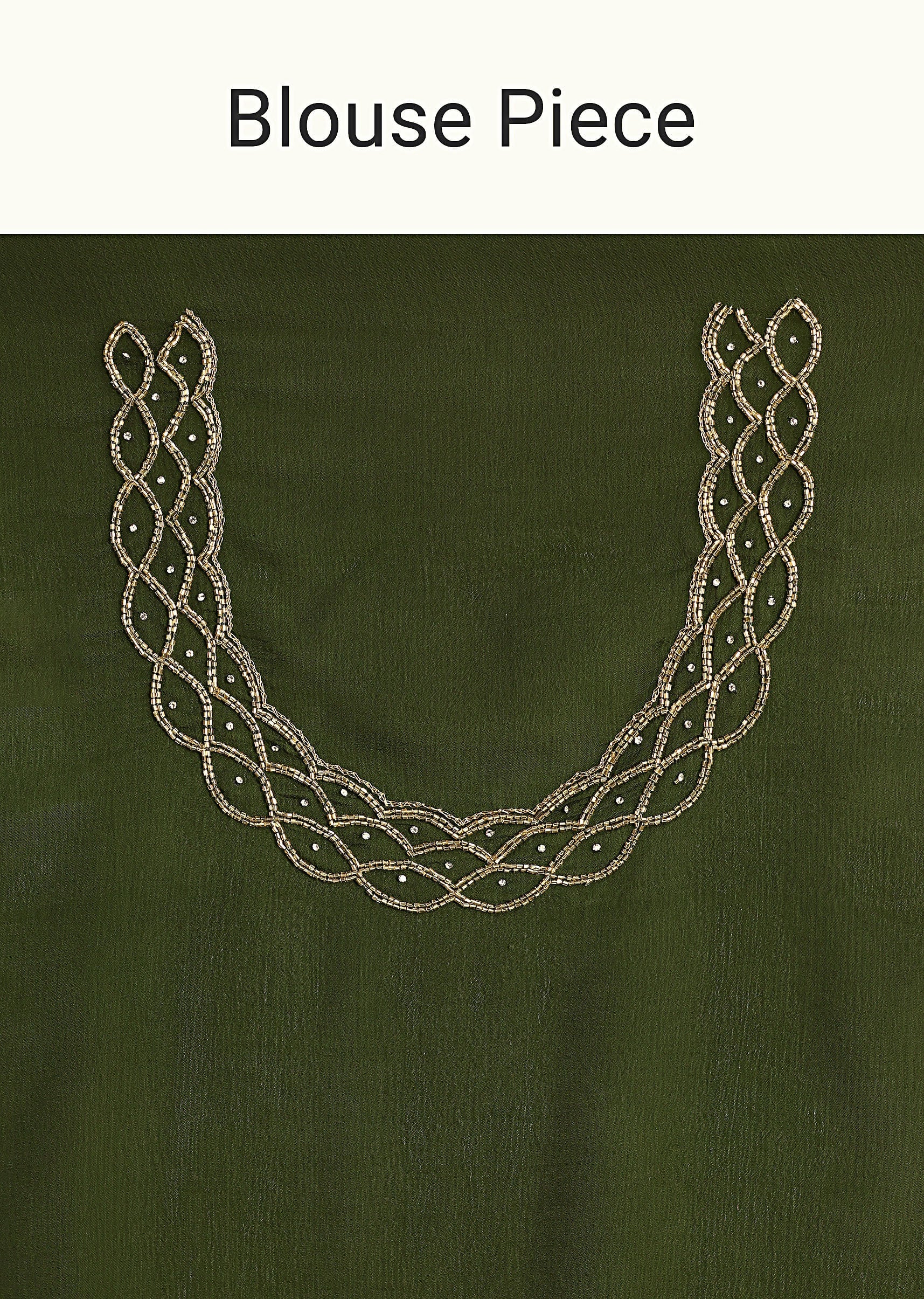 This olive green saree, featuring heavy cutdana embellishments, tells a tale of grandeur elegance. Perfect for special celebrations, cocktail parties and glamorous events, the luxe chinon fabric adds to its... More Product Details