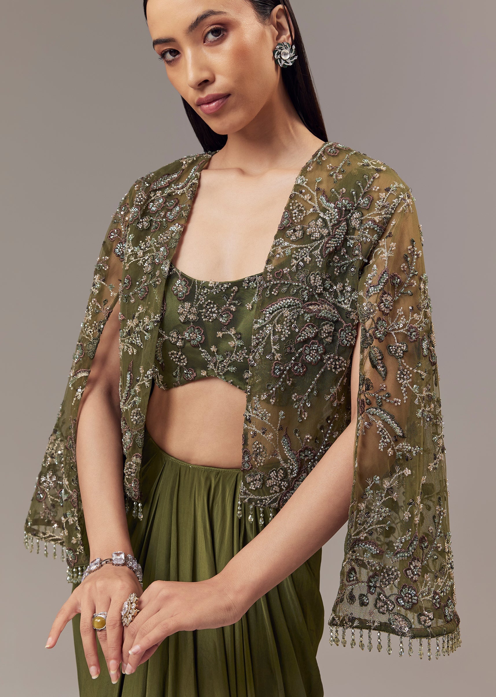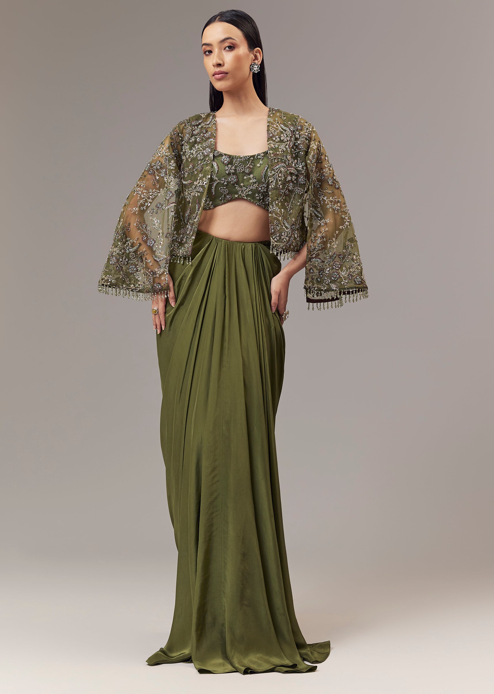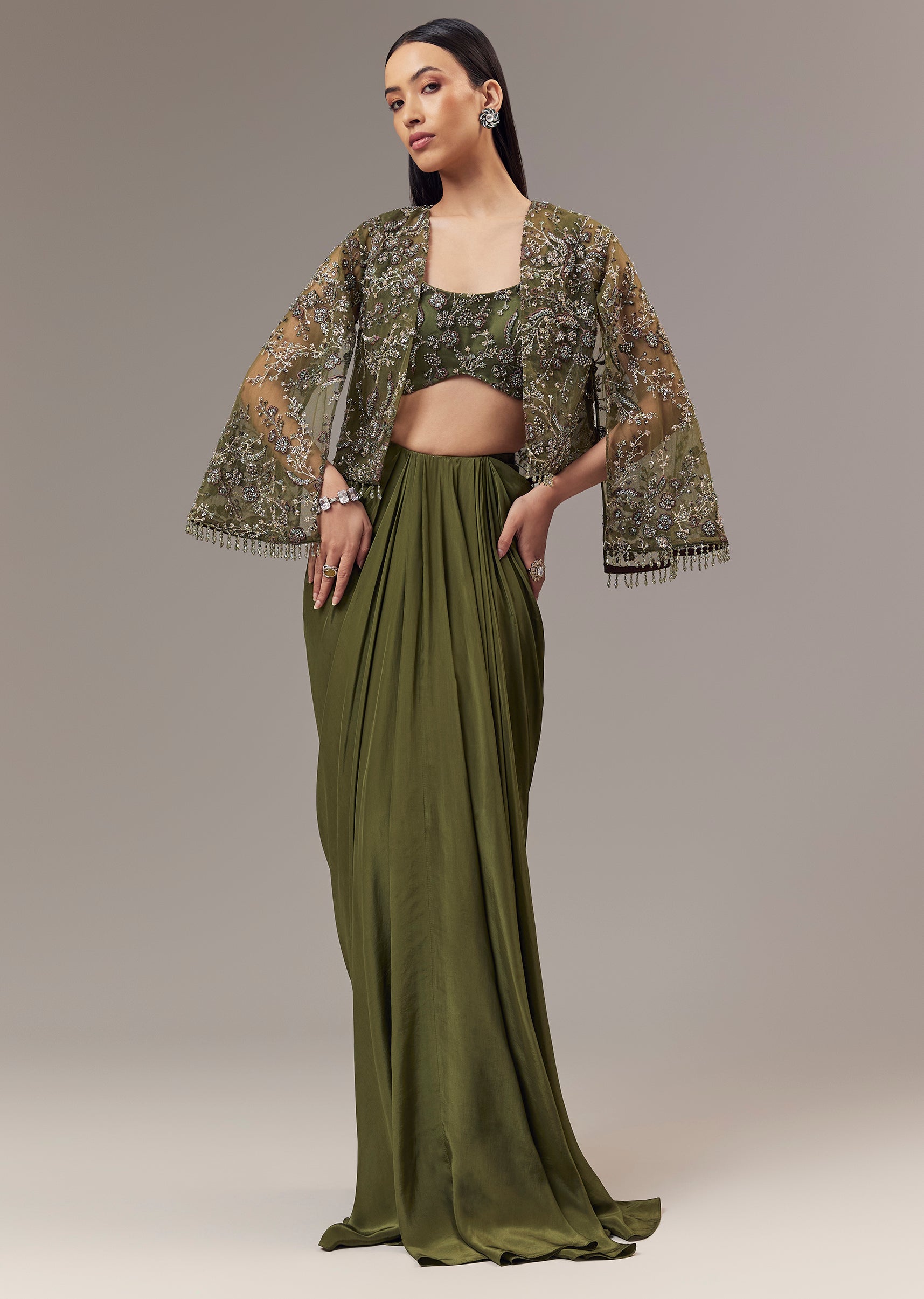 Olive Green Crepe Indo Western Crop Top And Draped Skirt Set With Cape