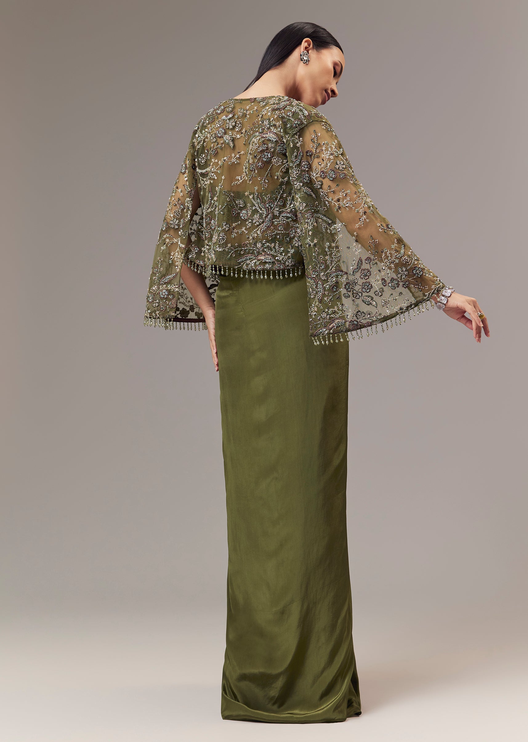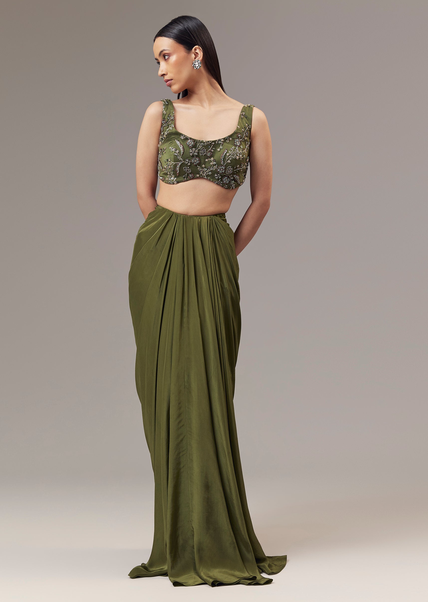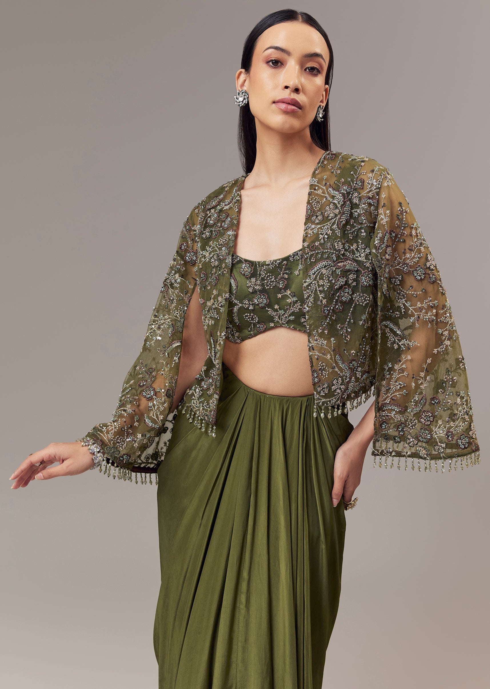 Olive Green Crepe Indo Western Crop Top And Draped Skirt Set With Cape