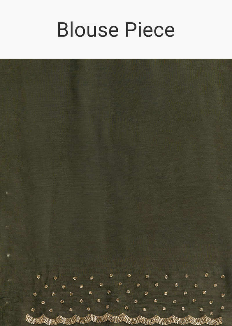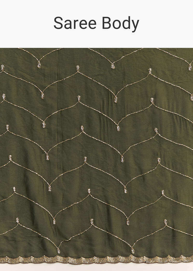 Olive Green Embroidered Chinon Saree With Scallop Border