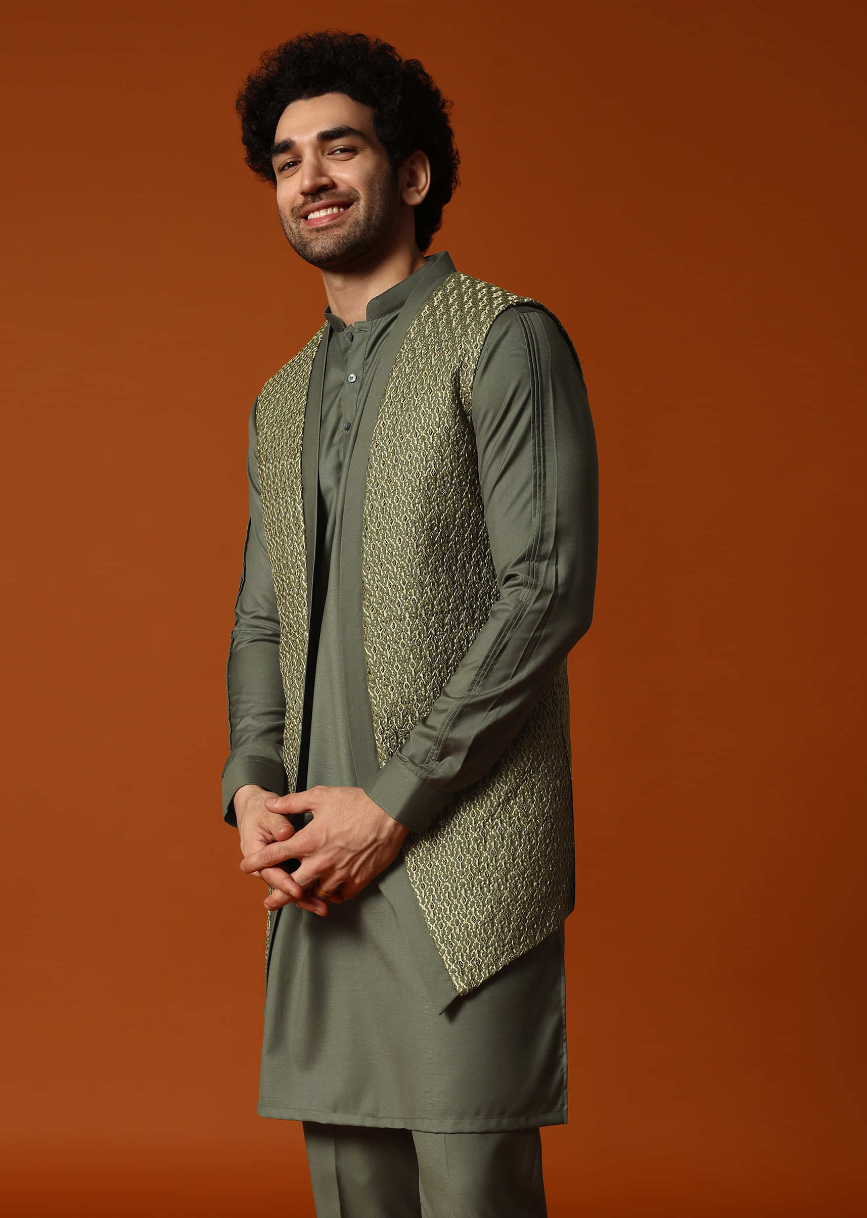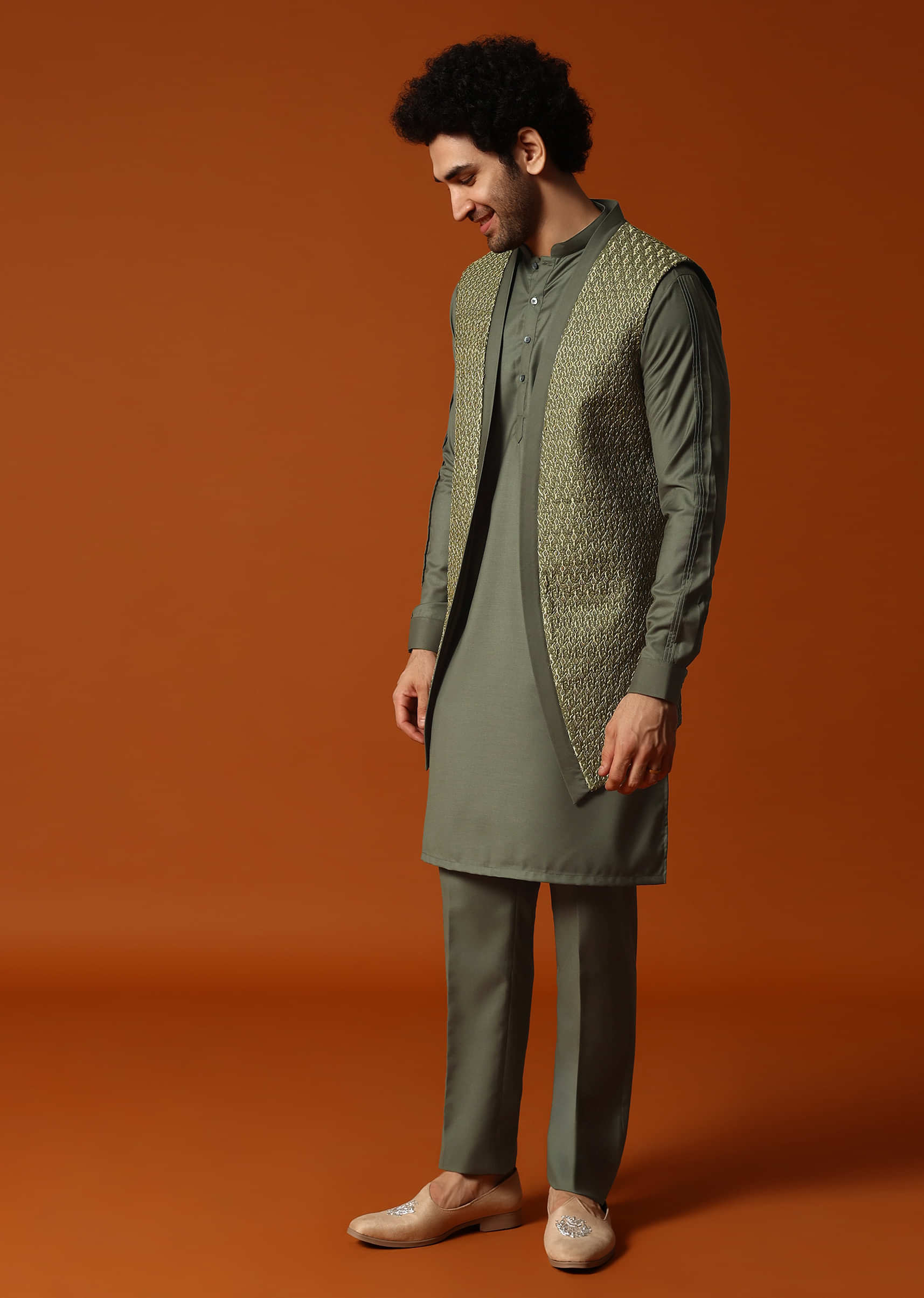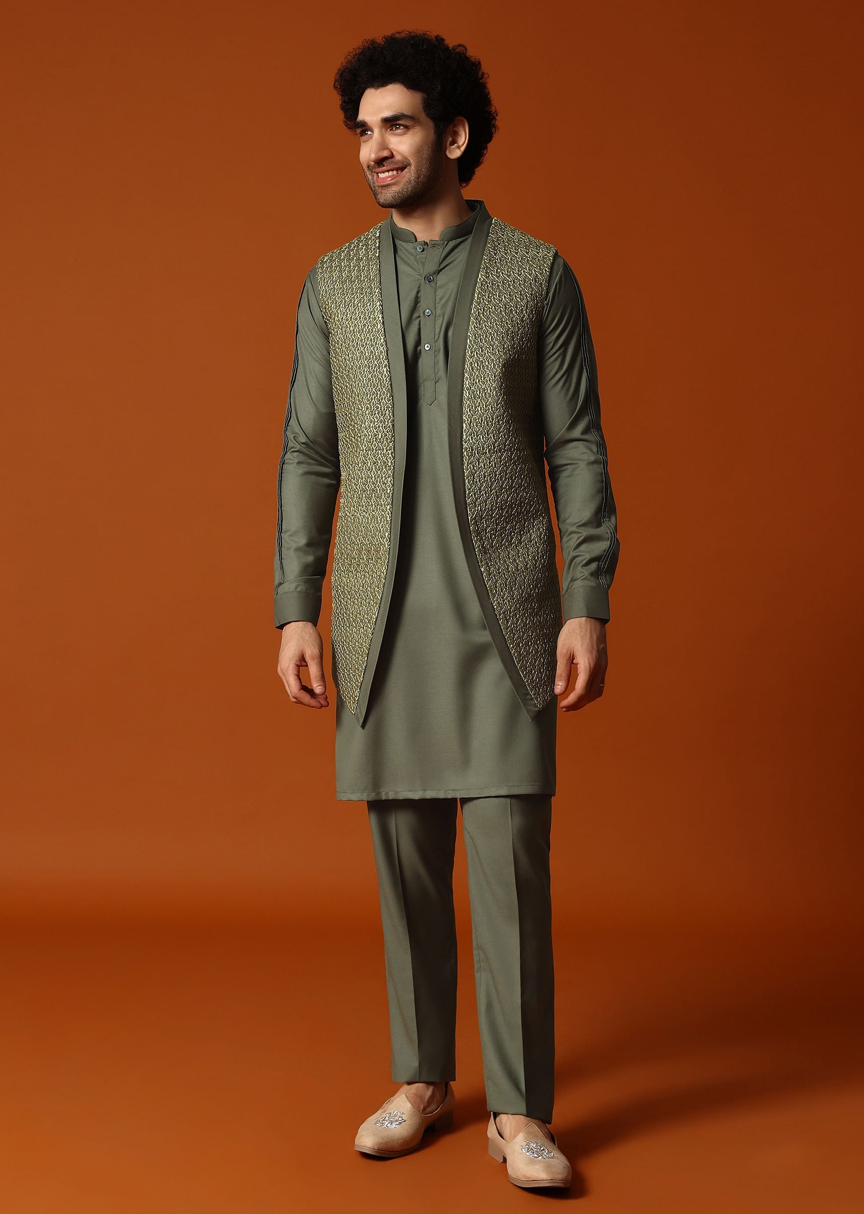 - Indulge in ultimate luxury with our olive green kurta jacket set, ideal for sangeet and wedding occasions.