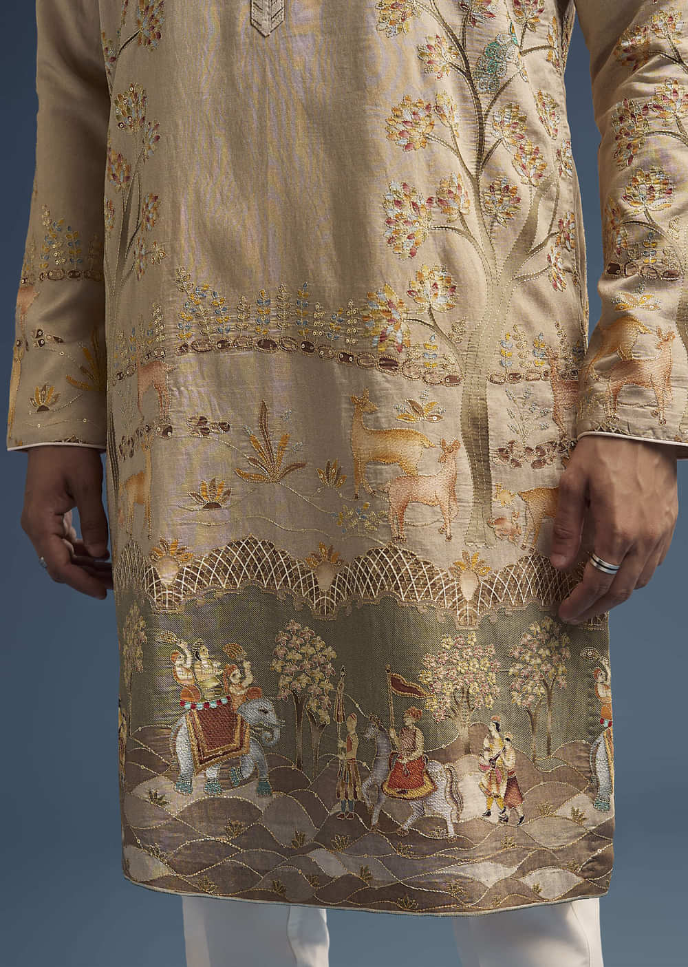 Olive green feels fresh and eye-catching, and this silk kurta set for men brings Mughal-inspired digital prints to life. Stylish without effort, it makes for a festive look that works... More Product Details