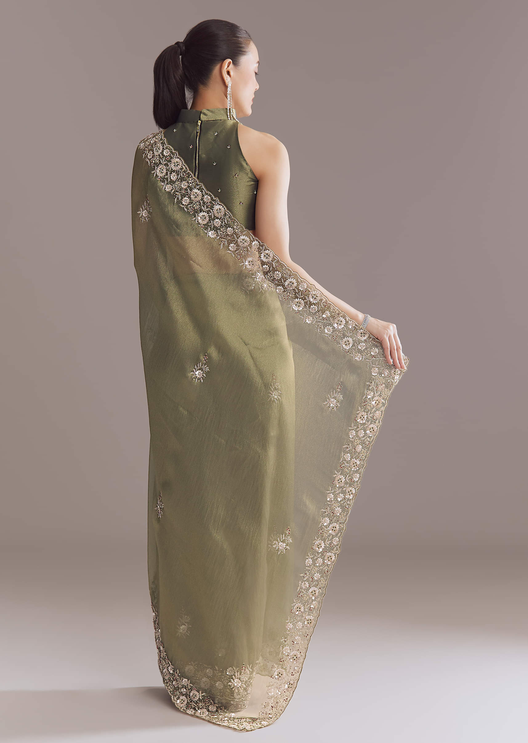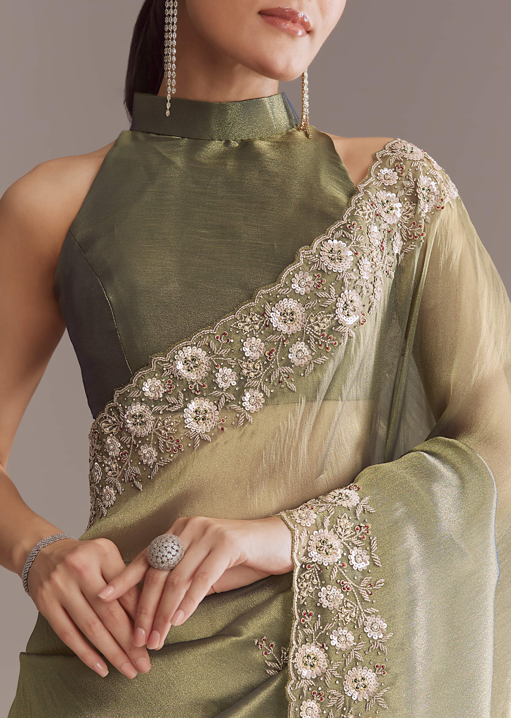Olive Green Tissue Saree With Zari And Stone Embroidery