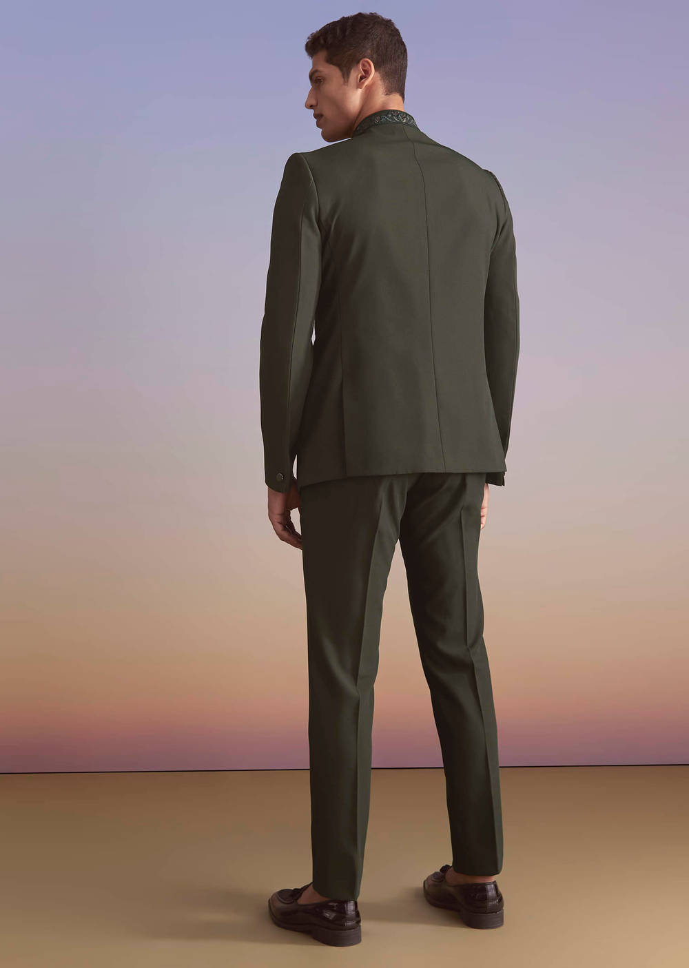 Refined and easy to style, this olive jodhpuri suit in suiting fabric places slim resham lines where light naturally lands near the collar and front. The colour reads grounded and... More Product Details