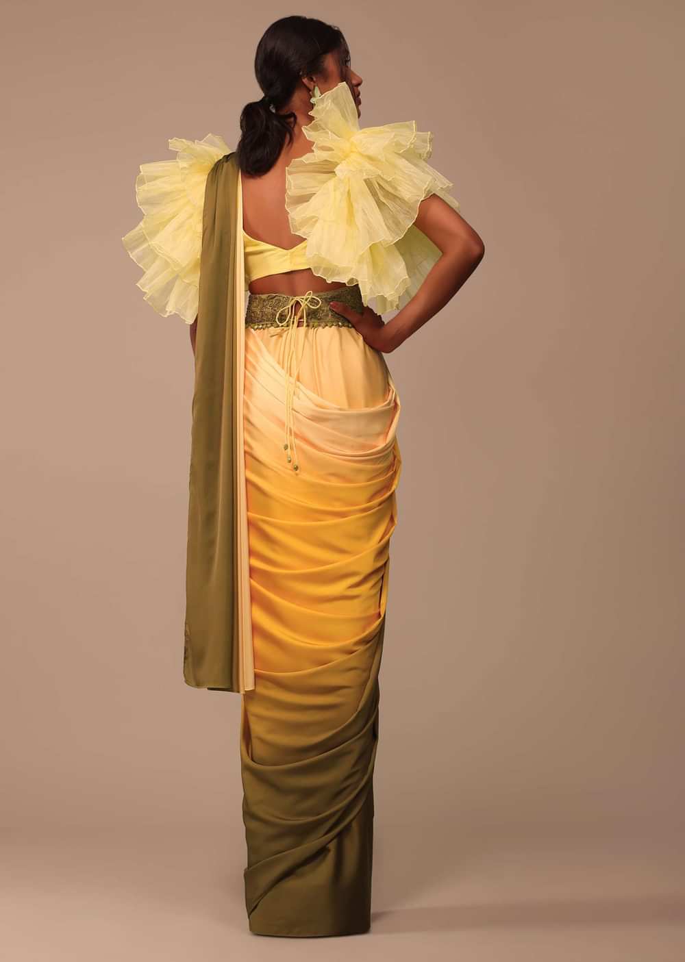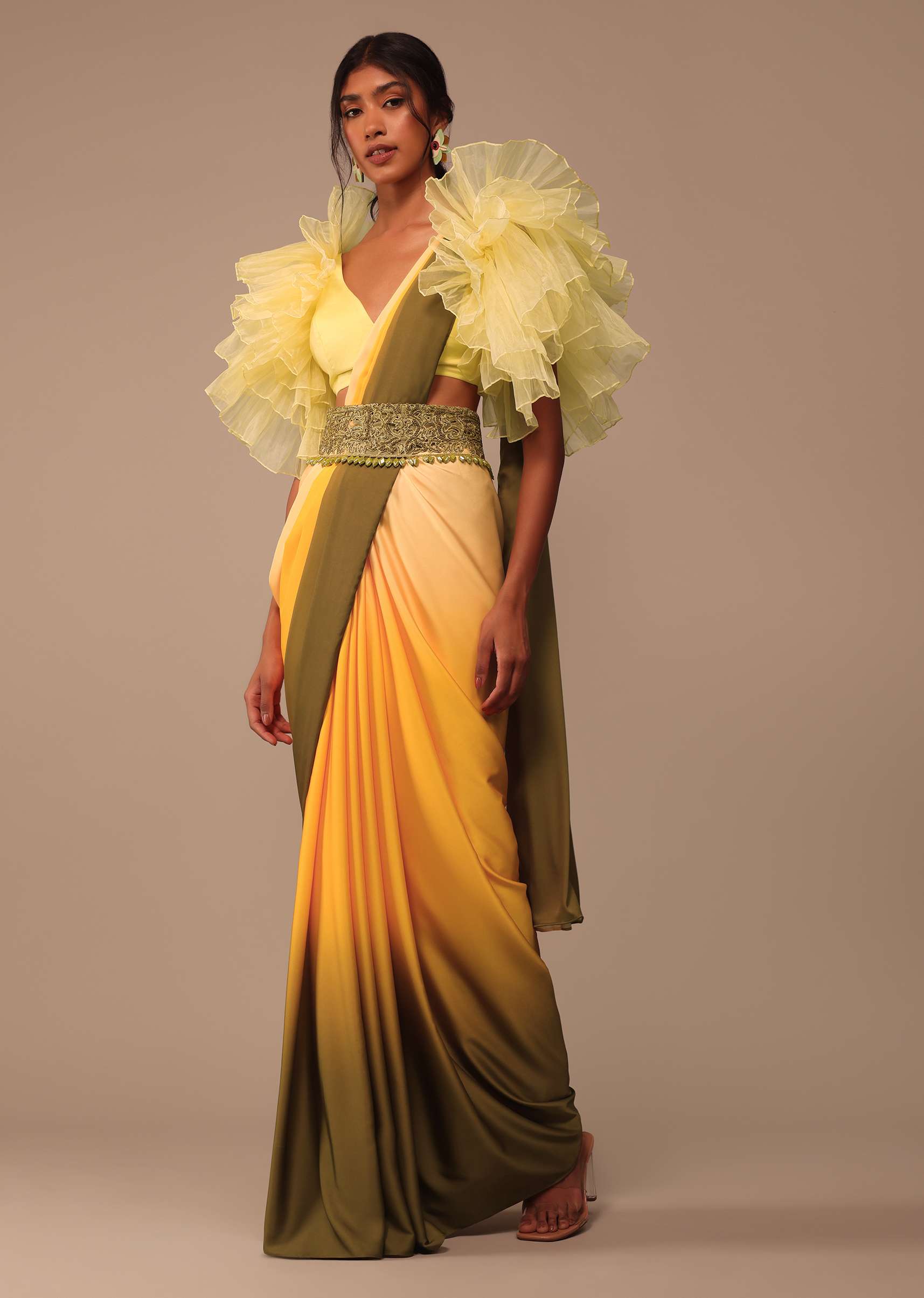 Unveil your enchanting charm with our ombre yellow satin saree. The blouse is a true showstopper with its fancy organza sleeves and V-neckline. The belt steals the spotlight with its exquisite cutdana cut work embroidery.EVENT - Perfect for cocktail parties festive celebrations and special occasions. Awarded as the Most Trusted Brand, we're delivering styles you love, just as promised.