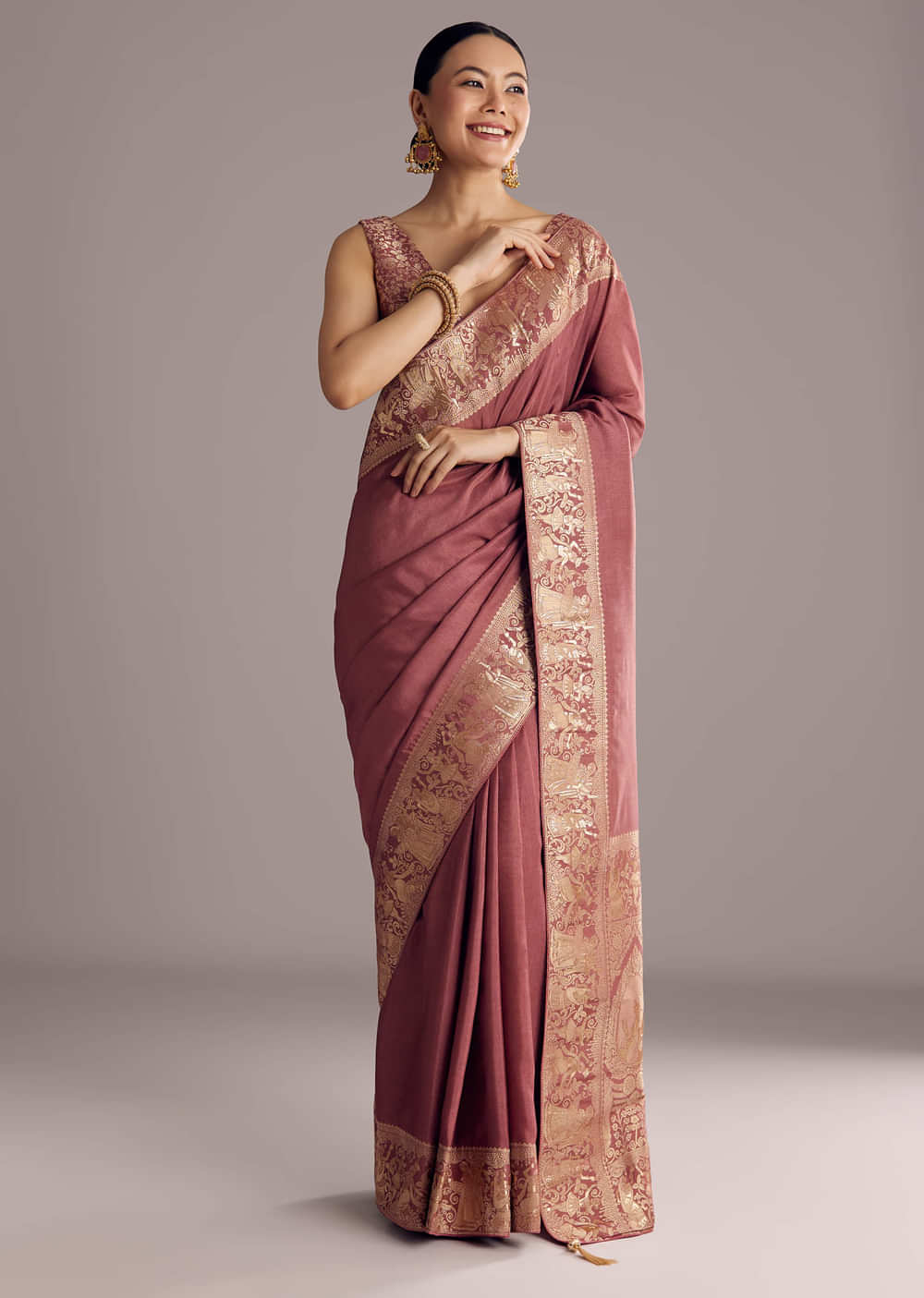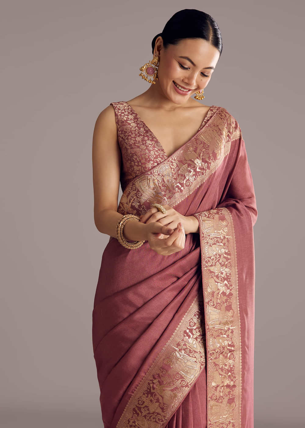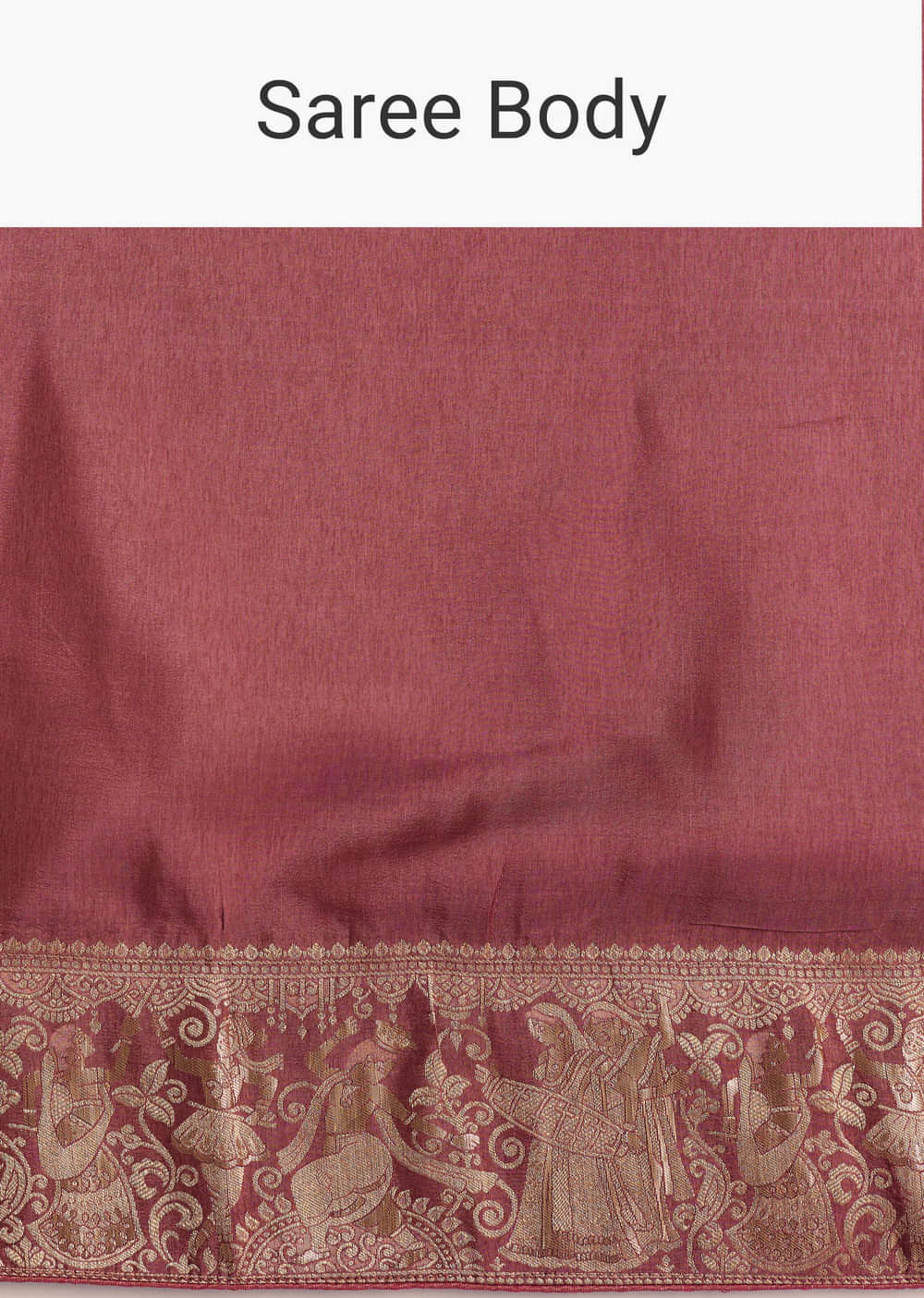 Delicately radiant in a soft onion pink hue, this Dola silk saree brings heritage to life with intricate zari-woven figure motifs adorning the pallu and border. Its subtle shimmer and refined craftsmanship make it a graceful choice for weddings, poojas, or festive occasions, ideal for those who appreciate quiet luxury and cultural depth. Awarded as the Most Trusted Brand, we're delivering styles you love, just as promised.
