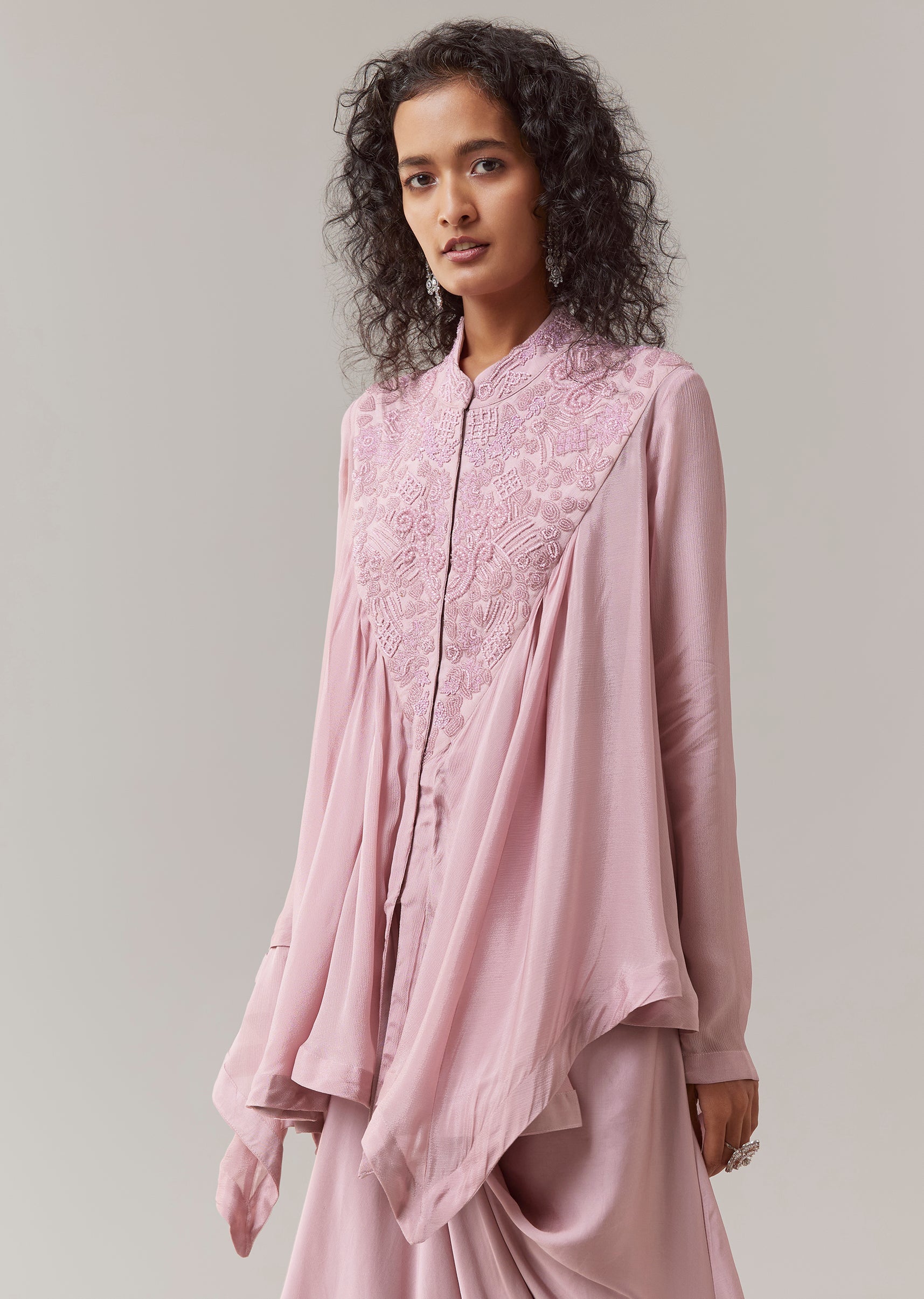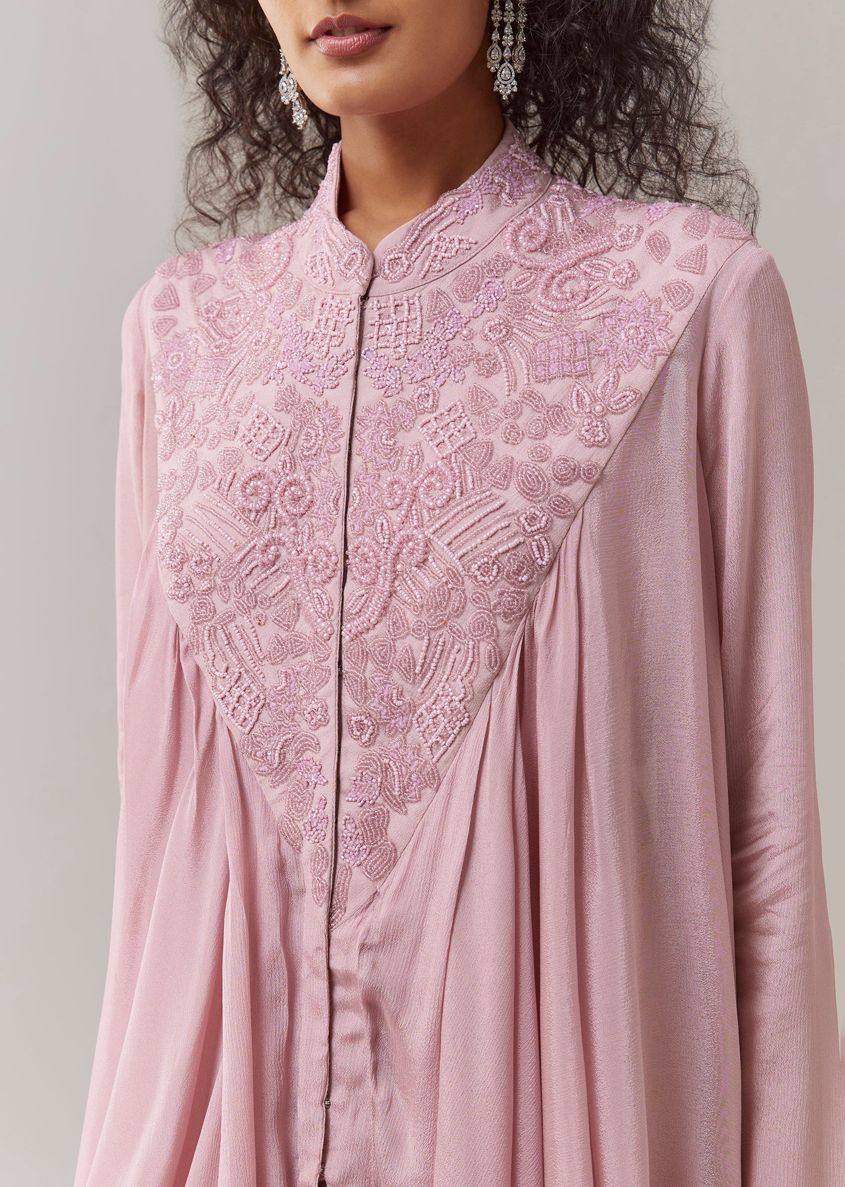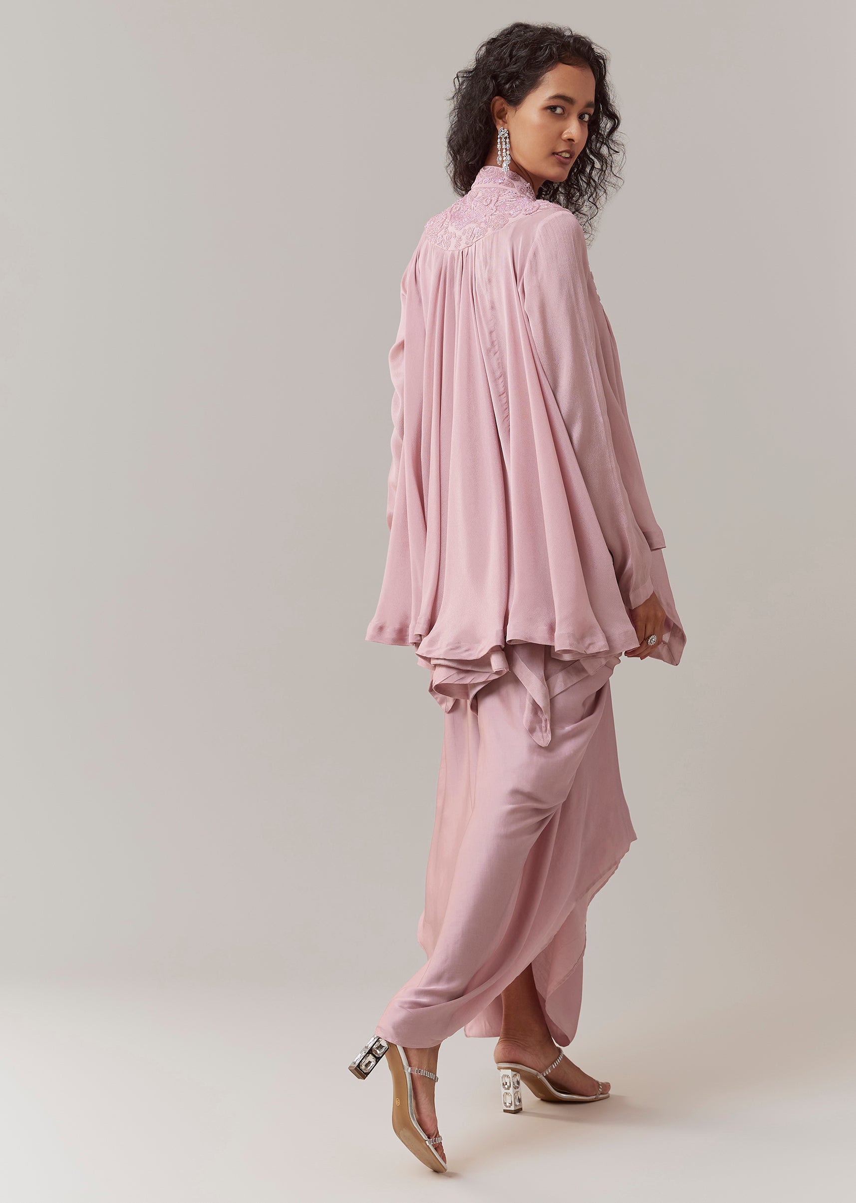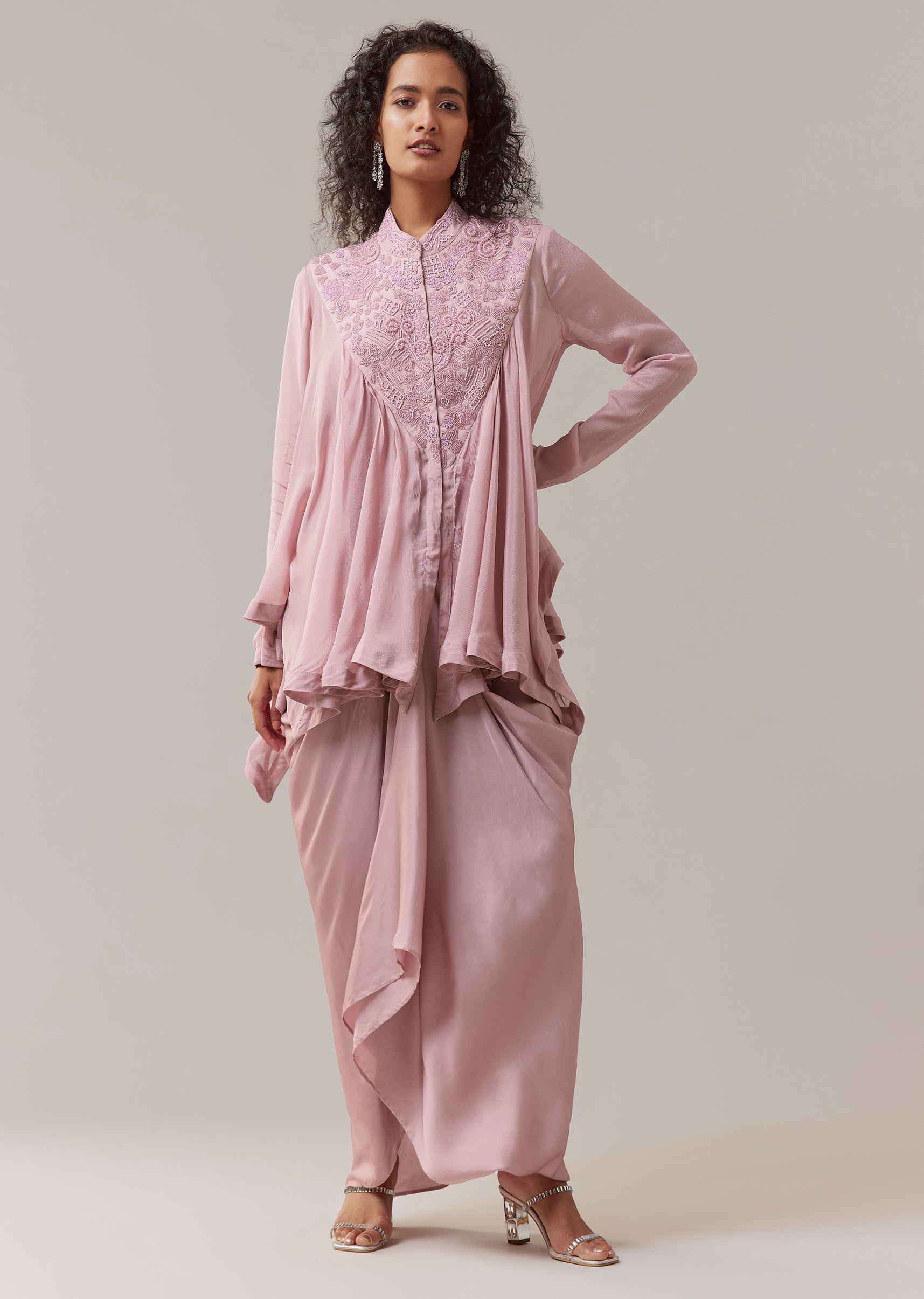 Statement making and elegant, this beads work cape style top set is designed for contemporary festive dressing. Crafted in rich satin with flowing chinon layers, the cape style top features... More Product Details