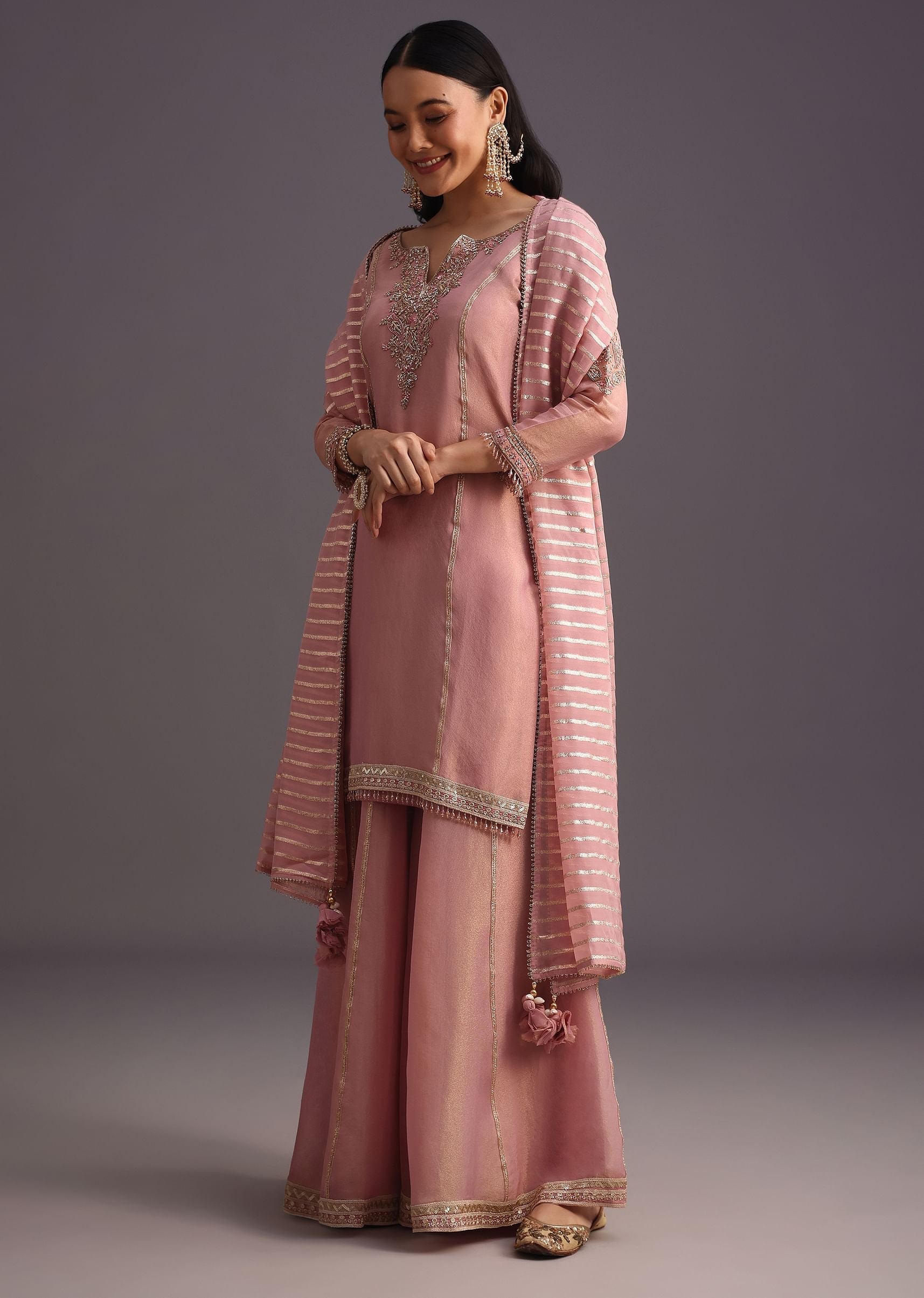 Indulge in the ethereal beauty of this onion pink kurta and palazzo set. The intricate gotta patti work, combined with the delicate cut dana and sequin embellishments on the neckline,... More Product Details