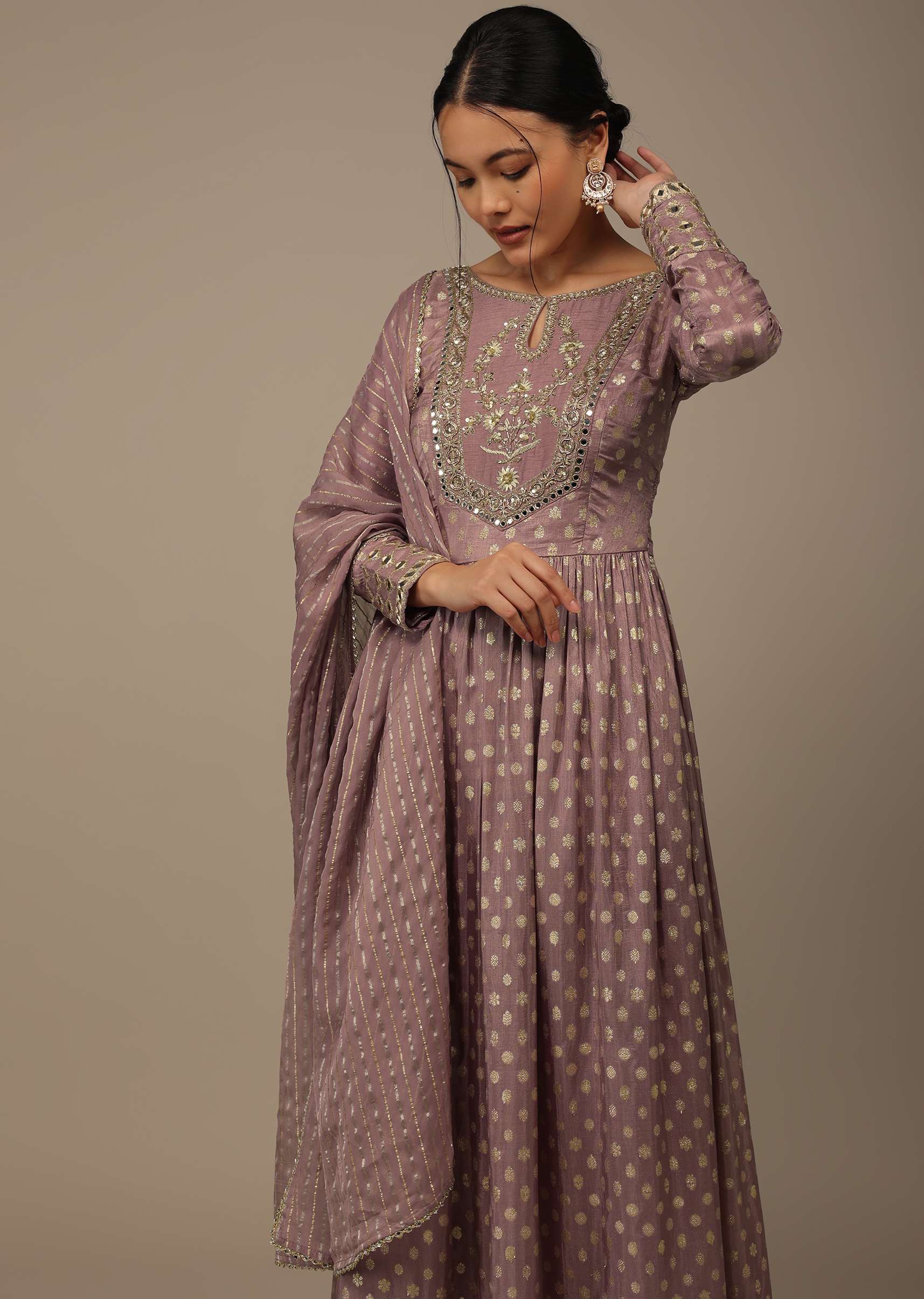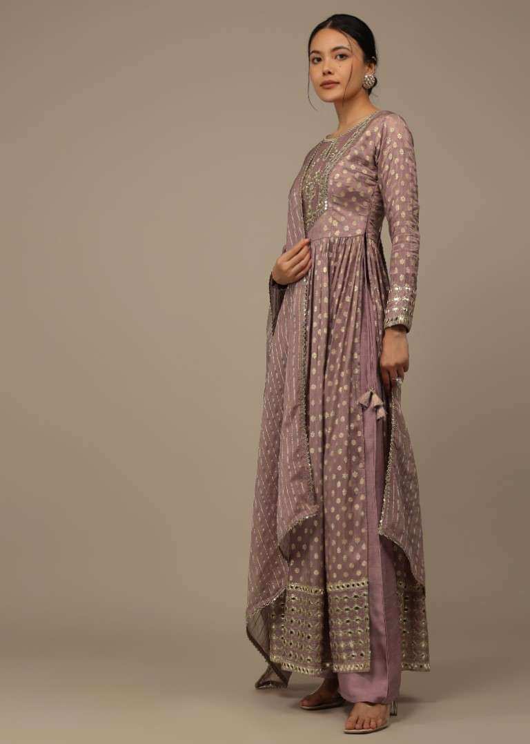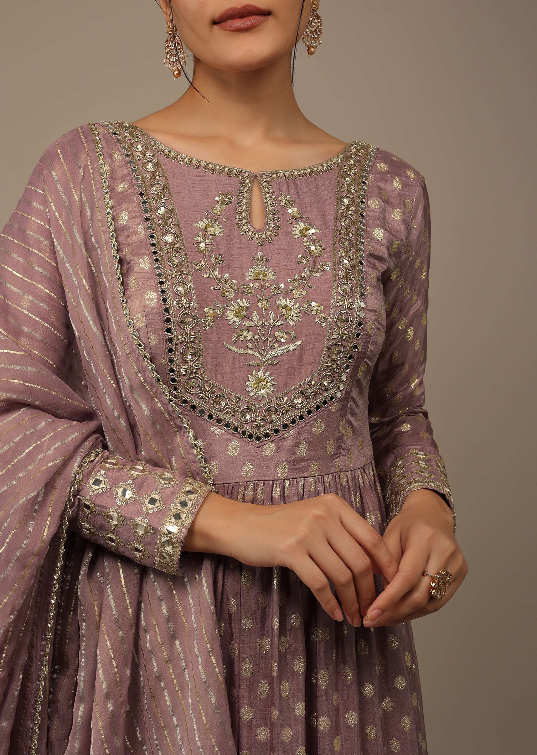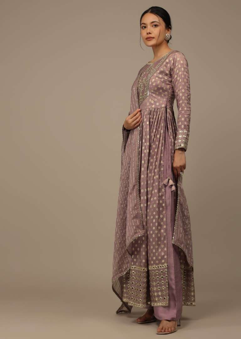 Onion Pink Embroidered Palazzo Suit Set In Banarasi Brocade Silk