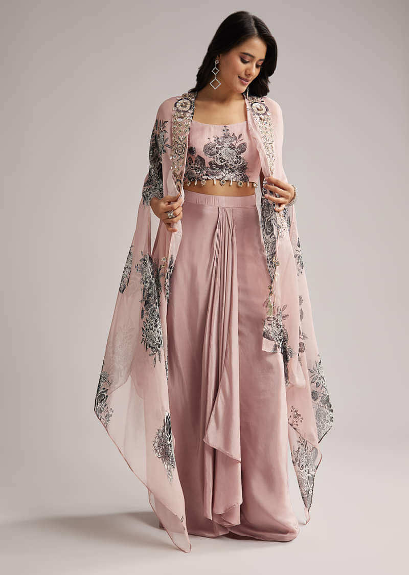 Floral printed crop top paired with a flowy skirt and an organza cape in soft onion pink, crafted for all things festive. The pastel palette and breezy fabric whisper elegance... More Product Details