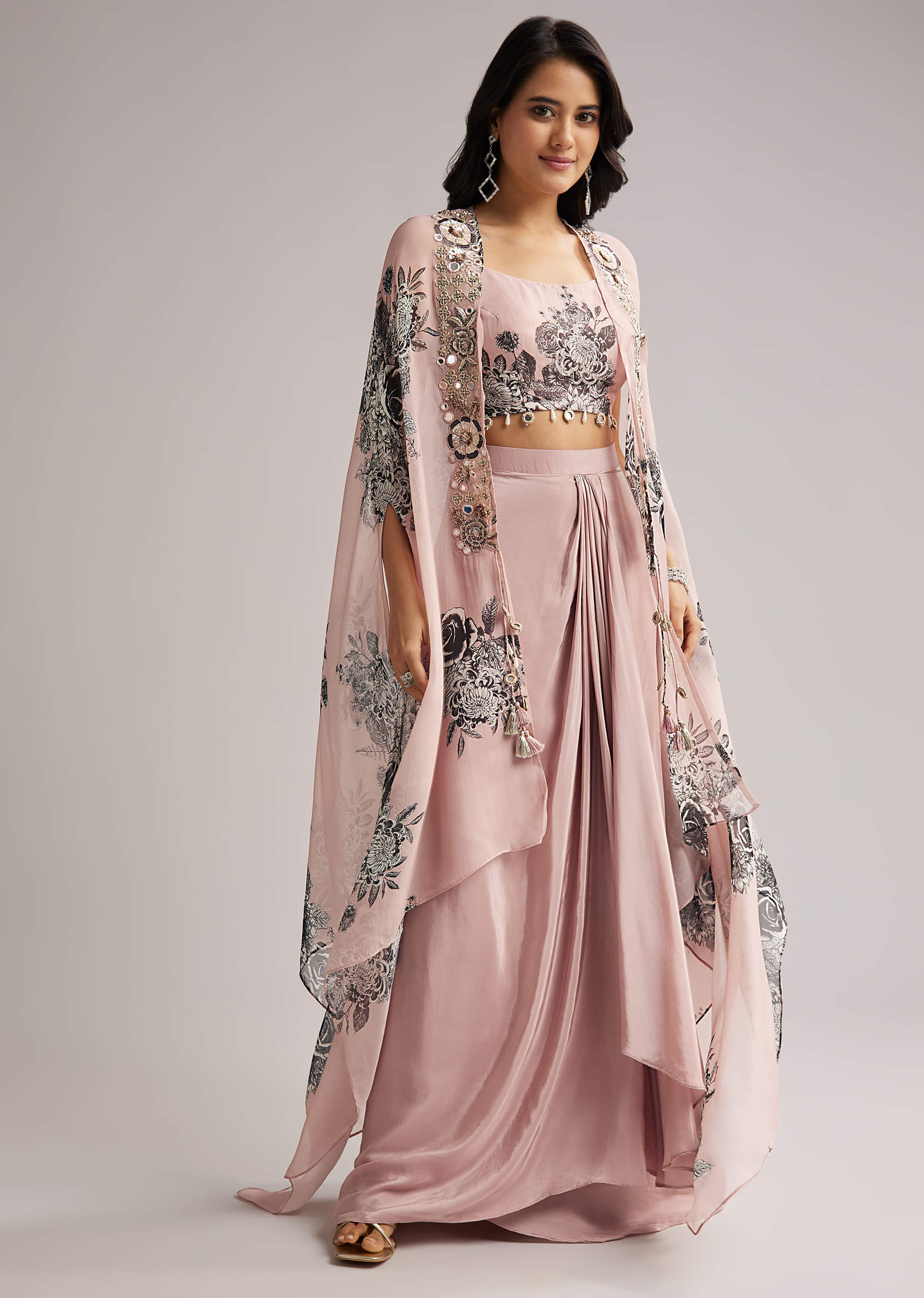 Onion Pink Floral Cape Set With Crop Top And Skirt