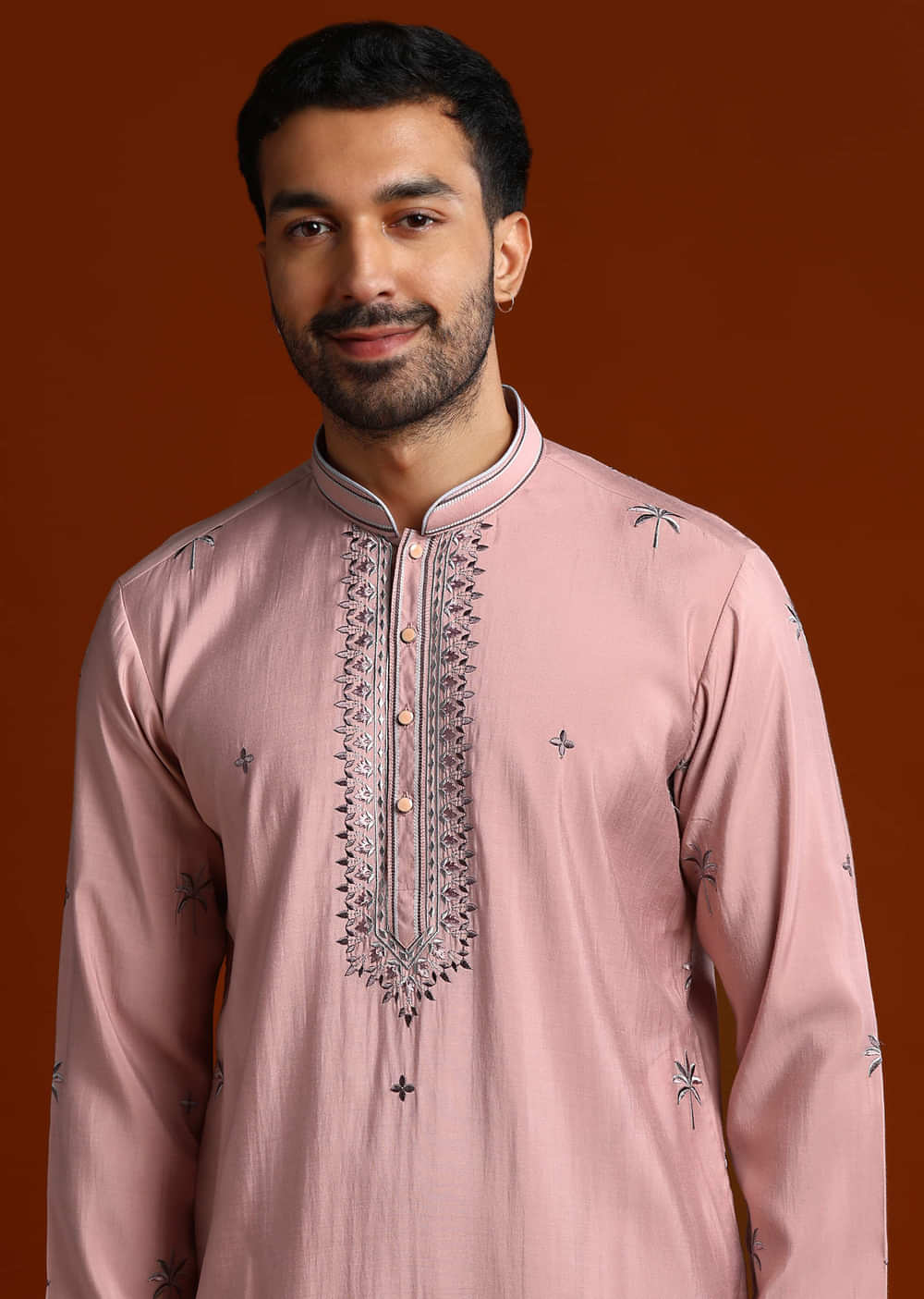 For mehendi evenings, this onion pink poly silk men’s kurta set puts fine thread work across a smooth, lightly glossy base. The colour reads soft in person and rich in... More Product Details