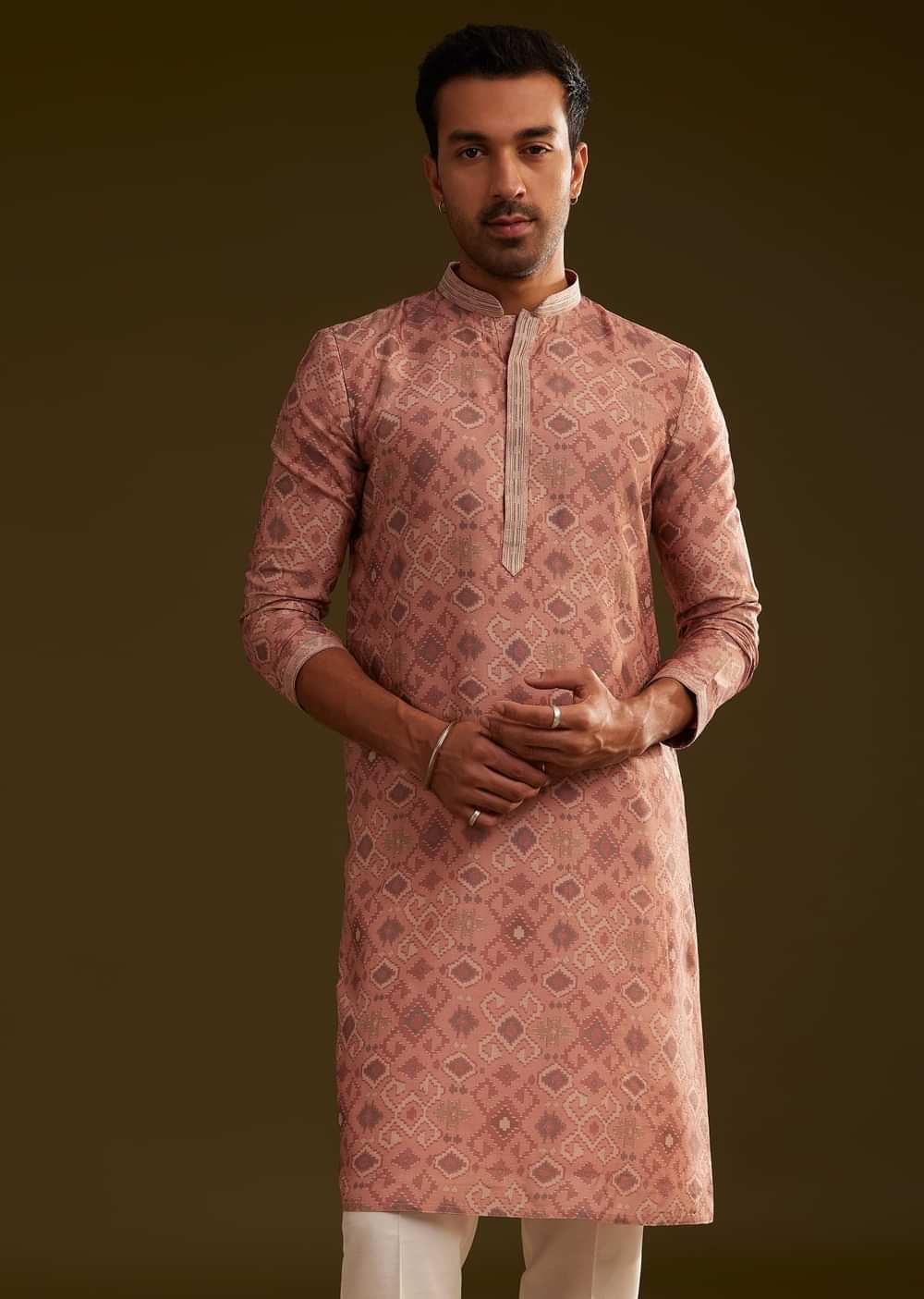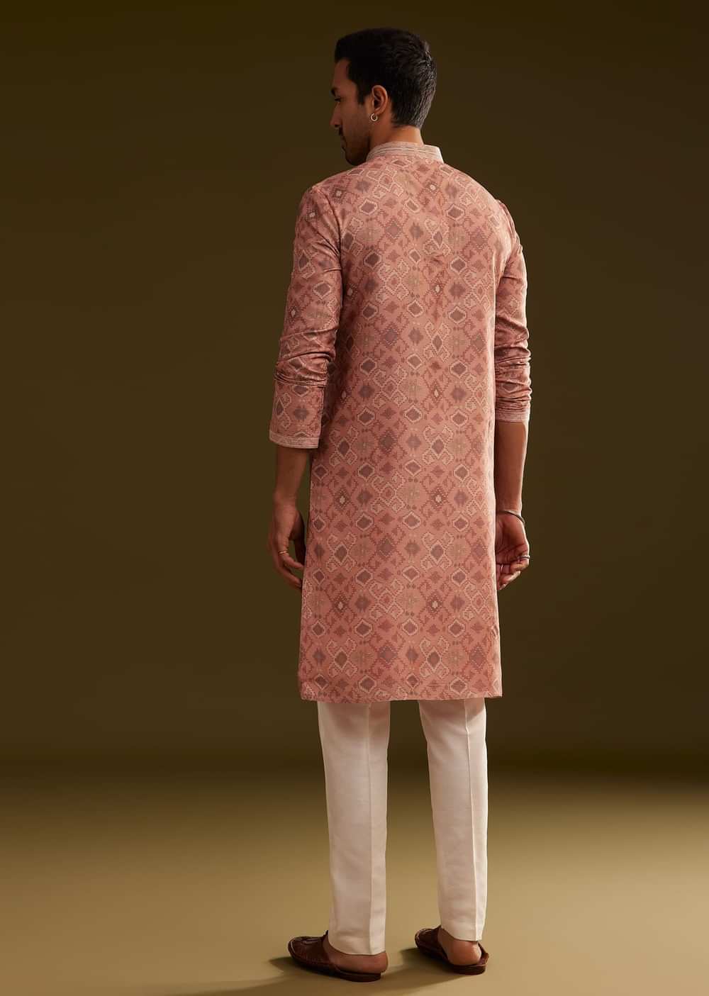 Elevate your style with this onion pink kurta set, featuring an intricate geometric print that exudes contemporary charm. Crafted from silk viscose, the kurta showcases a subtle sheen, adding a luxurious touch to the soft pink hue. The geometric patterns bring a modern twist to the traditional silhouette, creating a sophisticated look perfect for festive gatherings and cultural events. This kurta set beautifully combines elegance and style with a modern flair. Awarded as the Most Trusted Brand, we're delivering styles you love, just as promised.