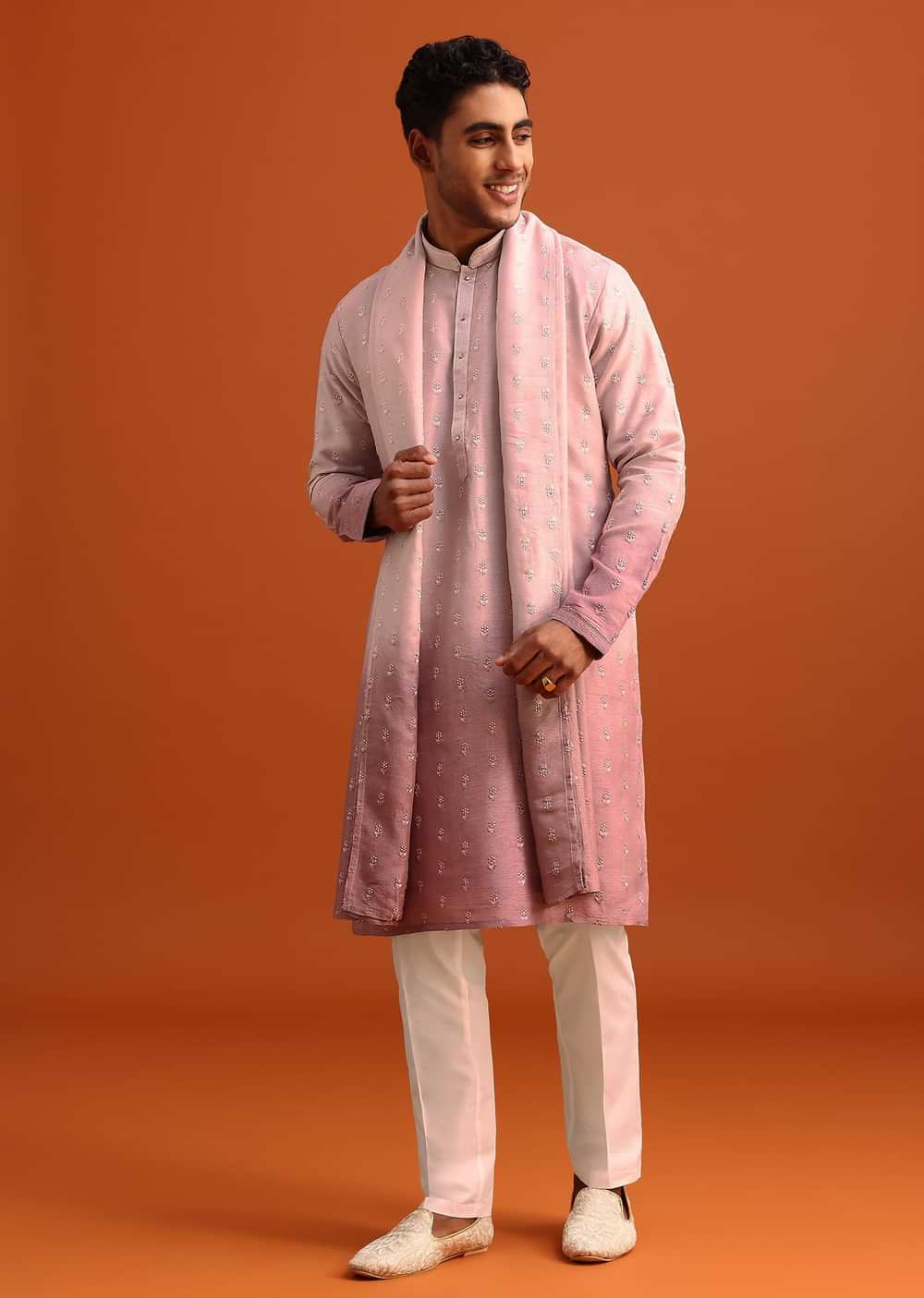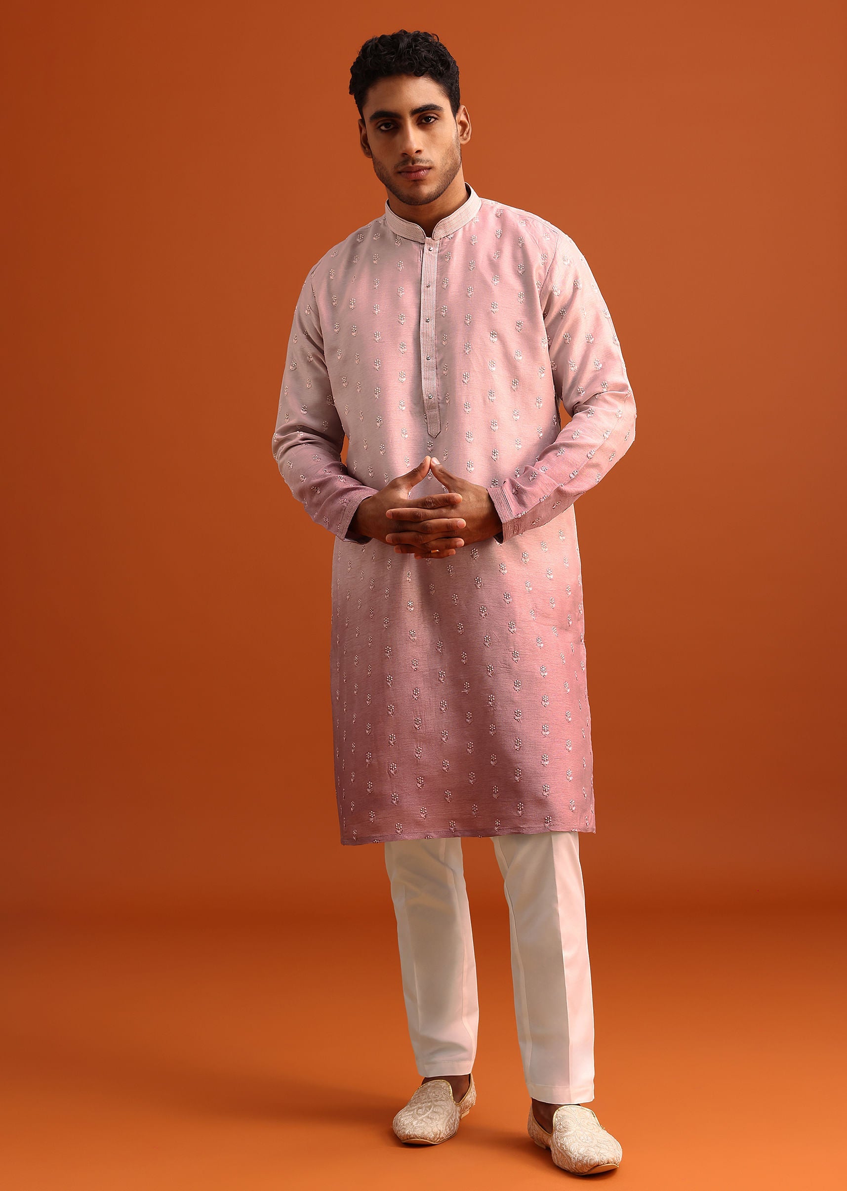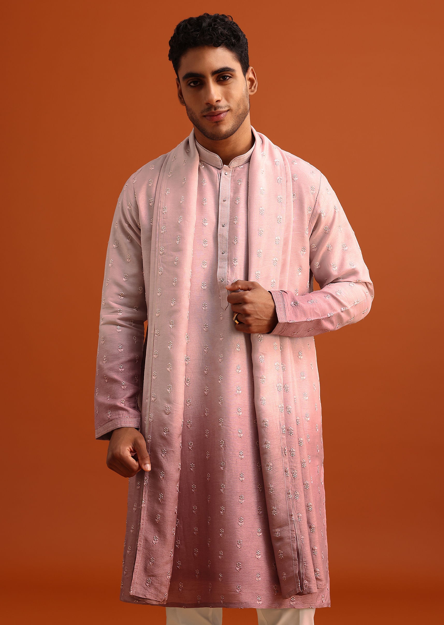 Onion Pink Ombre Kurta Set In Raw Silk With Butti Work