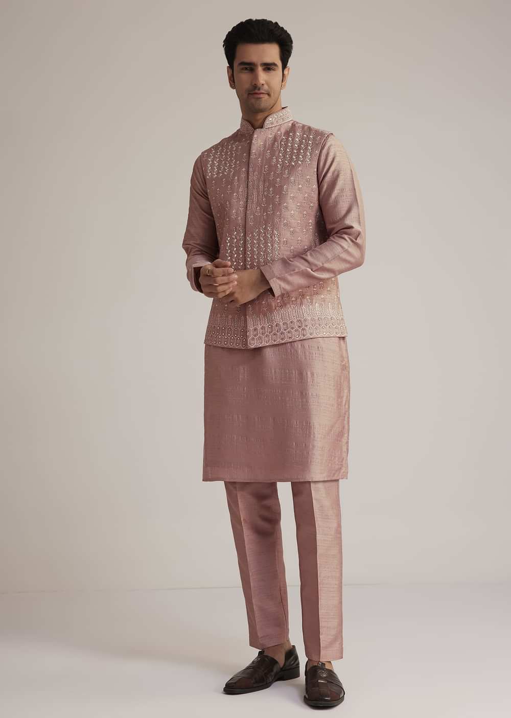 Elevate Your Festive Wardrobe With This Onion Pink Raw Silk Kurta Set, Complemented By A Nehru Jacket Adorned With Intricate Thread, Zari, And Mirror Work. The Delicate Embellishments Bring A... More Product Details