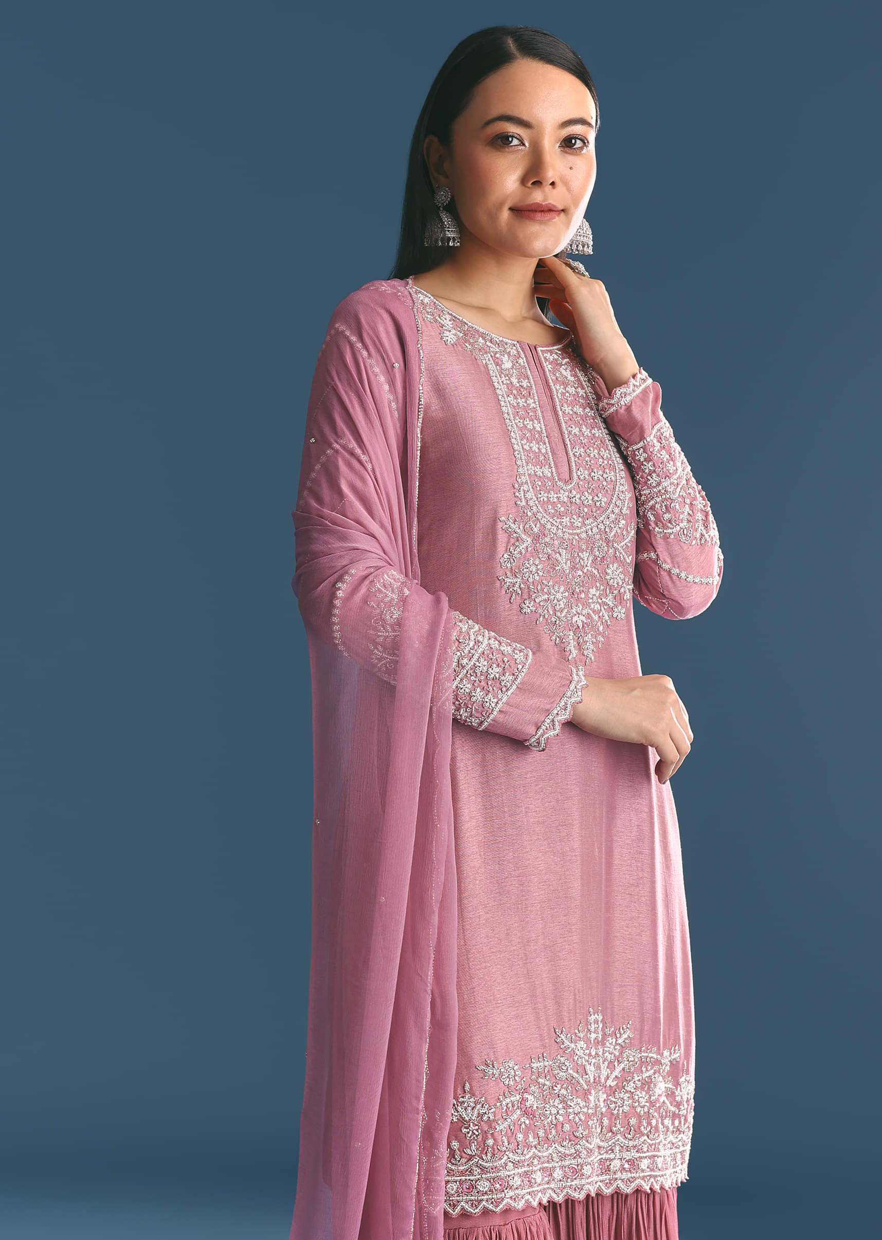 Onion pink Silk Kurta Sharara Suit With Moti Cutdana Work