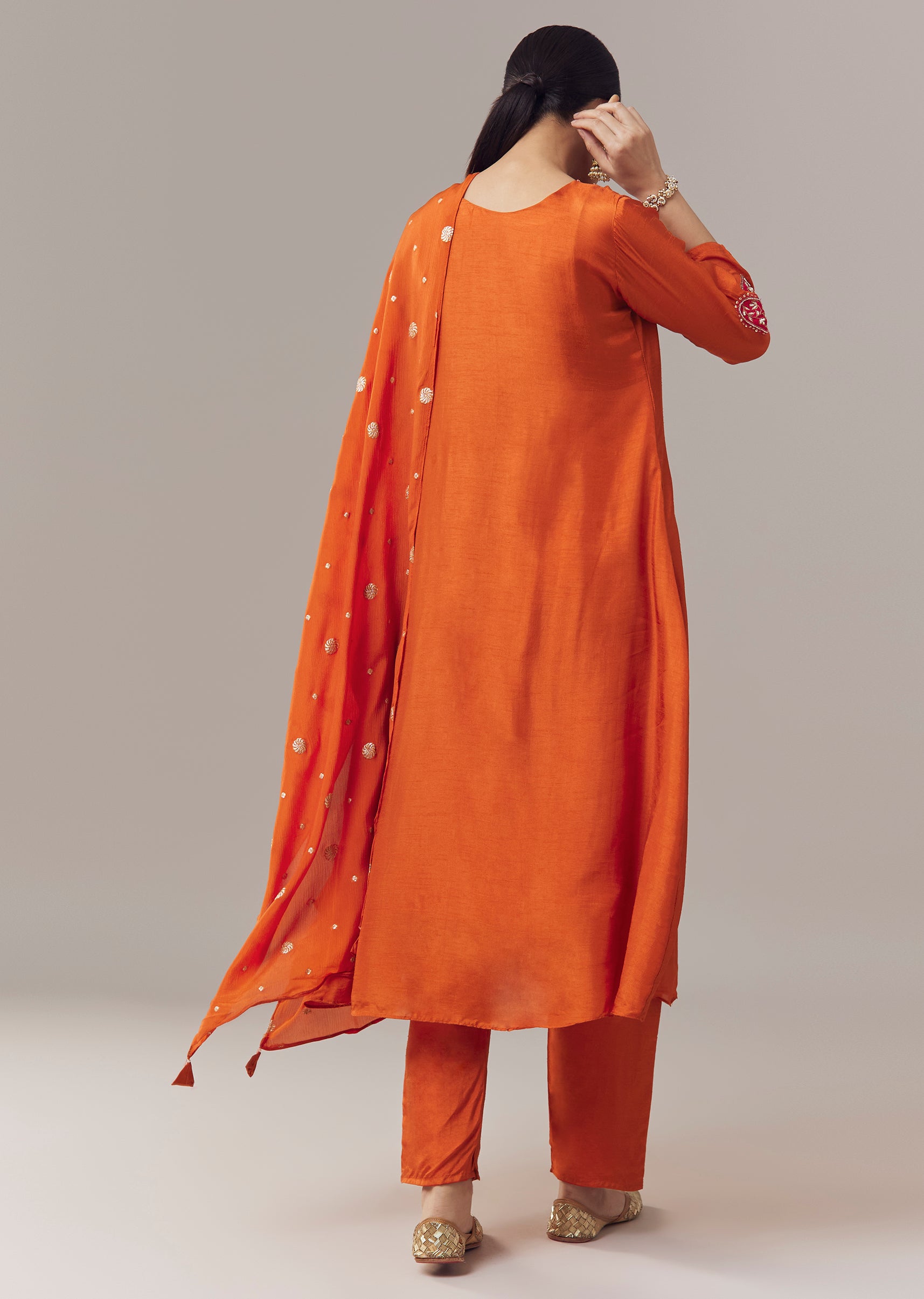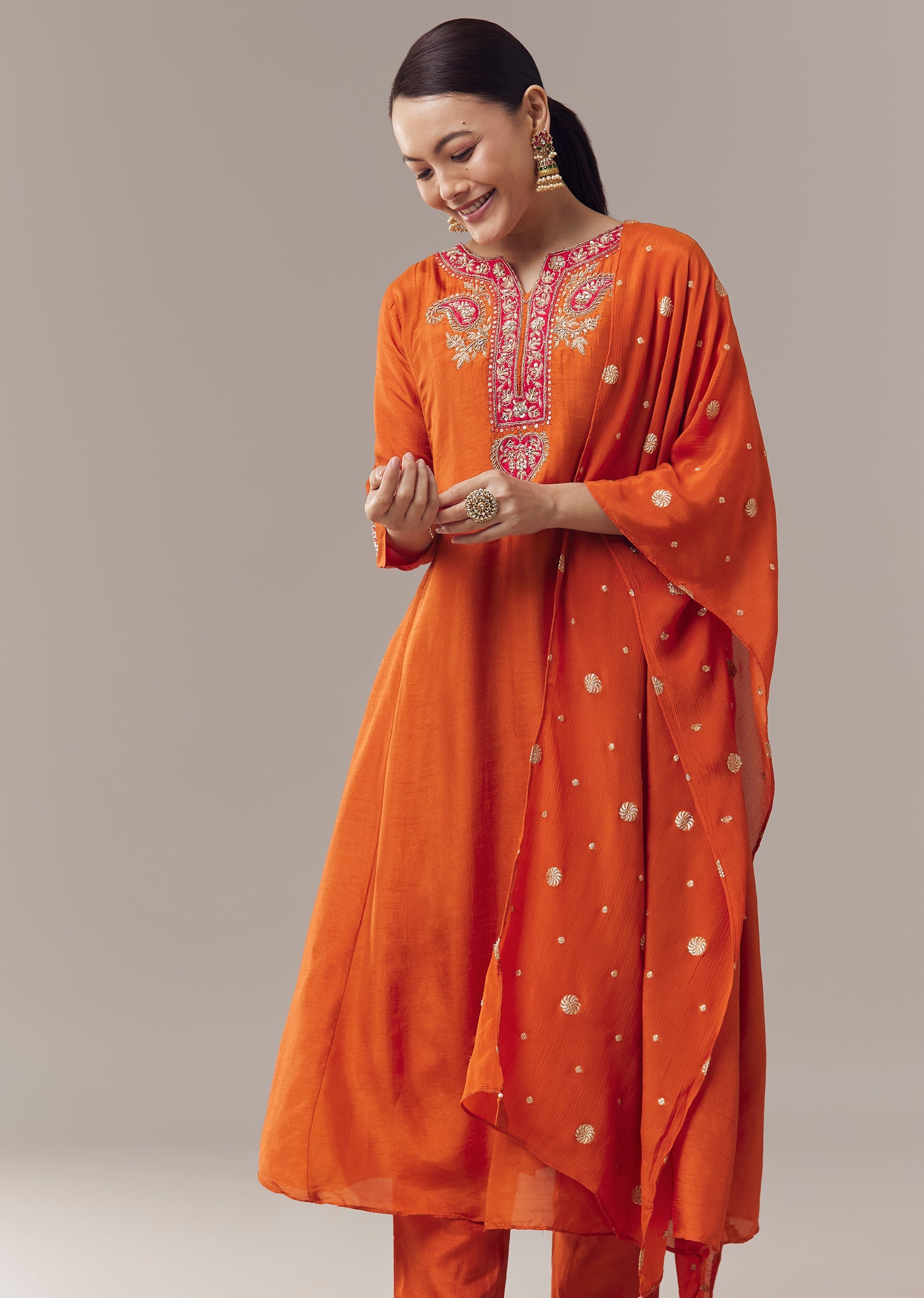 Bright and festive, this orange anarkali is crafted in soft silk fabric for an elegant and comfortable feel. Designed in an a line silhouette, the anarkali is adorned with intricate... More Product Details
