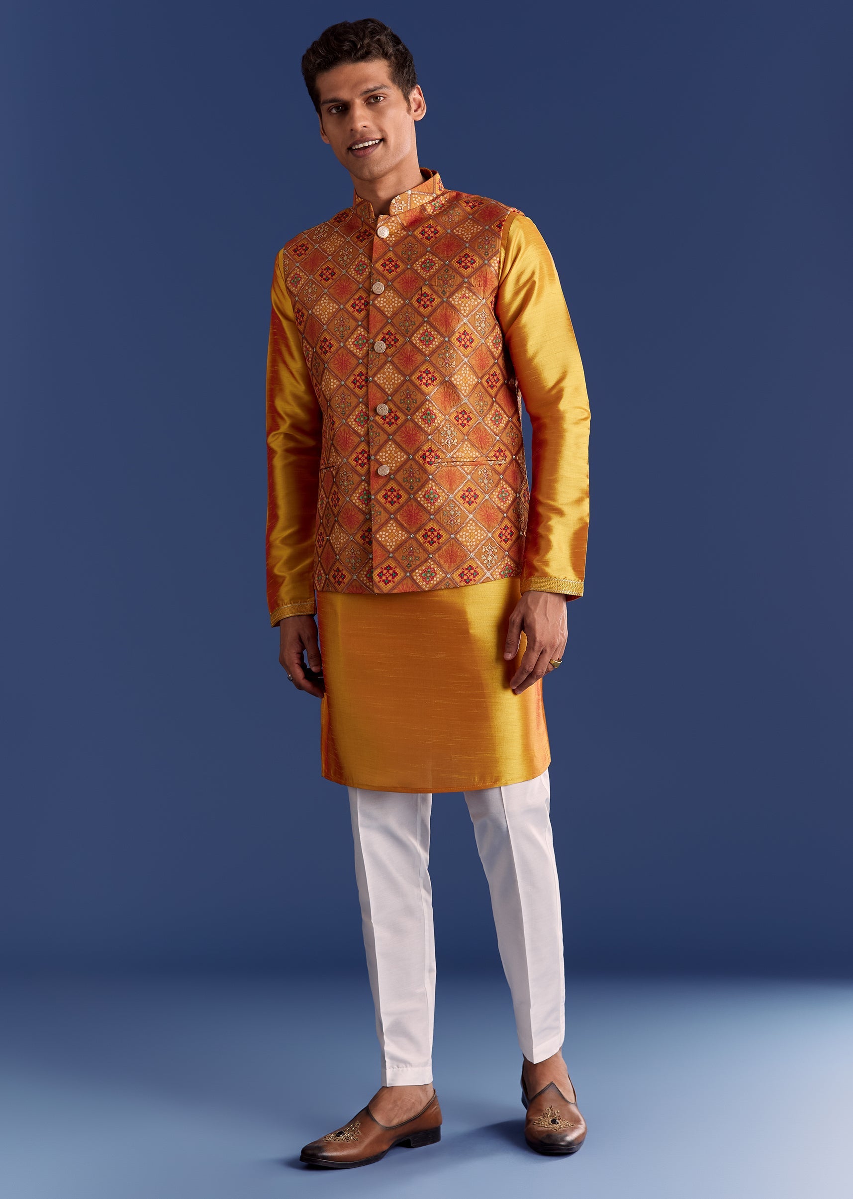 In vibrant orange, this brocade kurta jacket set is printed with a regal pattern, making it a standout piece for high-spirited celebrations. Awarded as the Most Trusted Brand, we're delivering styles you love, just as promised.