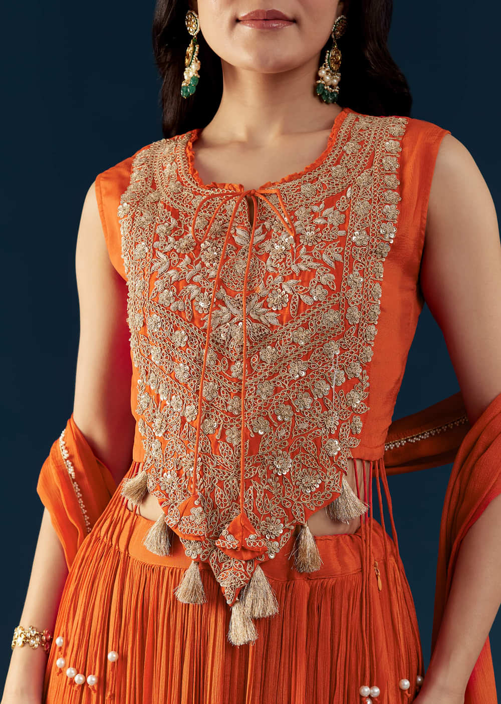 Orange Chinon Crop Top Skirt Set with Zardozi Work