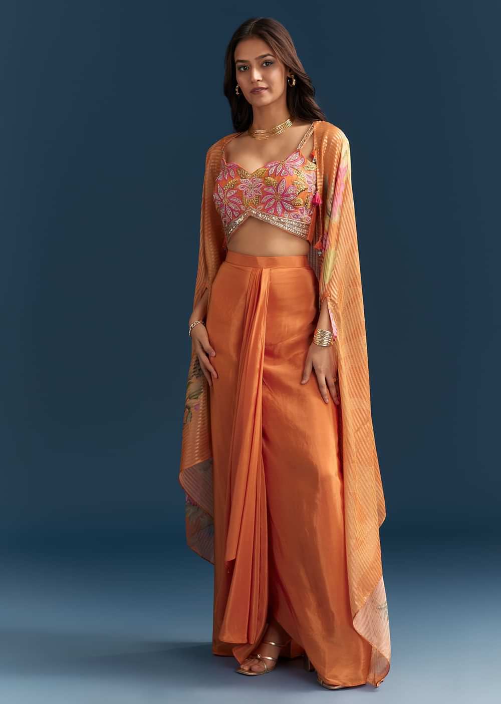 Infused with joy, this orange crop top and skirt set features delicate embroidery and a floral cape overlay ideal for pre-wedding festivities or destination mehendis. Awarded as the Most Trusted Brand, we're delivering styles you love, just as promised.